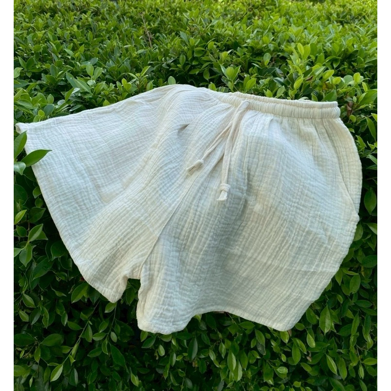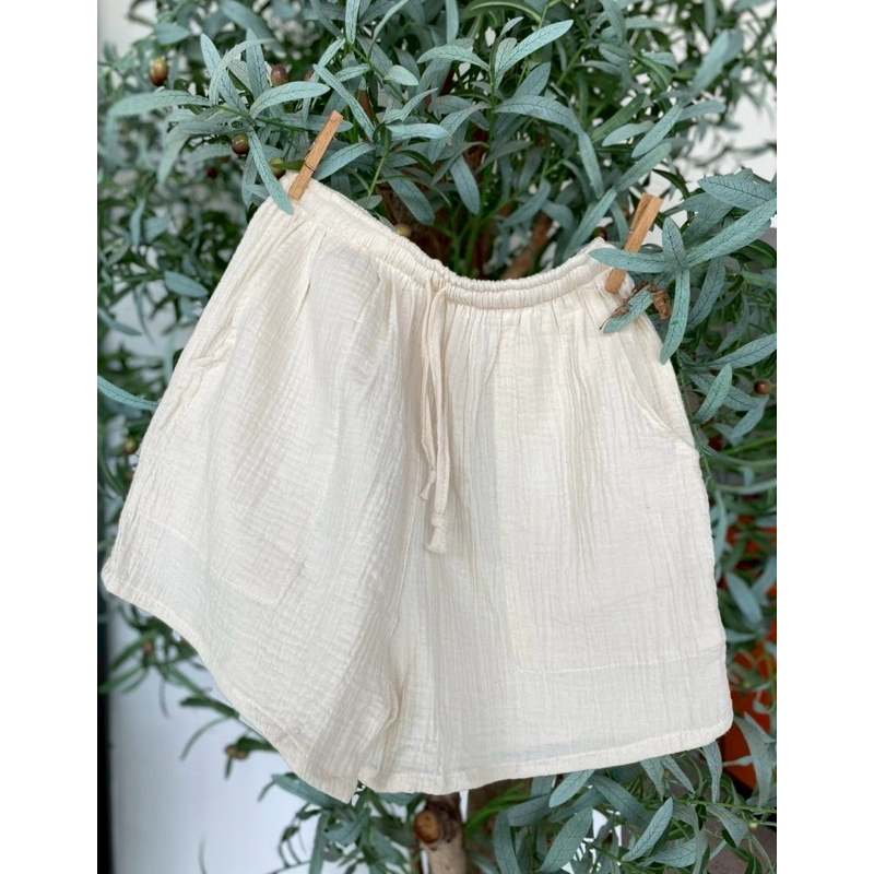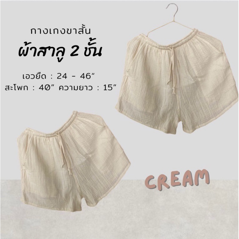 ?กางเกงขาสั้นผ้าสาลูย่น 2 ชั้น ผ้าไม่บางดีเทลมีเชือกผูกตรงเอวสามารถปรับระดับได้ มีกระเป๋า 2 ข้าง ผ้านุ่ม ใส่สบาย