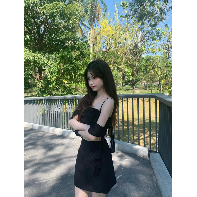 Milin – BLACK ???✨(ML-BLACK) เสื้อสายเดี่ยวระบายชีฟอง กับกระโปรงเอวสูง แถมยางมัดผมด้วยนะคะ