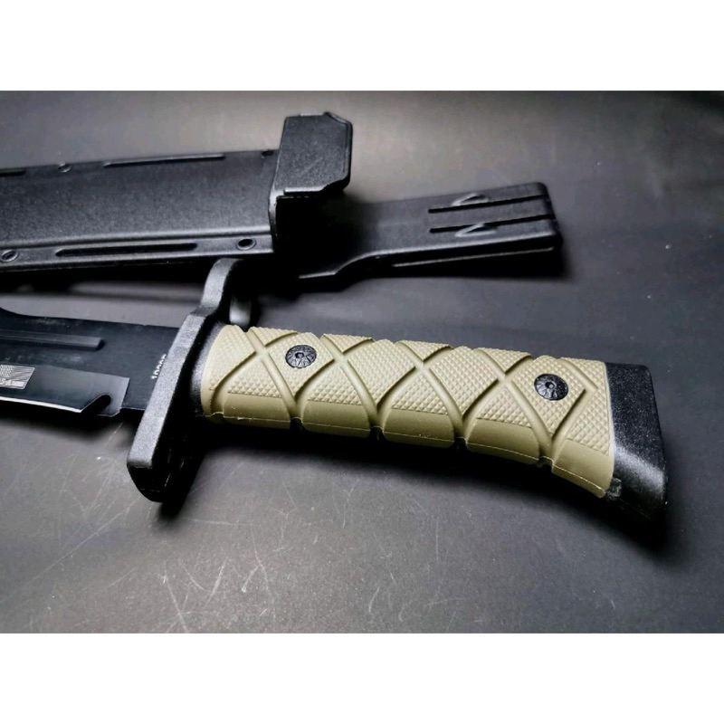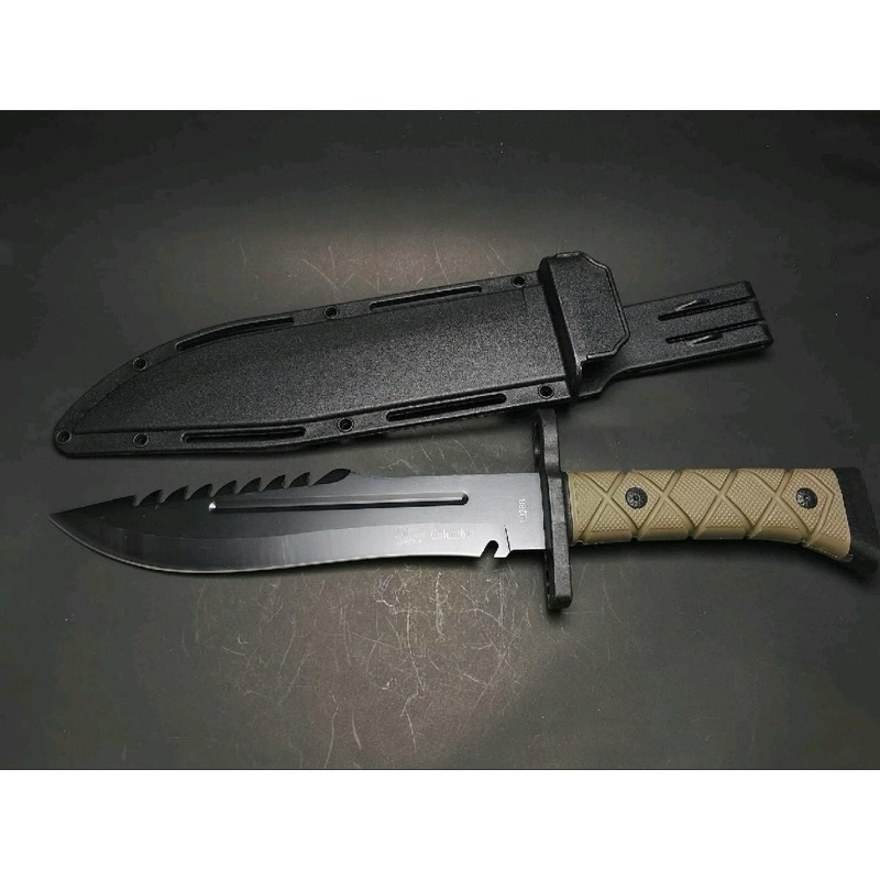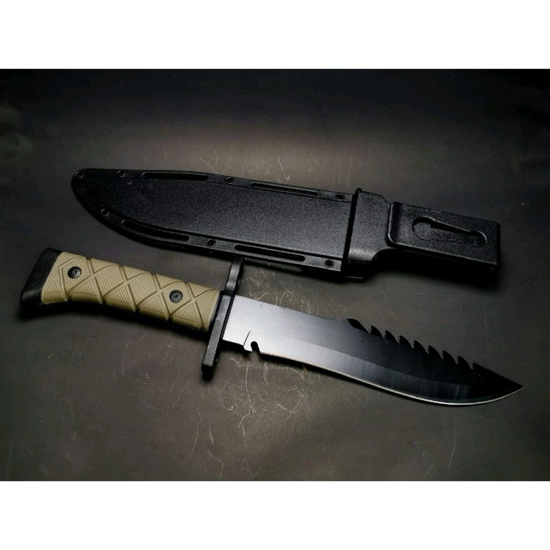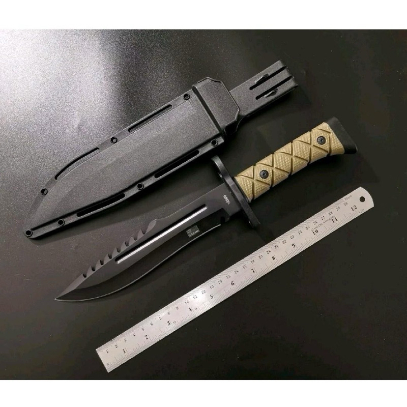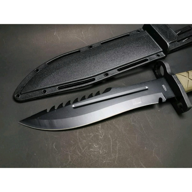 มีด เดินป่า 1918B ใบดำ ซองแข็ง ด้ามสีทราย ใบ 8 นิ้ว ซองเหน็บชุดเกราะ/เข็มขัด ด้ามยางกันลื่นสีทราย เซาะร่องเหงื่อ ออกกำลังกาย