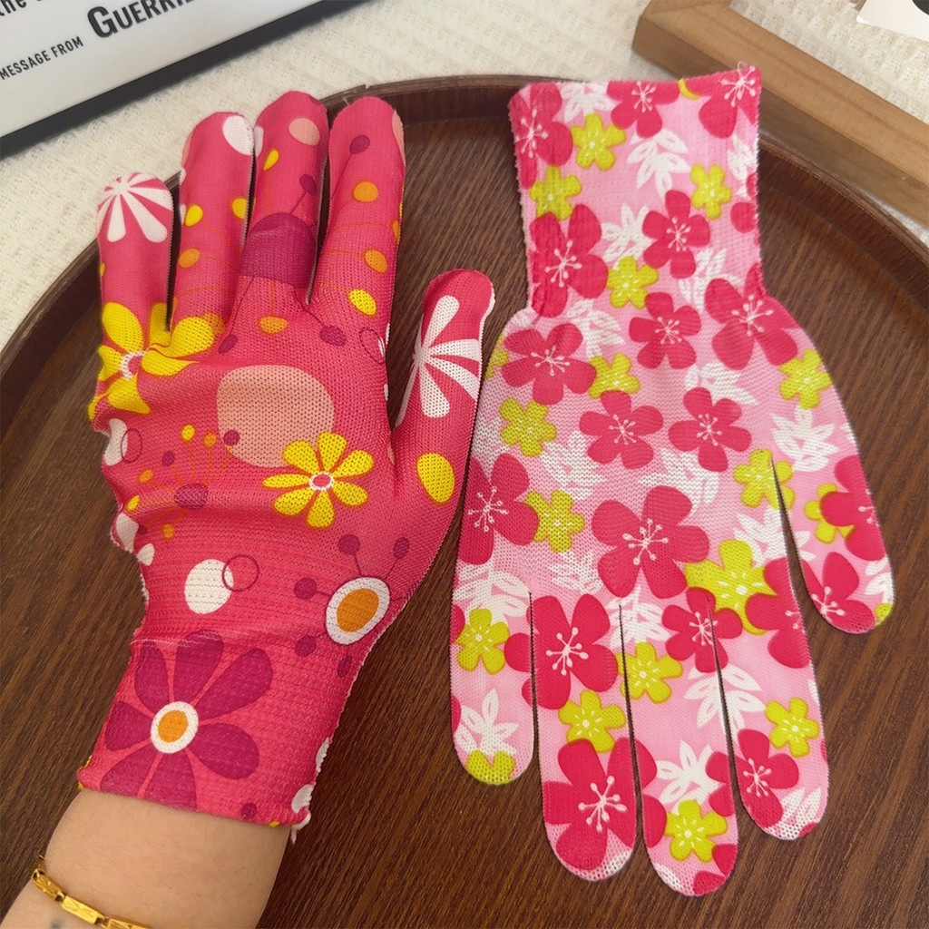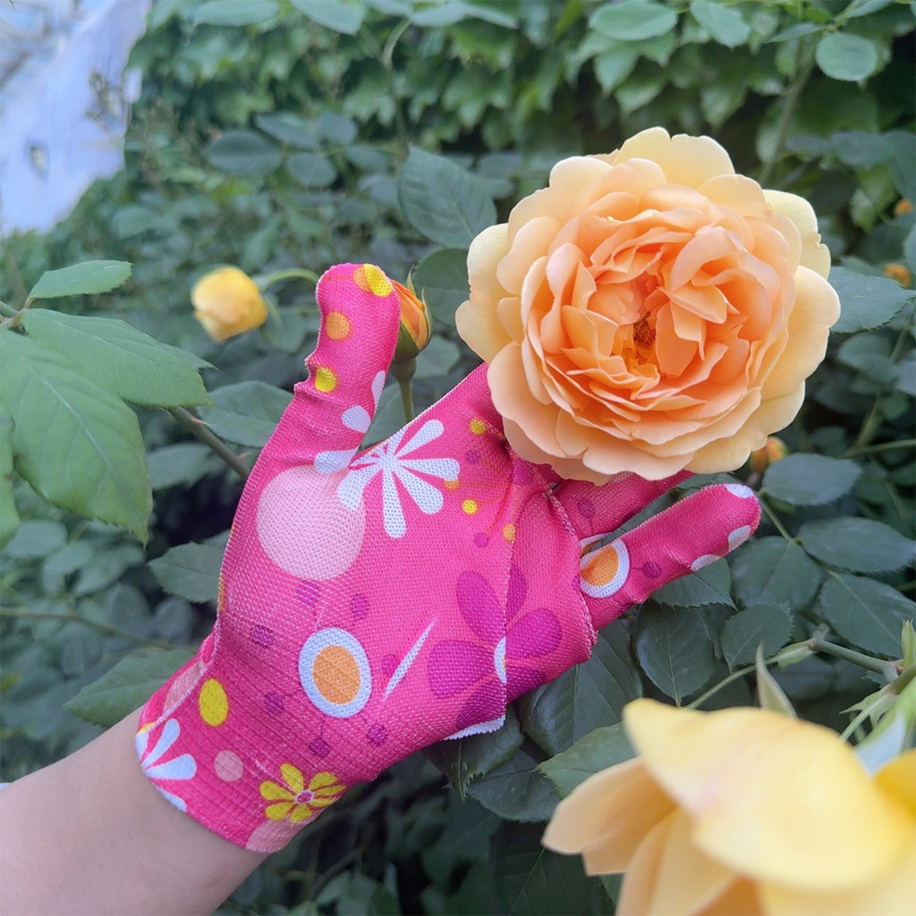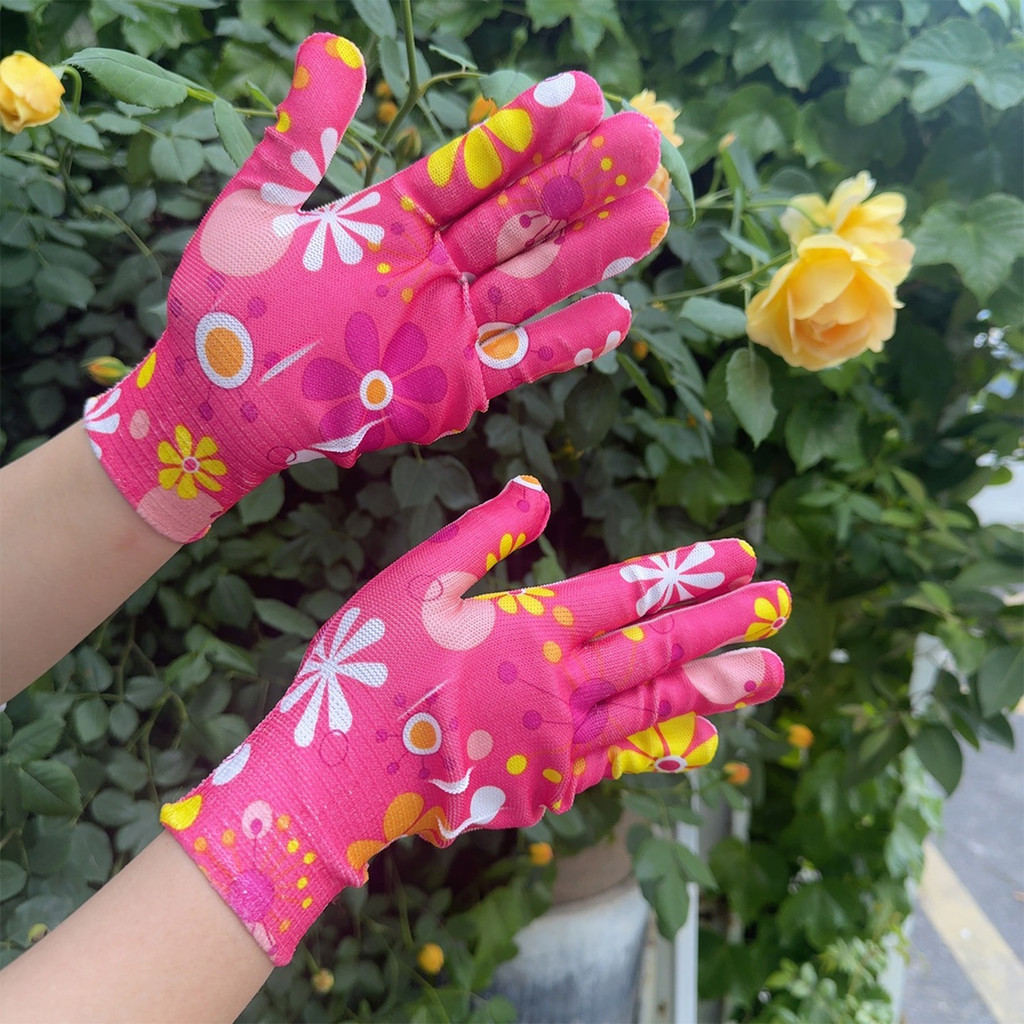 ถุงมือไนลอนพิมพ์สีชมพูสำหรับผู้หญิง ระบายอากาศดี ใช้งานได้หลากหลาย เช่น ในครัวและทำงานหนัก