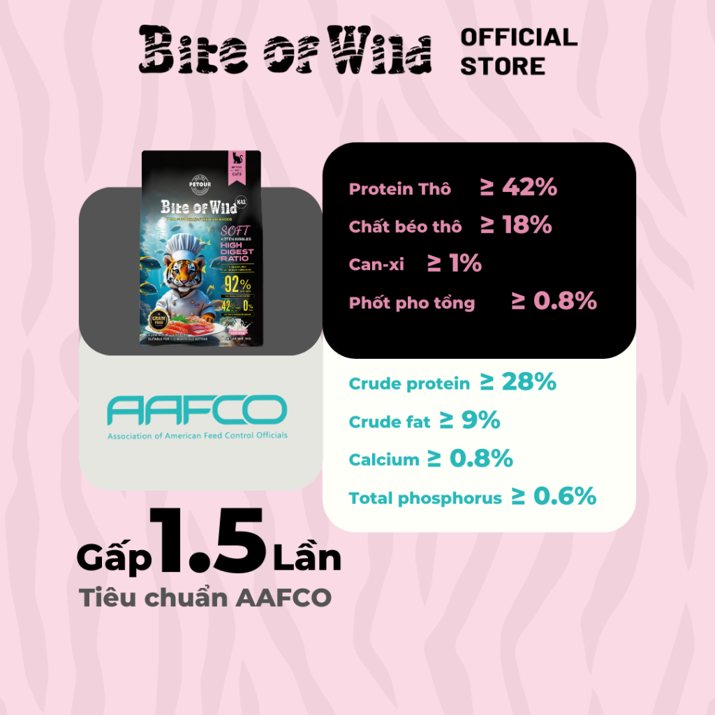 กัดป่า K42 (ปราศจากธัญพืชระดับพรีเมียม) 100% ปราศจากธัญพืช (ไม่มีกลูเตนไม่มีข้าวโพด): ปราศจากธัญพืช 100% (ไม่มีกลูเตนหรือข้าวโพด) โซเดียมต่ำ: ควบคุมปริมาณเกลือ โปรตีน 42%: ส่วนผสมจากสัตว์ 92% ไขมัน 18% ส่วนผสม: ผงตับไก่、 นมผงแพะ แมวอายุต่ำกว่า 12 เดือน ki