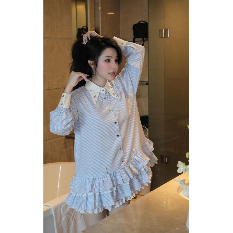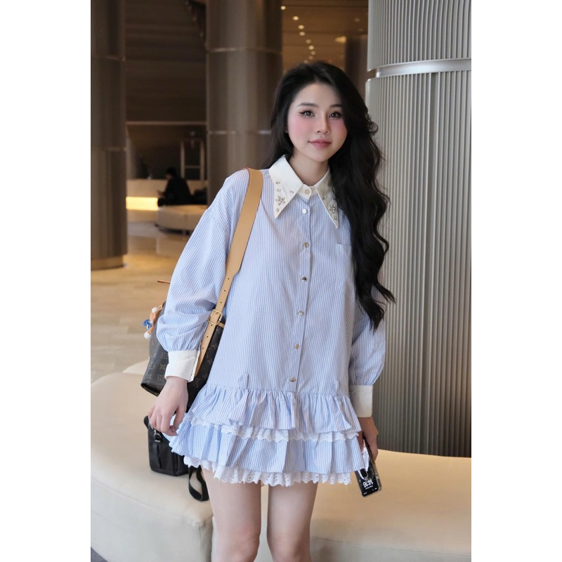 [V1.793] ชุดเดรสเสื้อลายสก๊อต Babydoll สุดน่ารักพร้อมปก Rhinestone และ Ruffles Layered
