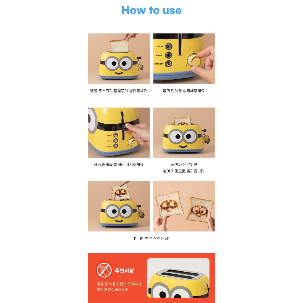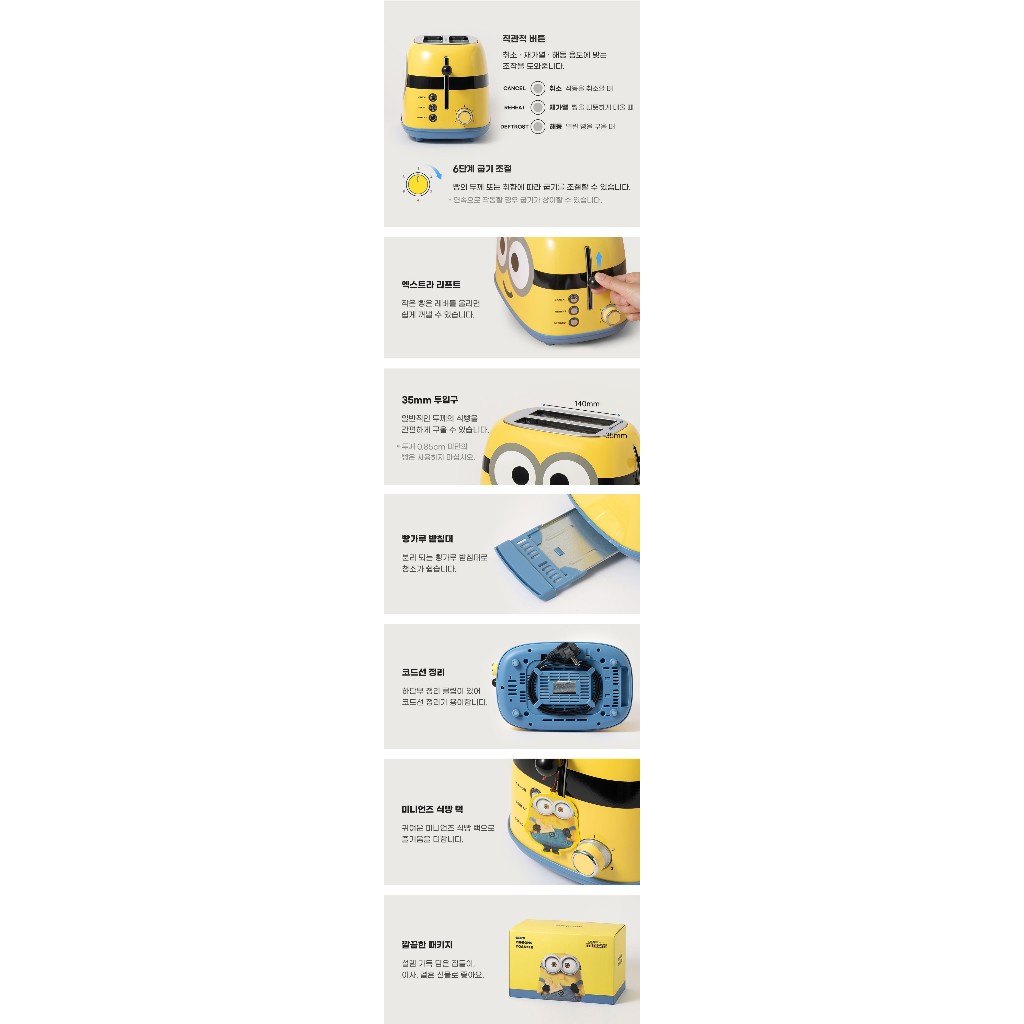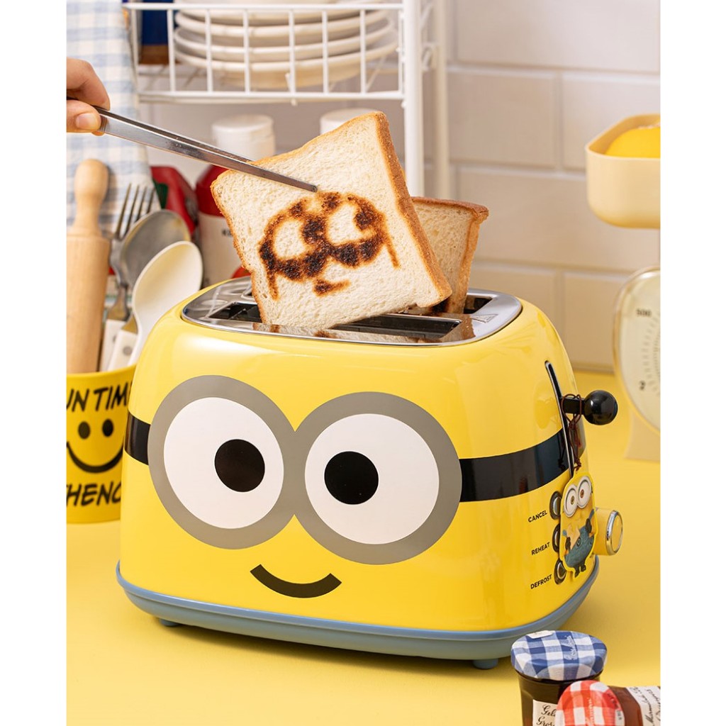 เครื่องปิ้งขนมปังมินเนี่ยนนนน ความน่ารักมาเต็ม ตั้งแต่กล่องแพคเกจ ตัวเครื่อง และเวลาปิ้งขนมปัง ตัวขนมปังเป็นลายมินเนี่ยนด้วยนะคะ น่ารักมากๆเลยค่า มีฟังก์ชั่นการยกเลิกการปิ้งแบบกระทันหัน และ การอถุ่นขนมปังที่ปิ้งแล้ว