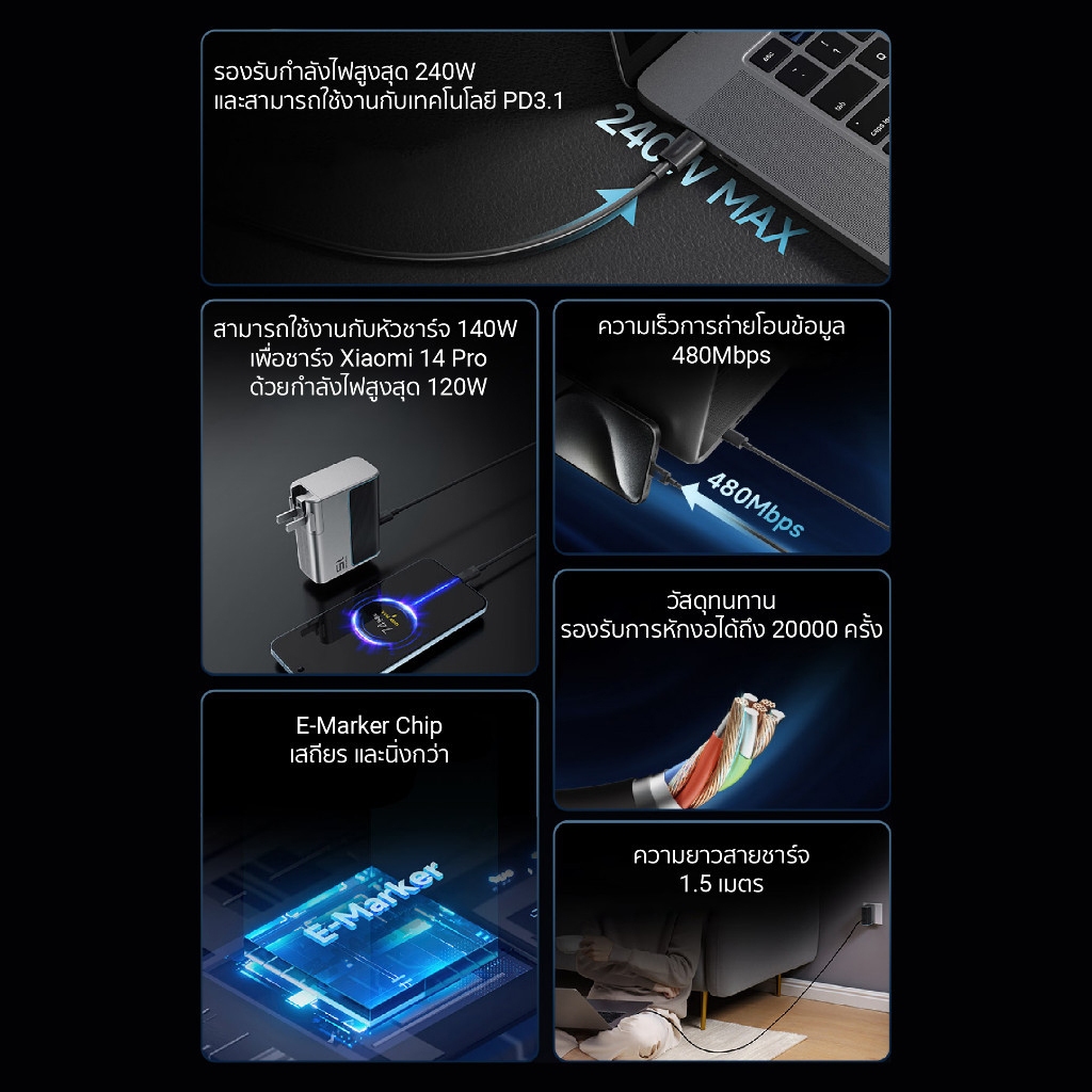 ZM CUKTACH CTC615N 6A 240W สายชาร์จเร็ว USB-C ความยาว 1.5 เมตร รองรับการชาร์จ PD3.1
