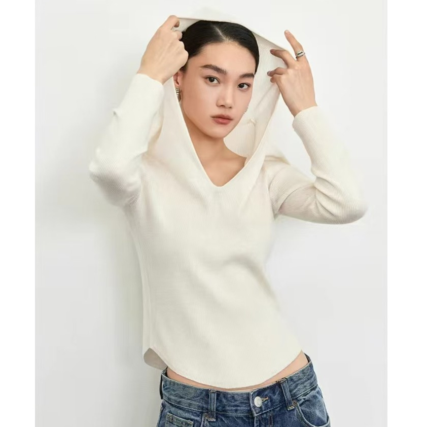 เสื้อยืดแขนยาวมีฮู้ดผู้หญิง สเว็ตเตอร์ผ้าร่อง คอวีสีพื้น ผ้าร่องนุ่ม เด้ง เสื้อกันหนาวไหมพรม #435