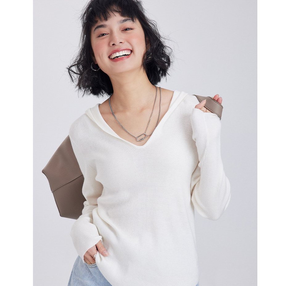 ชื่อสินค้า : เสื้อสเว็ตเตอร์แขนยาวผู้หญิง มีฮู้อ คอวีสีพื้น ผ้าร่องนุ่ม เด้ง