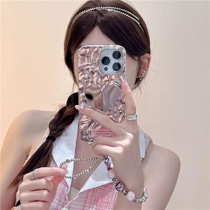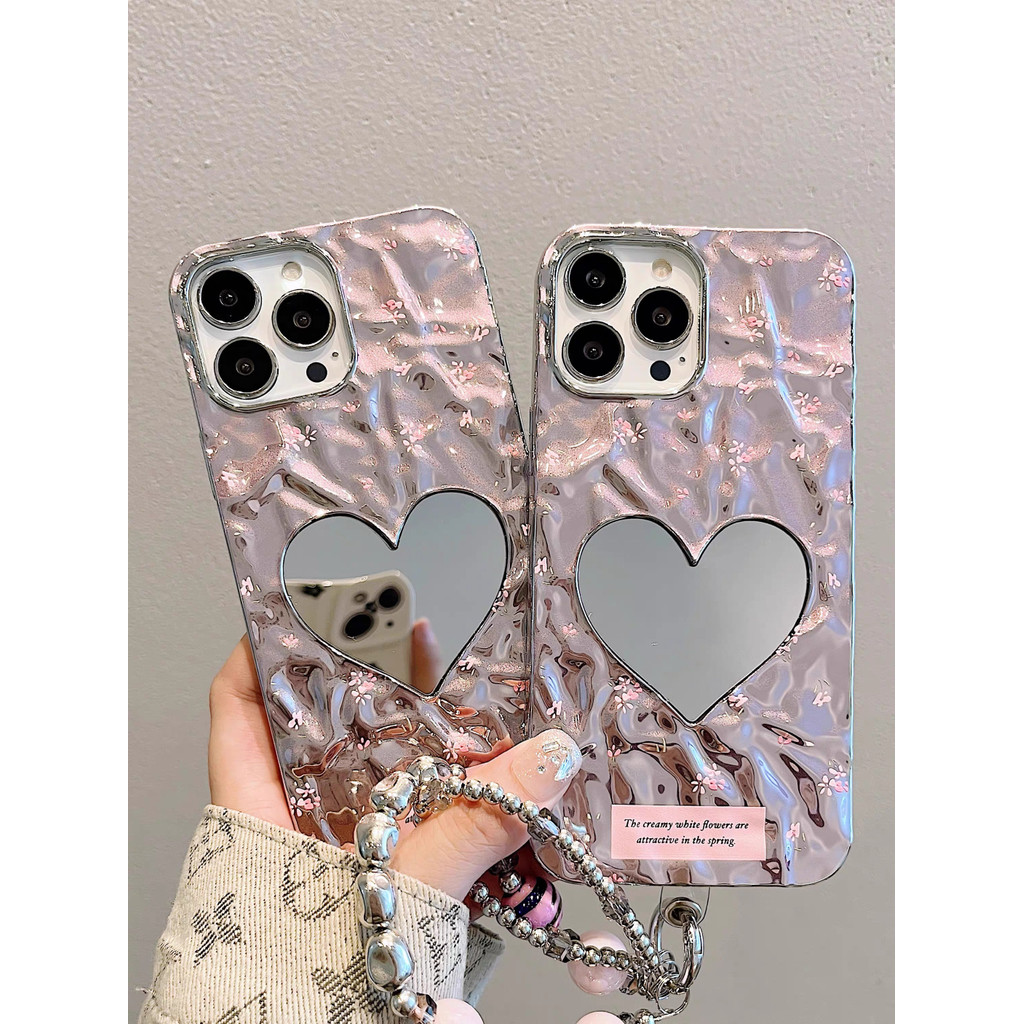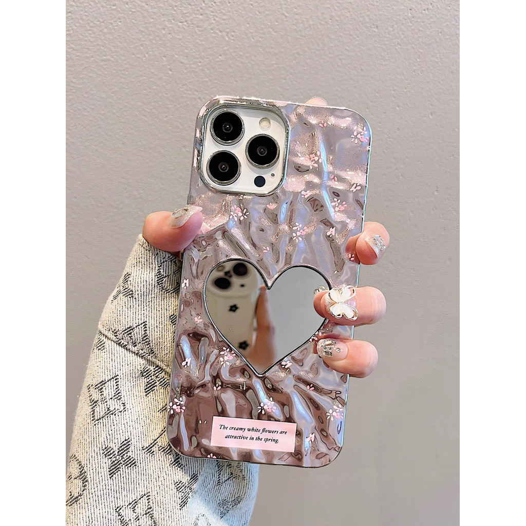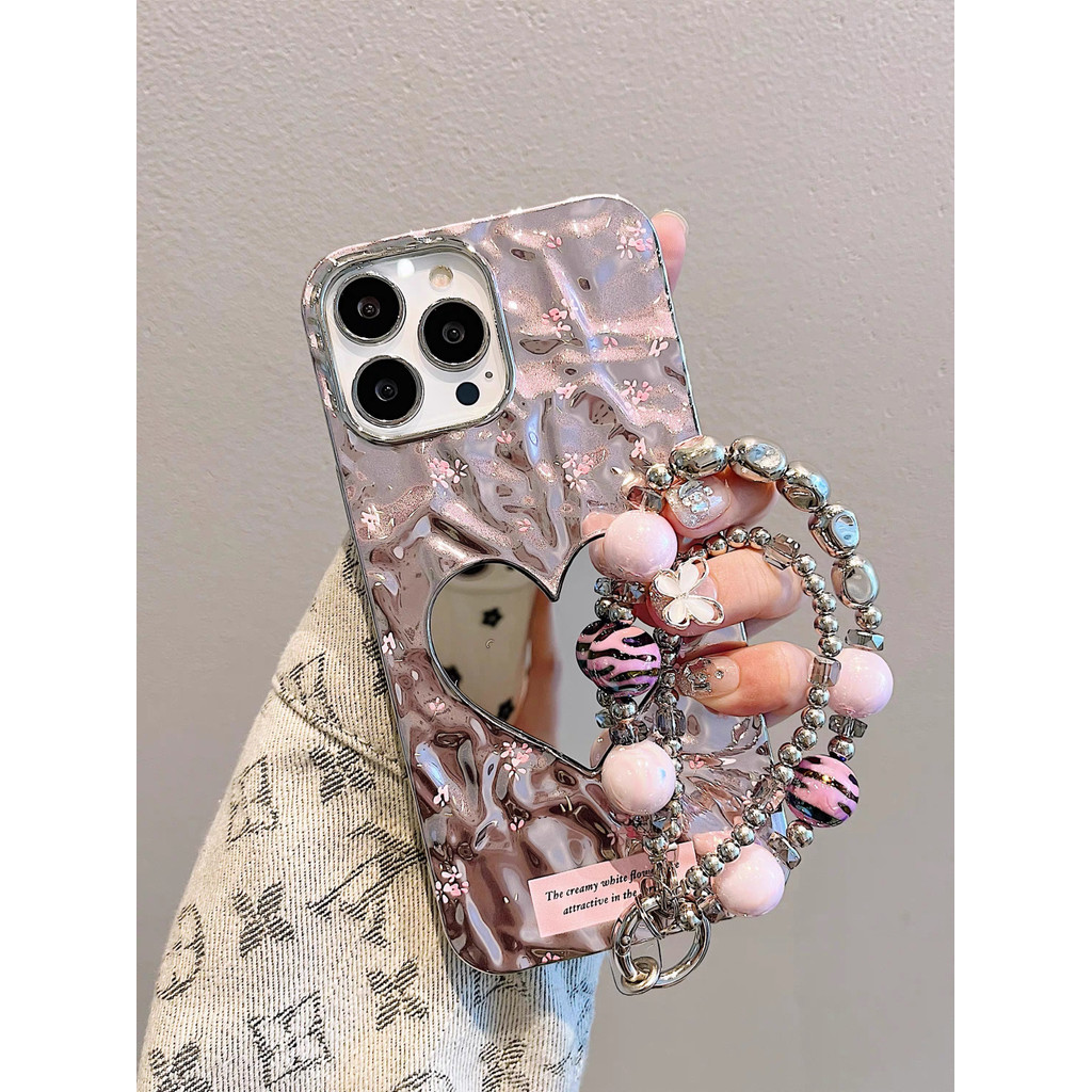 กระจกแต่งหน้าดอกไม้เล็กสีชมพูย่นเหมาะสําหรับ แอปเปิล 16 โปรแม็กซ์ เคสโทรศัพท์ ไอโฟน 15/14/13/12/11