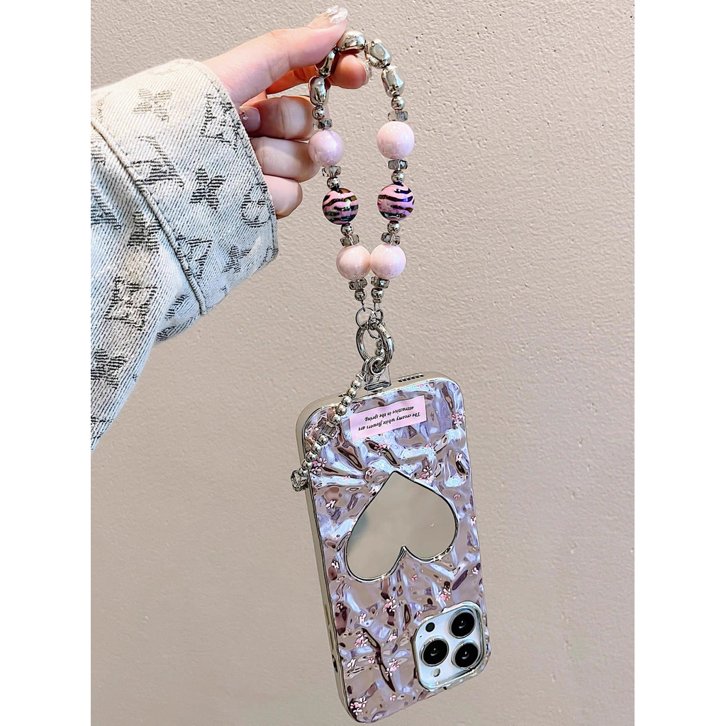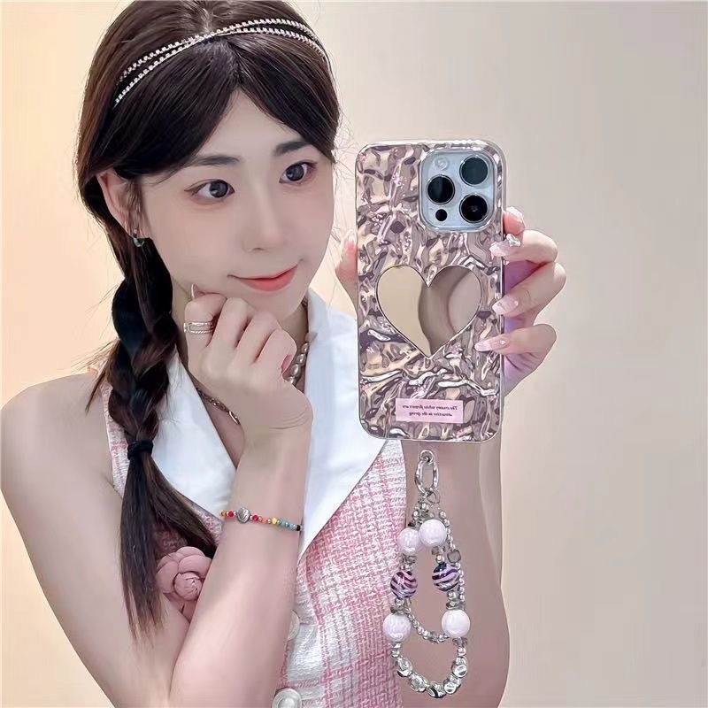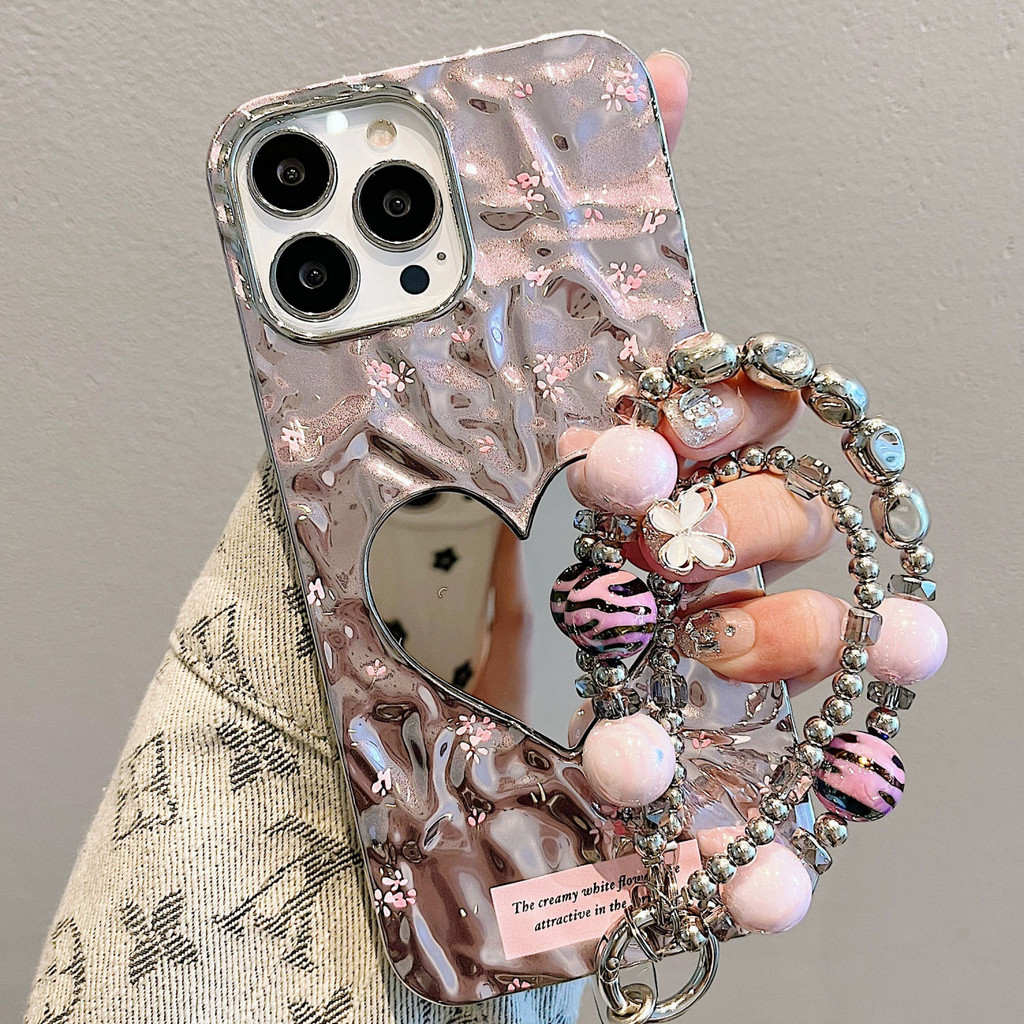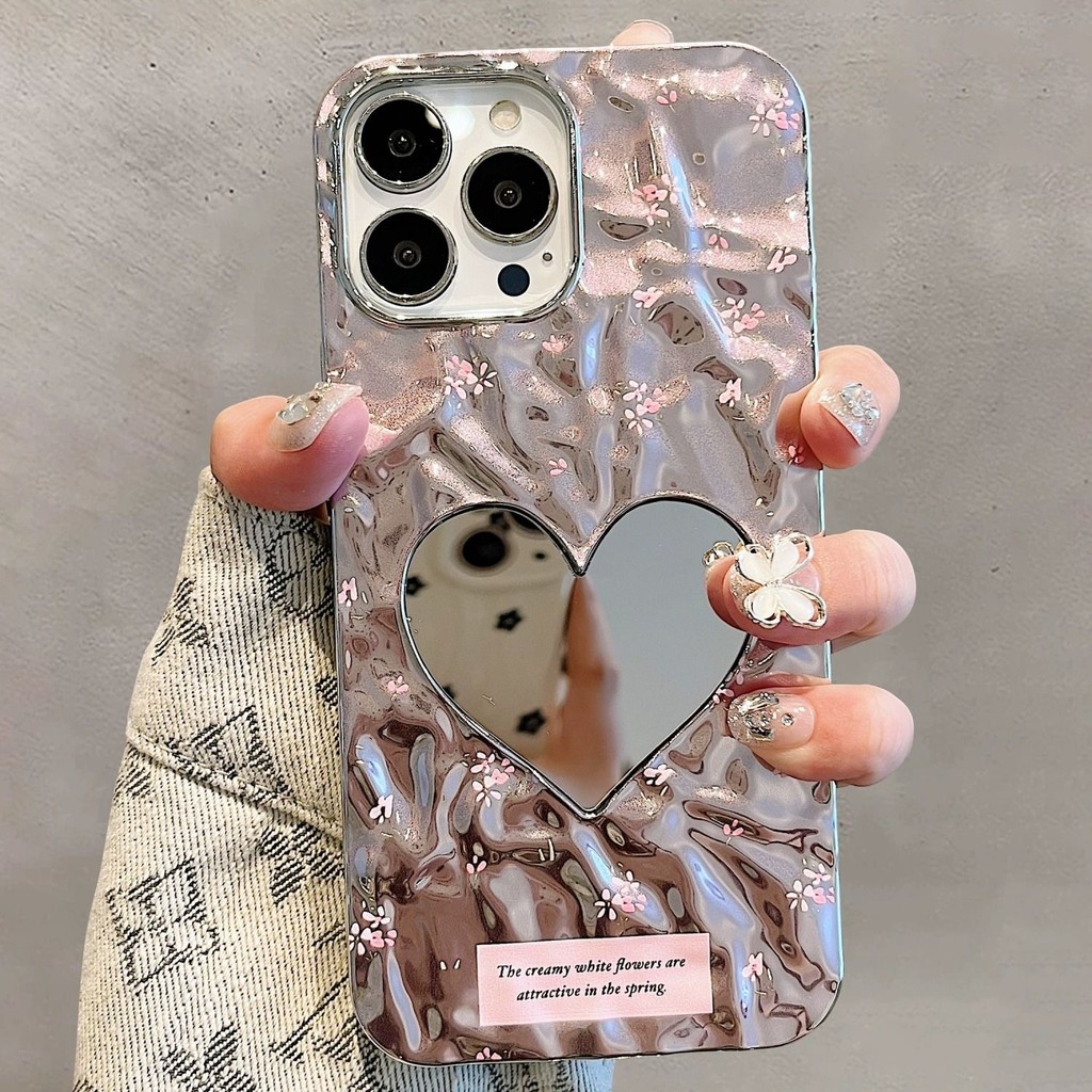 กระจกแต่งหน้าดอกไม้เล็กสีชมพูย่นเหมาะสําหรับ แอปเปิล 16 โปรแม็กซ์ เคสโทรศัพท์ ไอโฟน 15/14/13/12/11