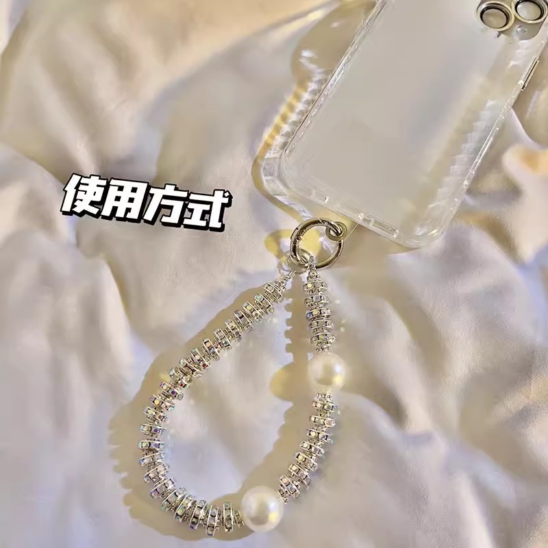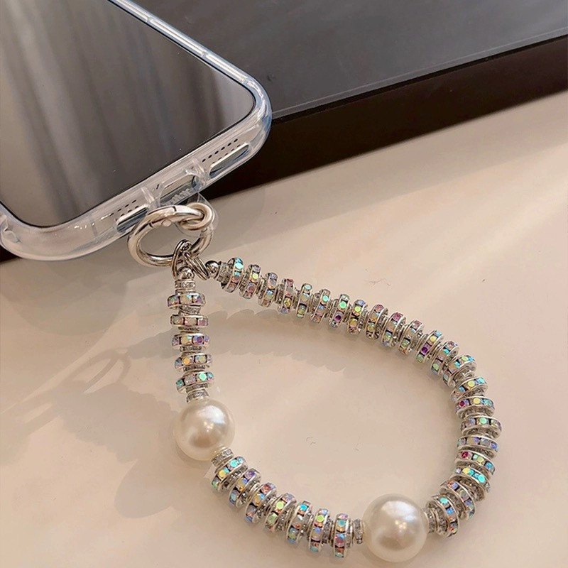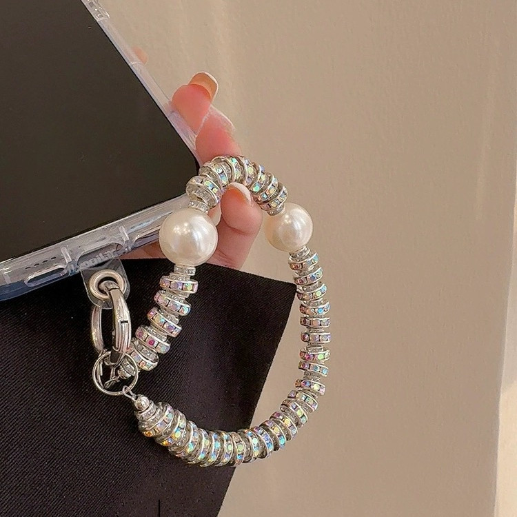 สร้อยข้อมือ ประดับมุก ขนาดใหญ่ ป้องกันการสูญหาย พร้อมสายคล้องข้อมือ และจี้เพชร สําหรับโทรศัพท์มือถือ