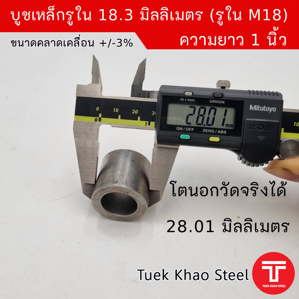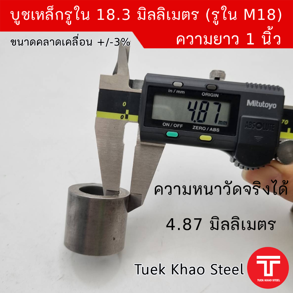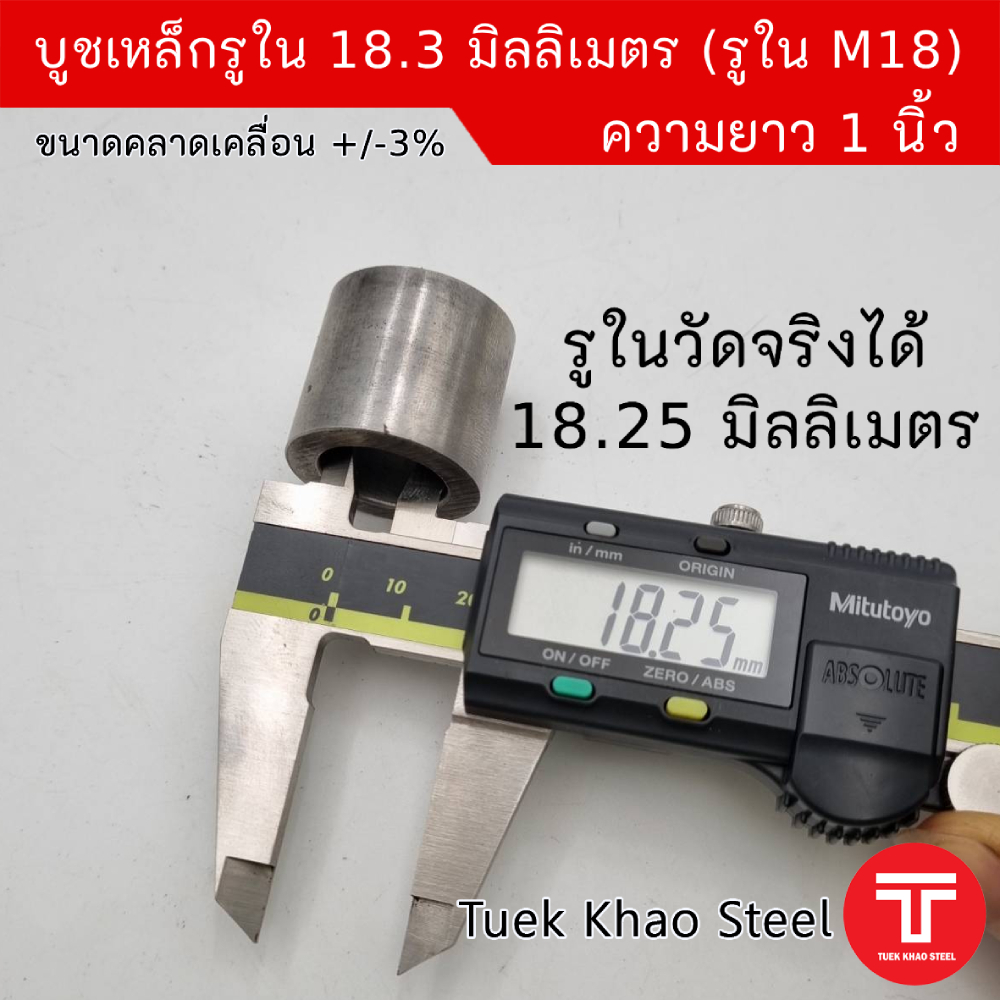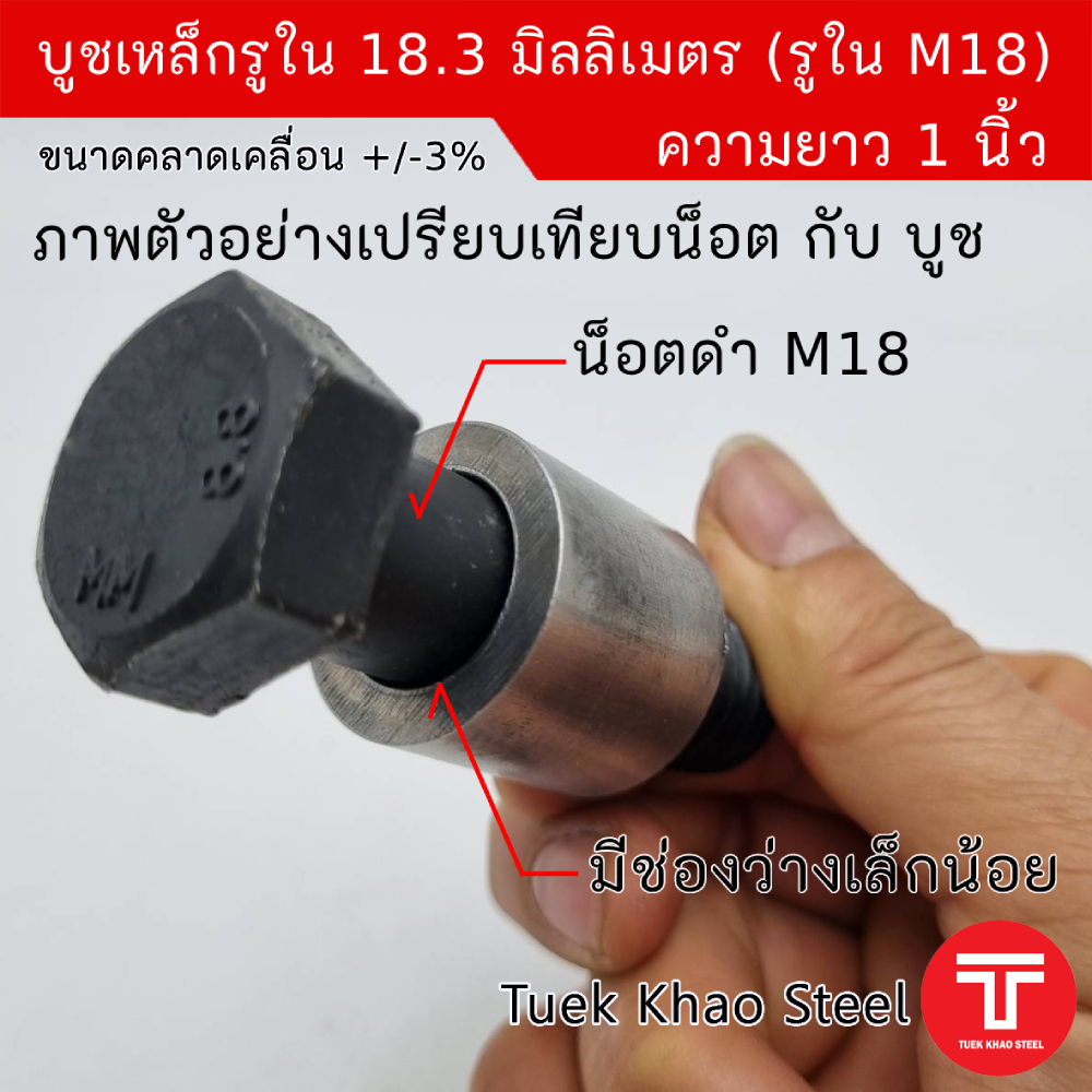 บูชเหล็กรูใน 18.3 มม. x ความยาว 1 นิ้ว ,ขอบหนา ,บูชใช้สวมเพลา 18 มิลลิเมตร ,บูชสวมกับน็อต M18 ,ผิวภายในเรียบกลม ,บูช DIY
