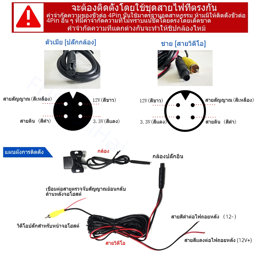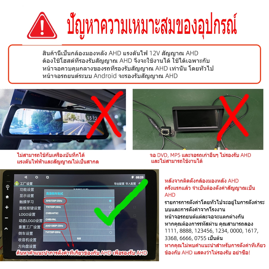 กล้องนี้เป็นเลนส์ถอยหลังที่มีรุ่นความละเอียดสูงซึ่งต้องใช้หน้าจอควบคุมส่วนกลางเพื่อรองรับสัญญาณ AHD โปรดอย่าซื้อหากไม่รองรับประเภทอินเทอร์เฟซคืออินเทอร์เฟซ 4pin และ เรียกอีกอย่างว่าอินเทอร์เฟซสี่ขาหรืออินเทอร์เฟซ Bmw