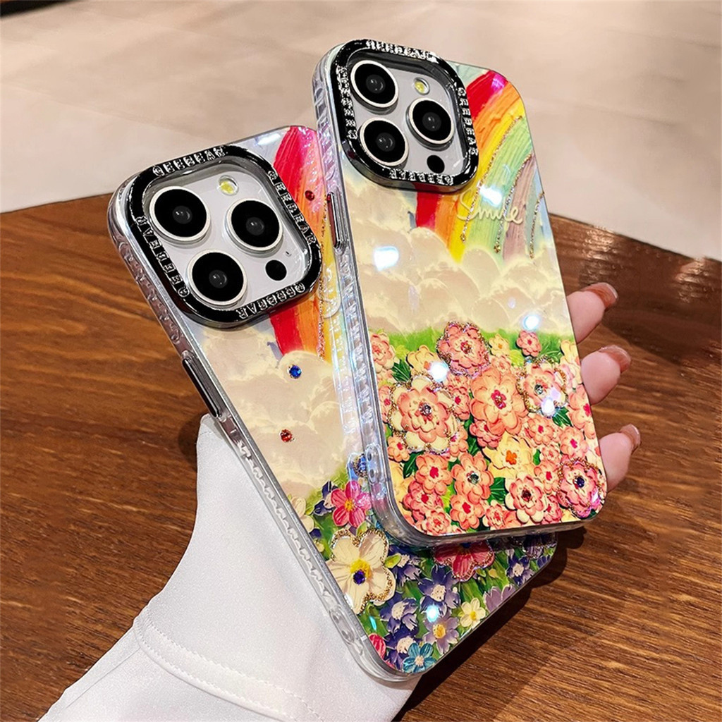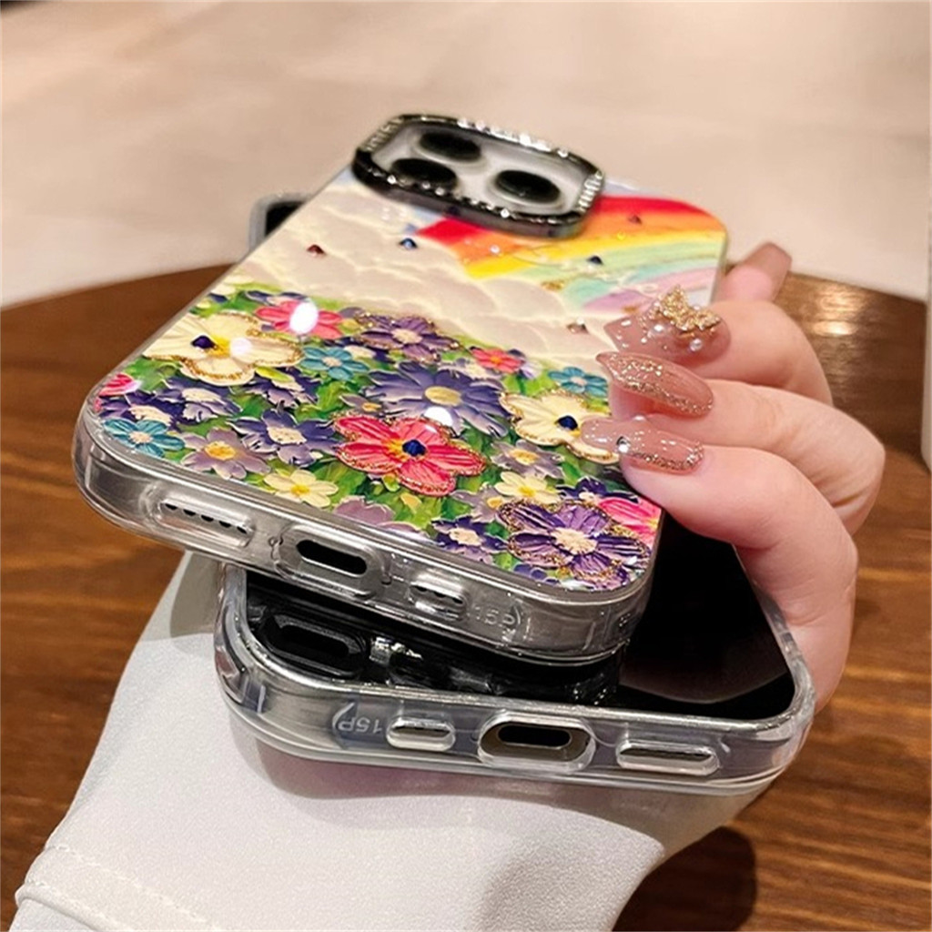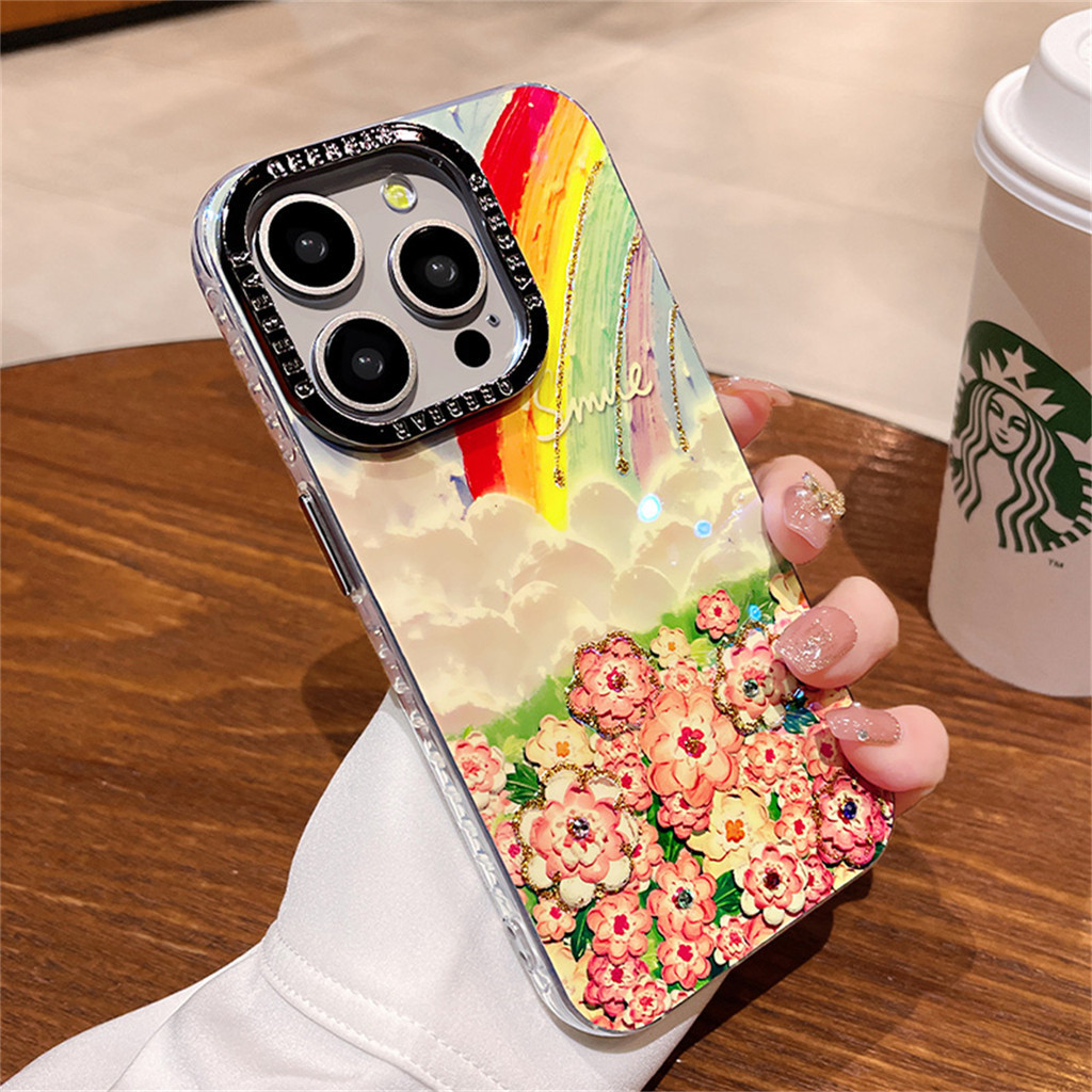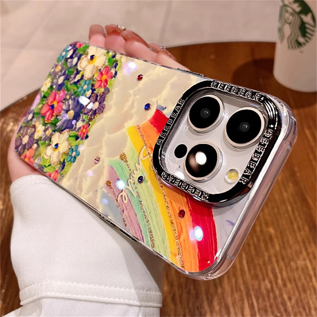 เคสโทรศัพท์ Rainbow Flower Glitter สำหรับ IPhone 15 11 12 13 14 Pro Max 14 15 Plus ซิลิโคนนุ่มกันกระแทกเลนส์โลหะ