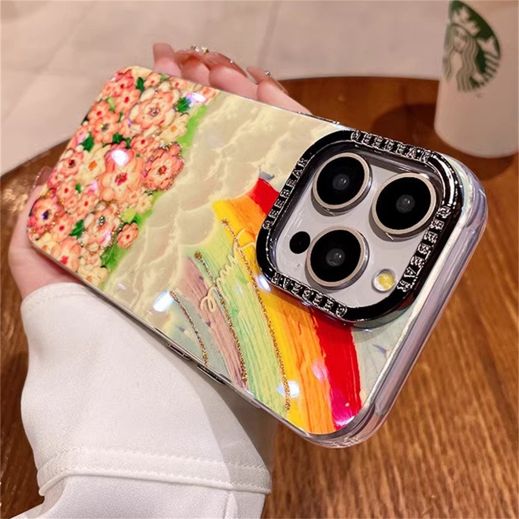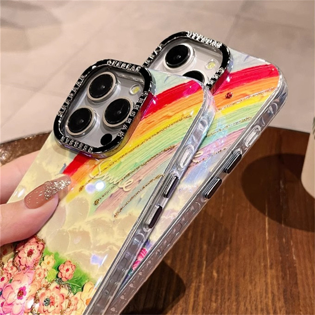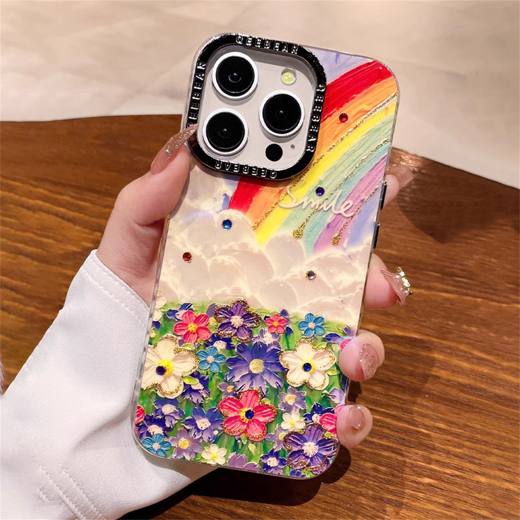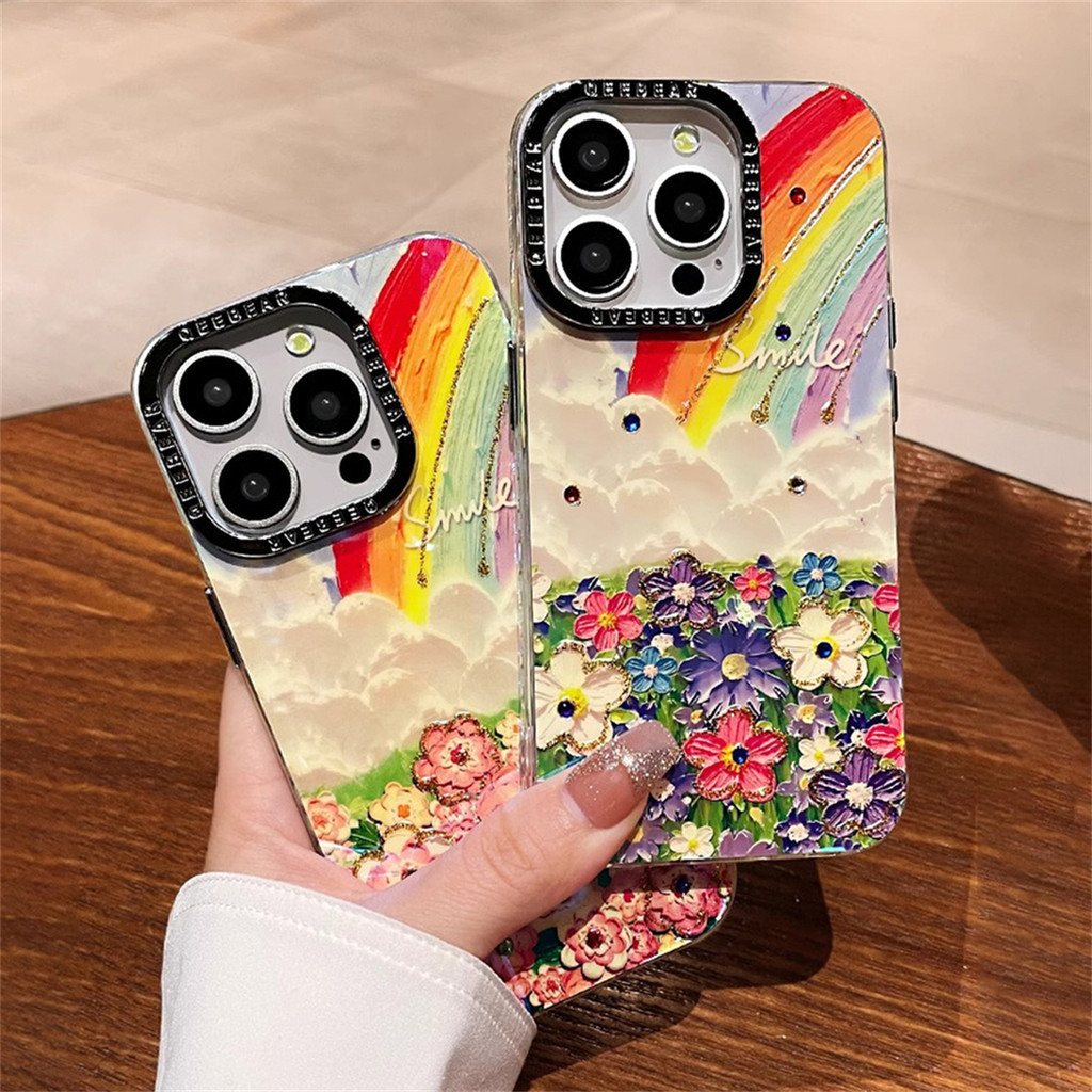 เคสโทรศัพท์ Rainbow Flower Glitter สำหรับ IPhone 15 11 12 13 14 Pro Max 14 15 Plus ซิลิโคนนุ่มกันกระแทกเลนส์โลหะ