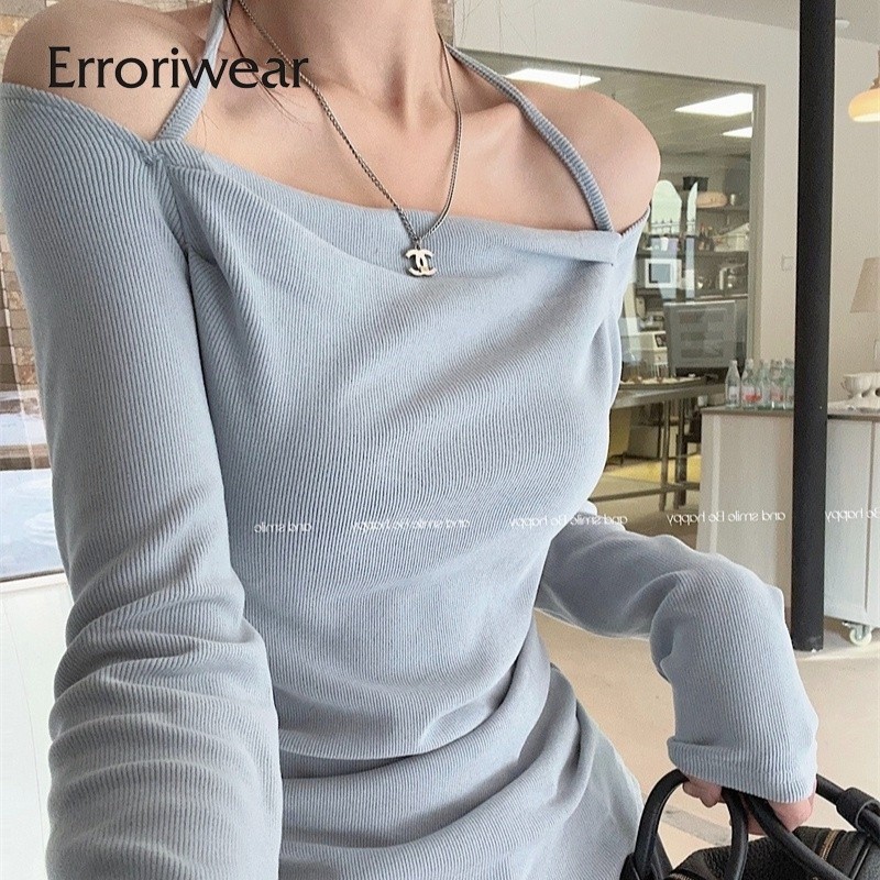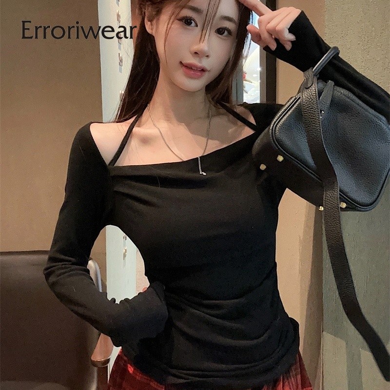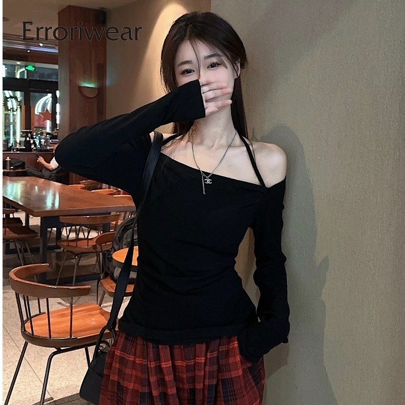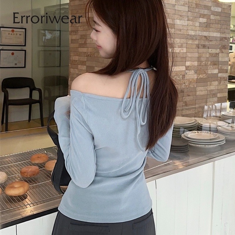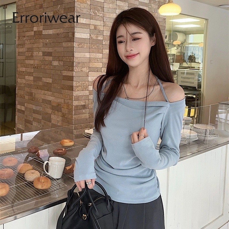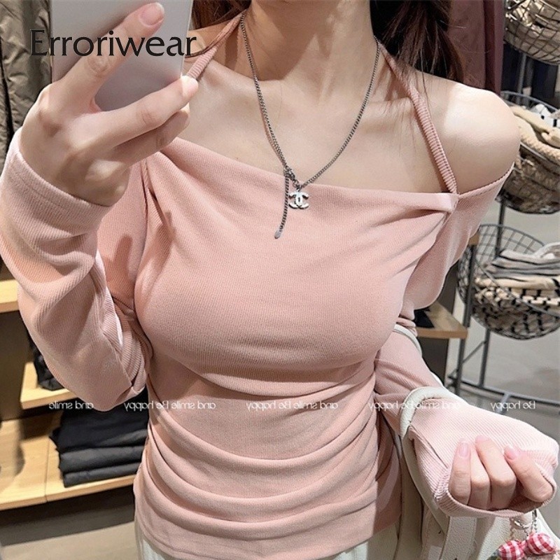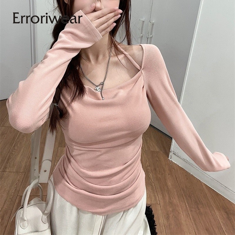 ข้อผิดพลาด เสื้อยืดผู้หญิงแฟชั่นสีทึบคอสี่เหลี่ยมปิดไหล่แขนยาวสลิมฟิตท็อปส์