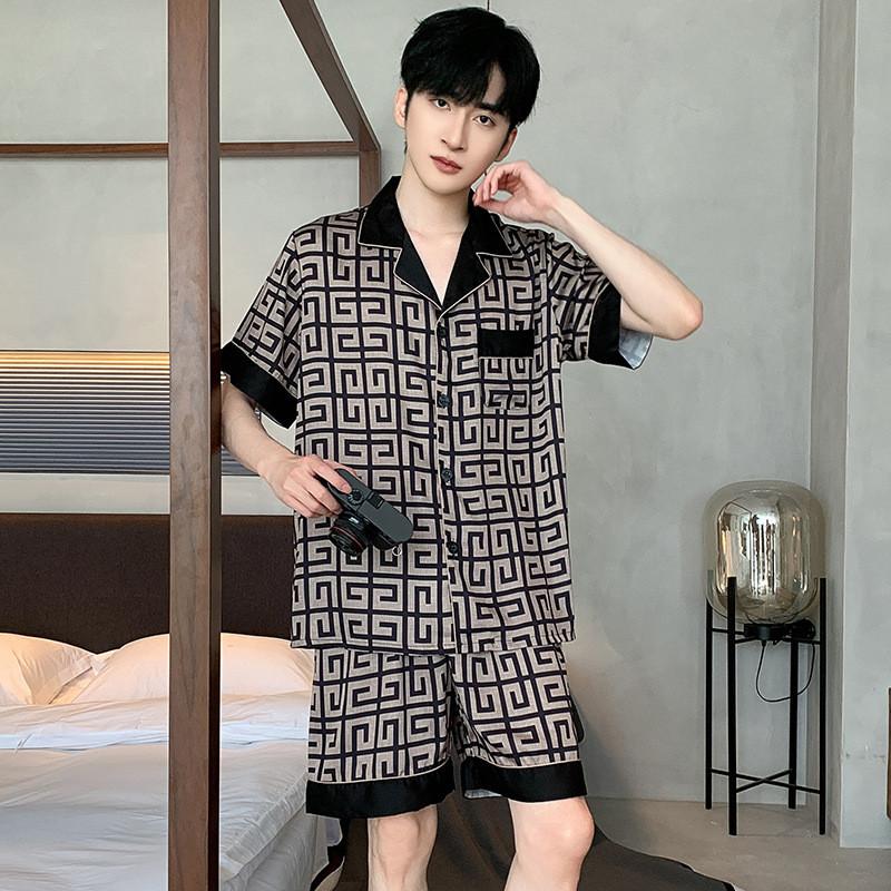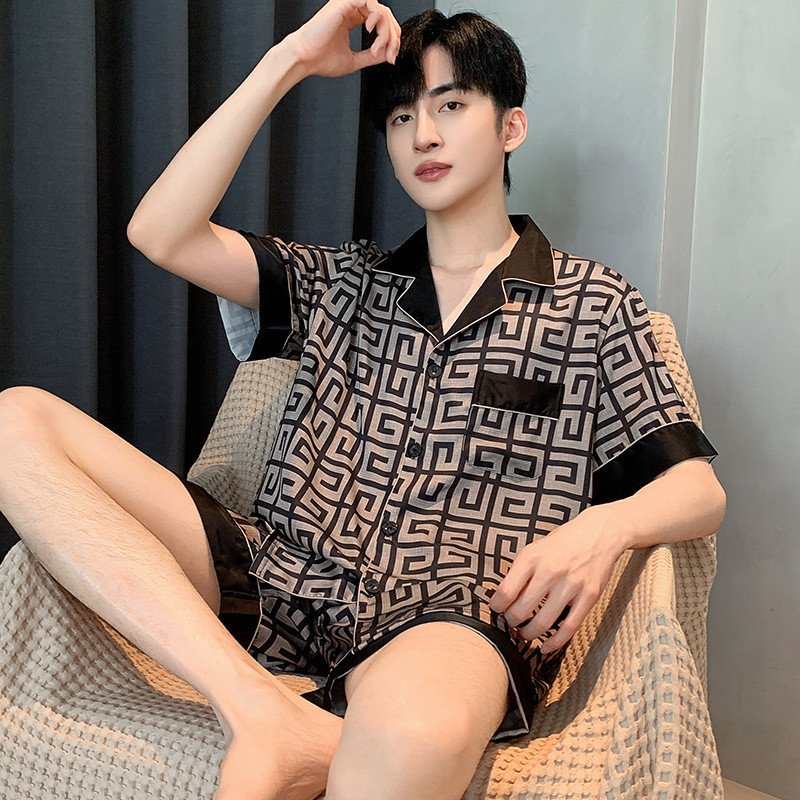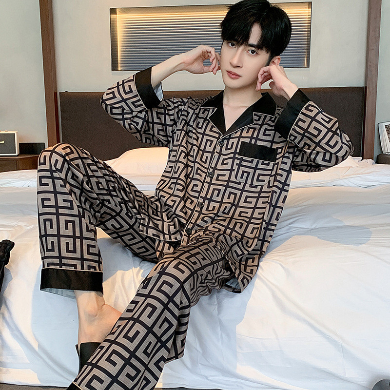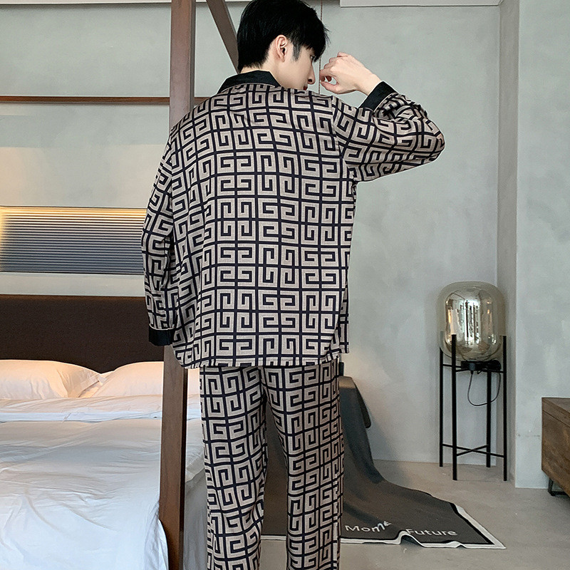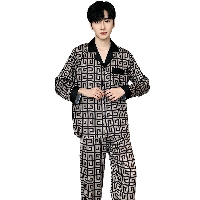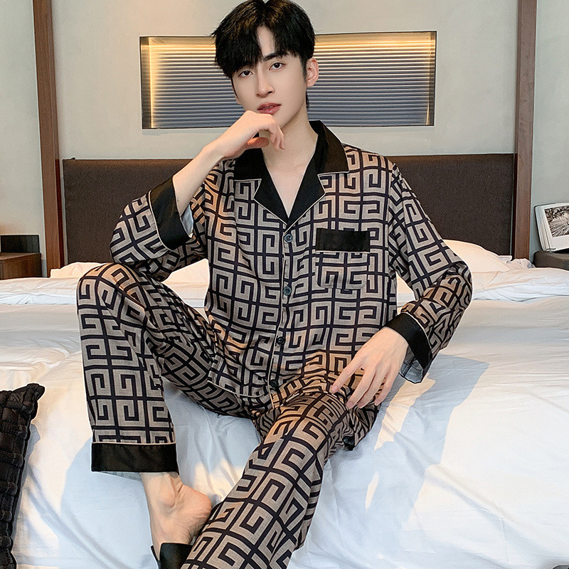 ผู้ชายแขนยาวชุดนอนชุดผ้าไหมน้ําแข็งฤดูใบไม้ผลิผู้ชายบางสไตล์บ้านสูทชุดชุดนอน