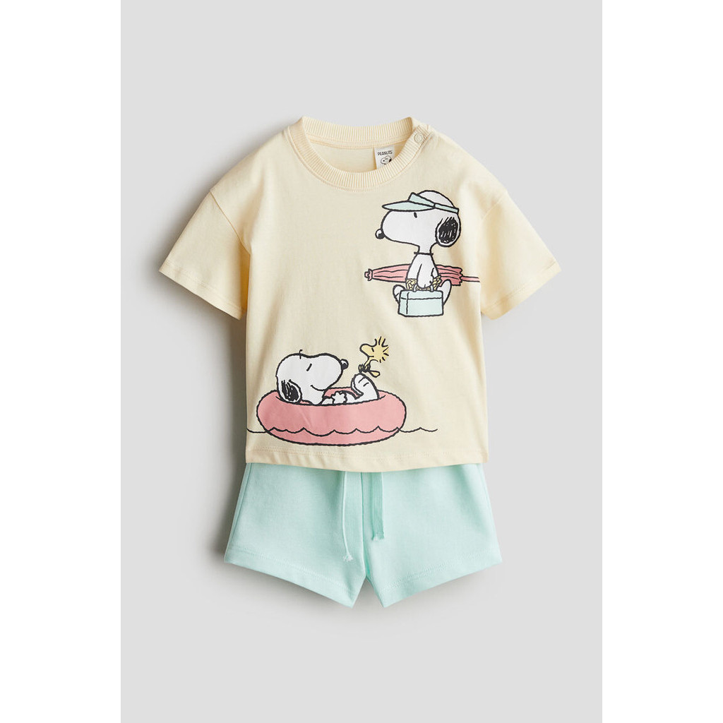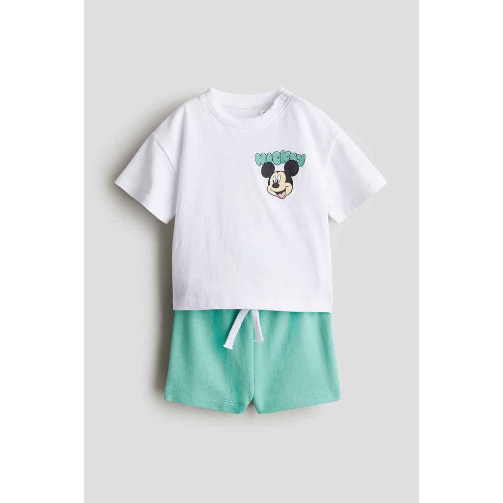 เซ็ตชุดลำลองกับเสื้อยืดและกางเกงขาสั้นพิมพ์ลายเข้าชุดกัน เสื้อยืดแบบคลาสสิก ตัดเย็บจากผ้ายืดคอตตอน กุ๊นขอบผ้าถักลายรอบคอ และมีกระดุมแป๊กที่ไหล่ข้างหนึ่ง (ยกเว้นขนาด 2-4 ปี) กางเกงขาสั้นทำจากผ้าสเวตเชิ้ตน้ำหนักเบา พร้อมเอวยางยืดแบบซ่อนและเชือกผูกเอว
