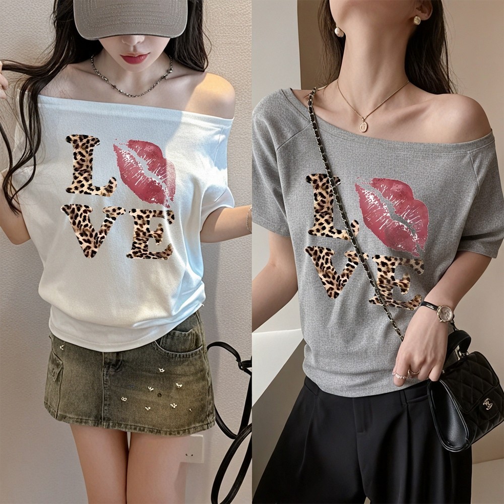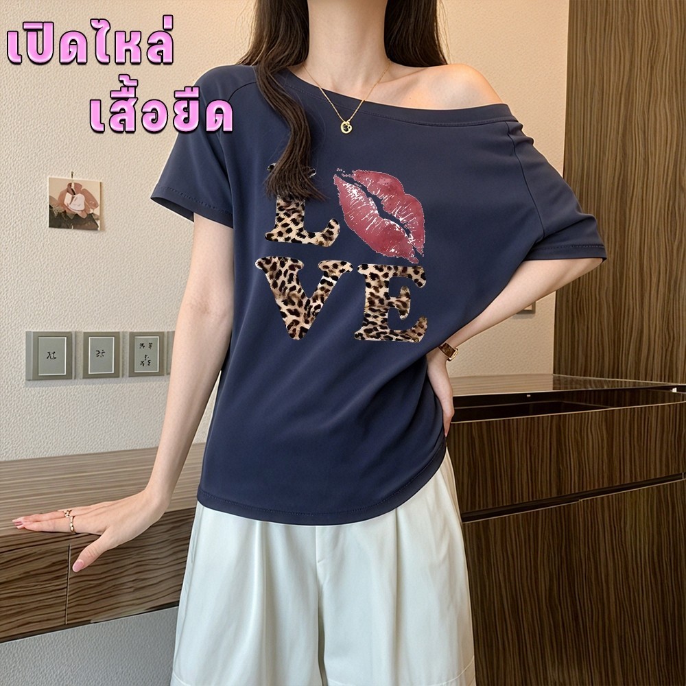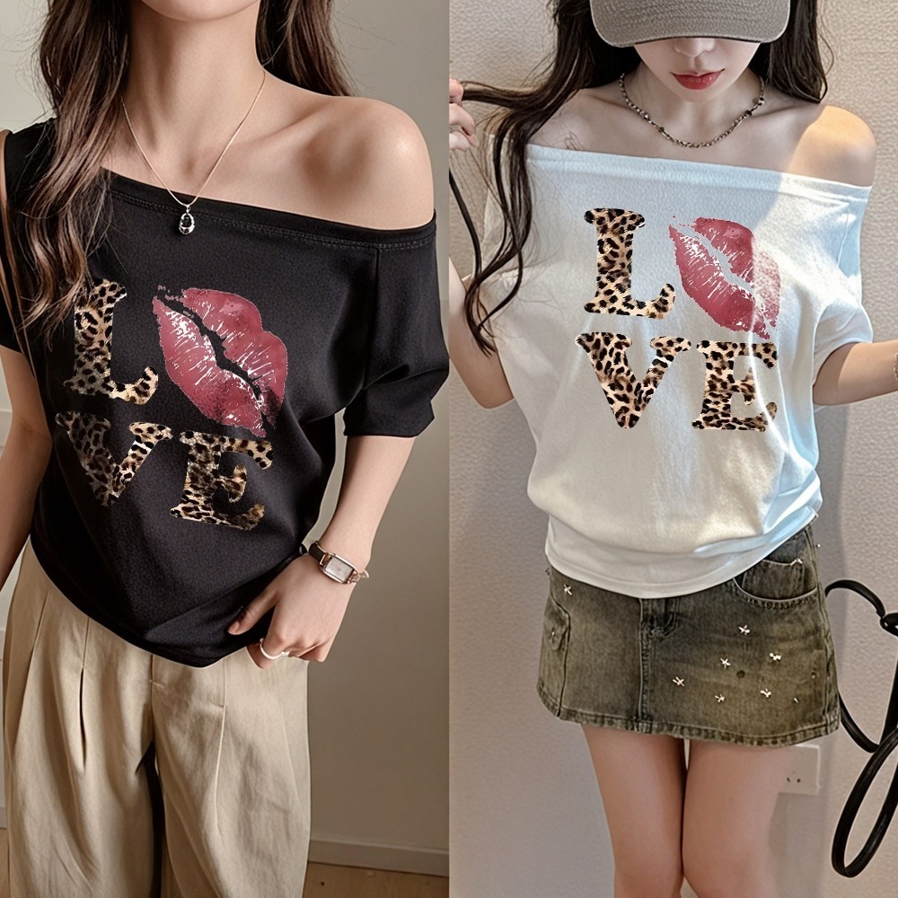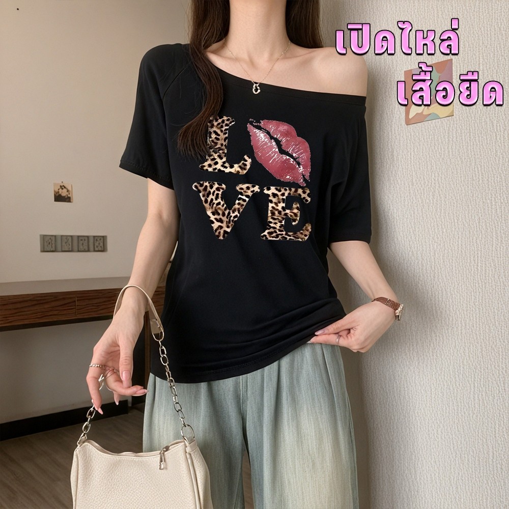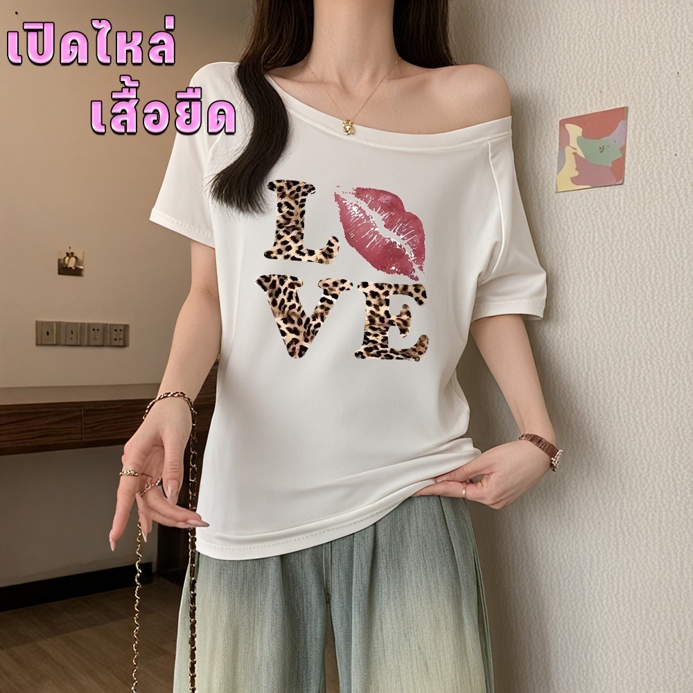 【My-T】?เสื้อปาดไหล่ เสือใส่สบาย Oversize sexy lady เสื้อโชว์ไหล่ เหมาะสำหรับฤดูร้อน มี 4ไซส์“LOVE KISS TIGER”
