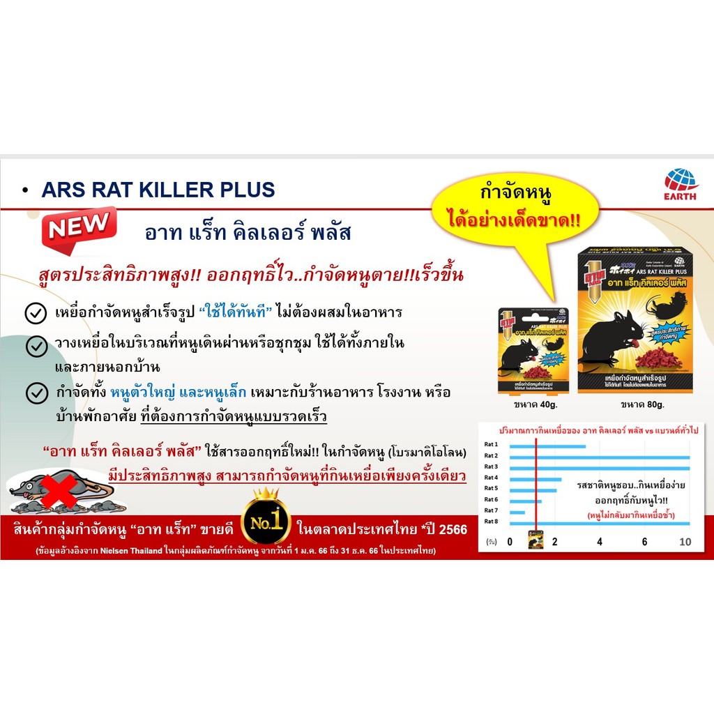สูตรประสิทธิภาพสามารถกำจัดหนูได้อย่างรวดเร็ว ด้วยสารออกฤทธิ์ที่คงสภาอยู่ในตัวหนูได้อย่างยาวน