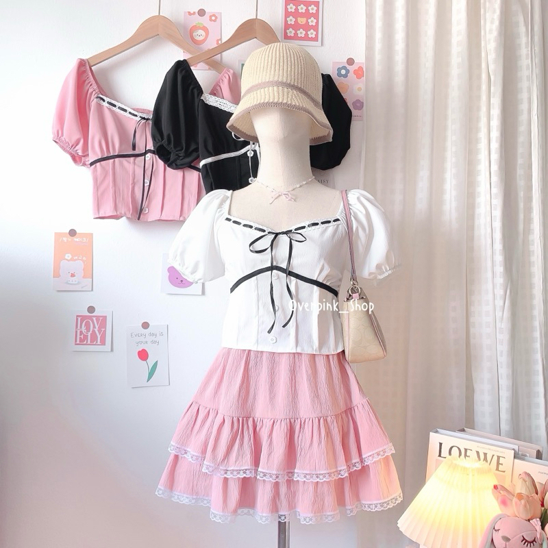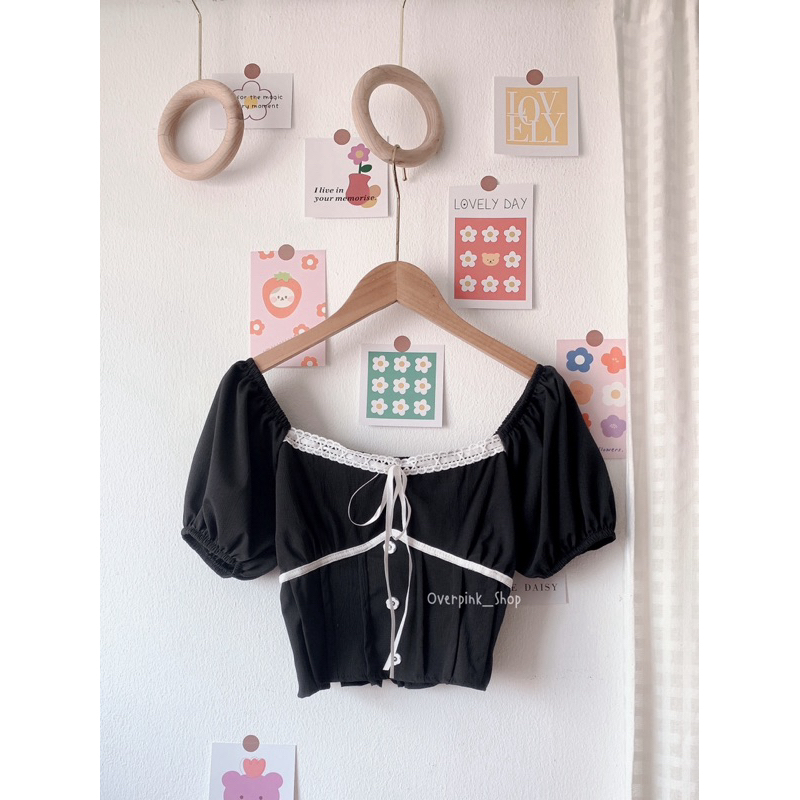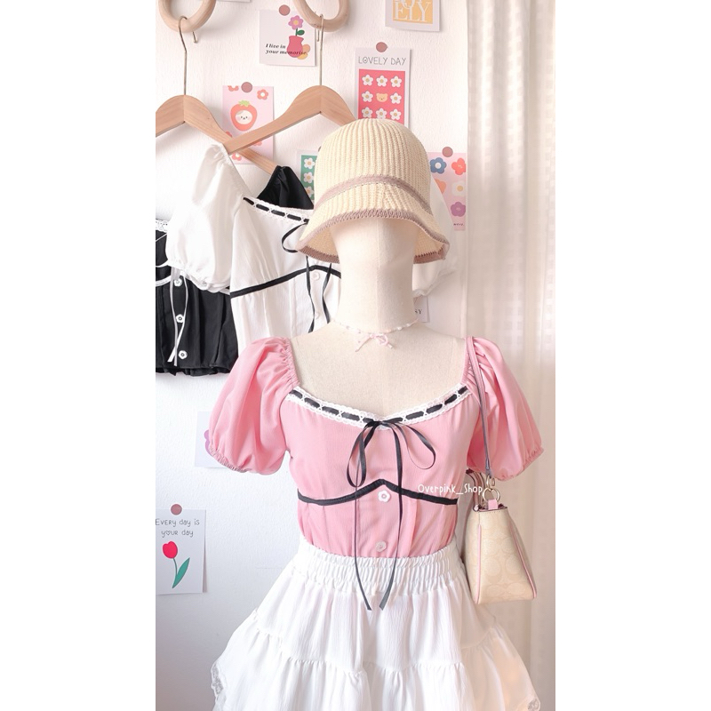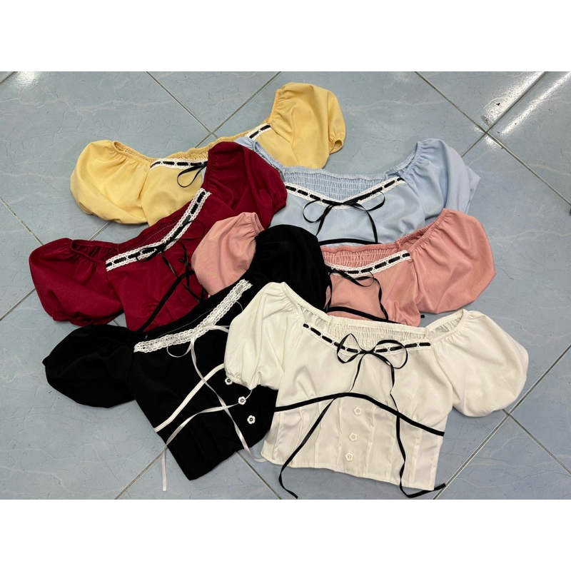 ?OVP? Crop Top มี6สี เสื้อครอป ผ้าครัชแต่งฉลุริบบิ้น แขนตุ๊กตาเล็ก เสื้อเอวลอย