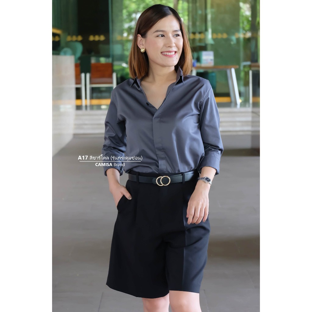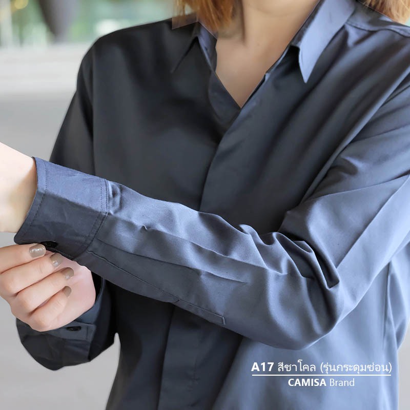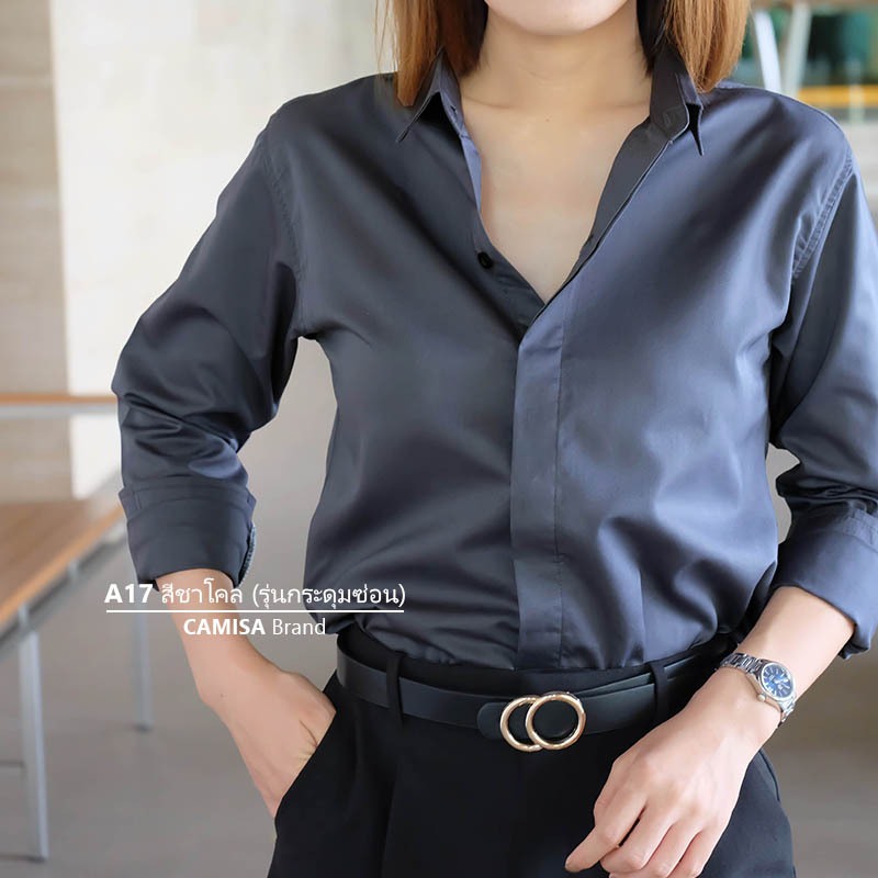 (A17 สีชาร์โคล-รุ่นซ่อนกระดุม) ผ้าCottonคุณภาพดี เสื้อทำงาน เสื้อใส่เที่ยว