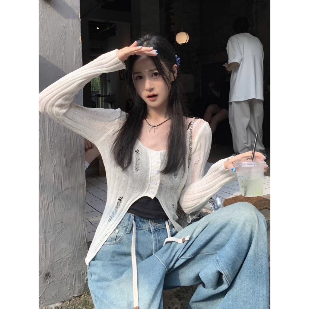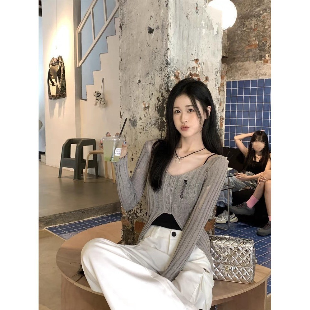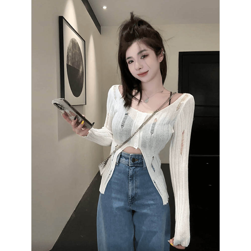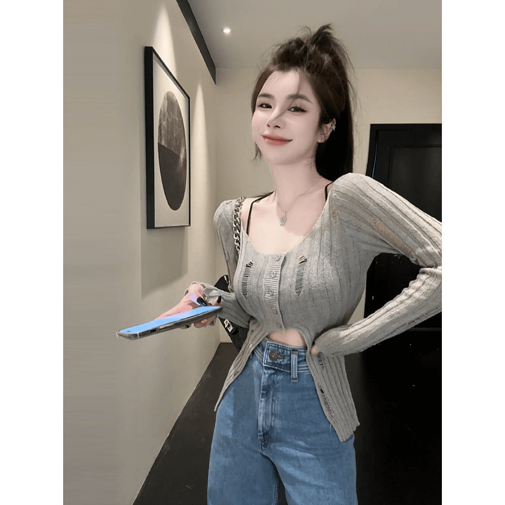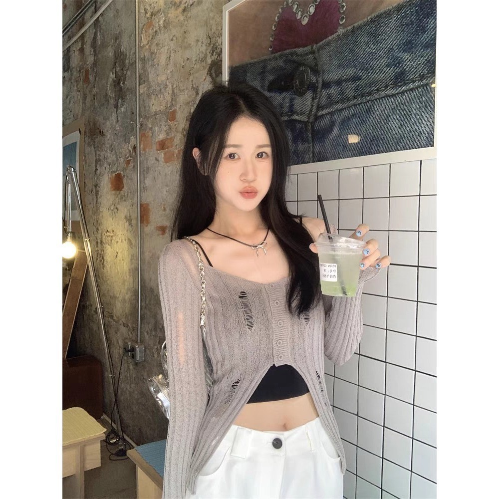 ?Kayla?คาร์ดิแก ไหมพรม คอกลม สีพื้น เทลขาดๆ ผ้านุ่มๆ เสื้อแขนยาว สไตล์เกาหลี แฟชั่นสตรีท เก๋ไก๋#MT725