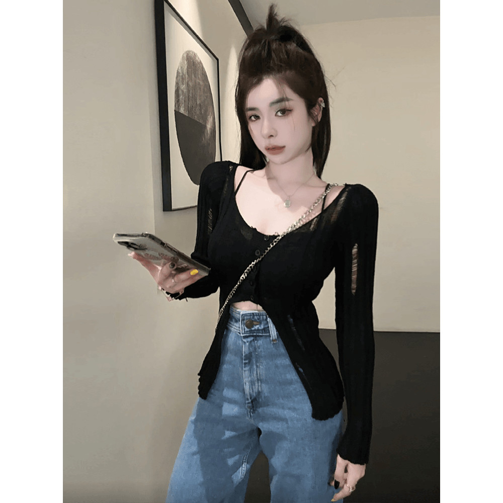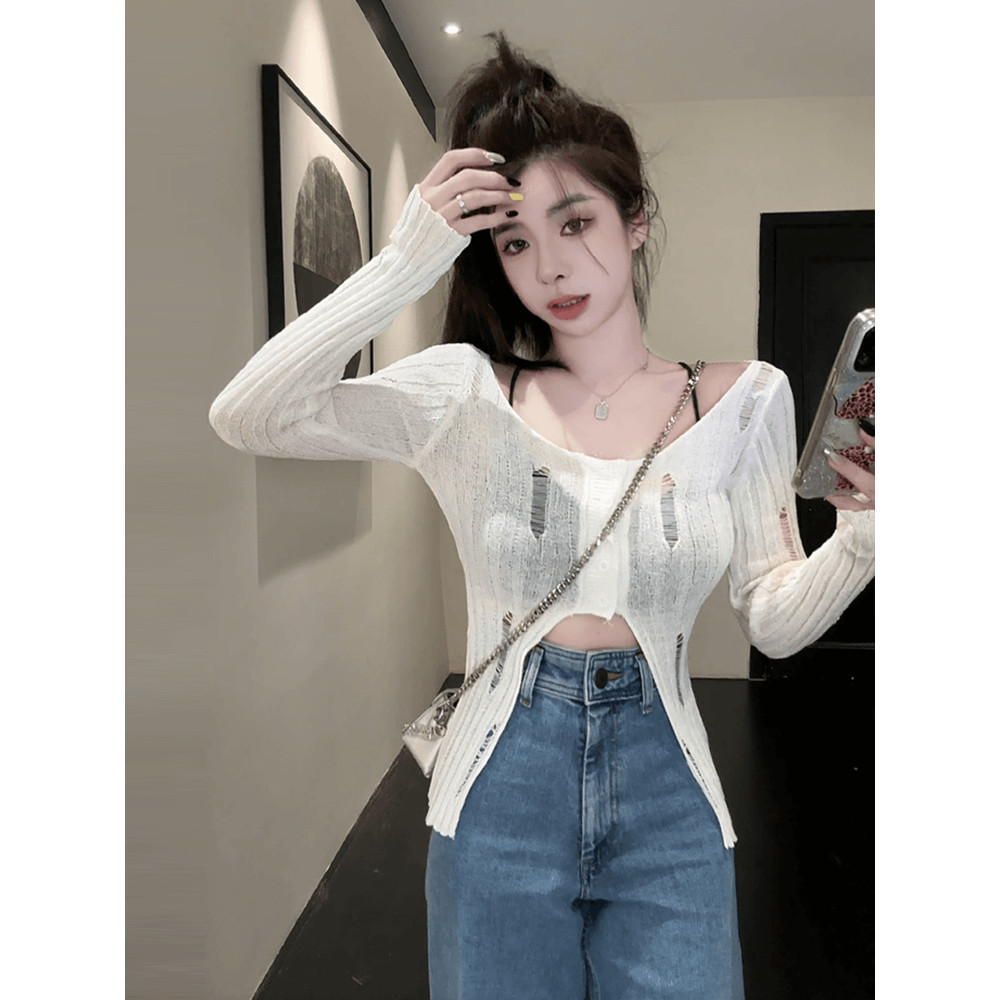 เสื้อยืด ไหมพรม แขนยาว คอวี นิมอลดีเทลขาดๆ #MT725