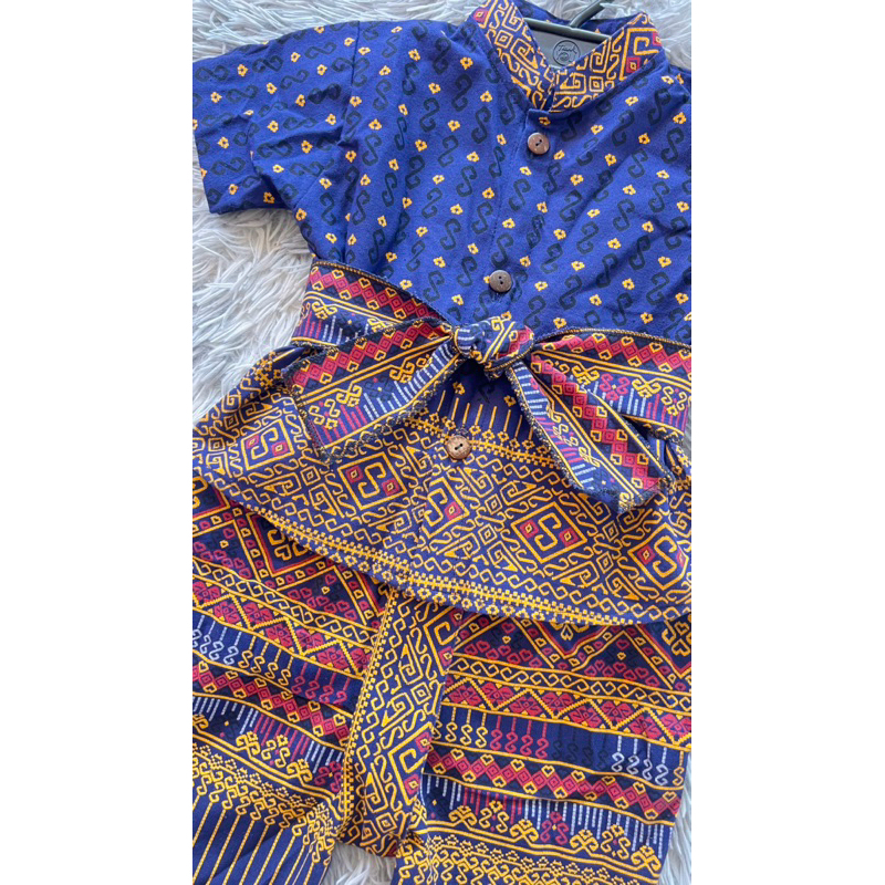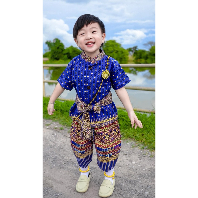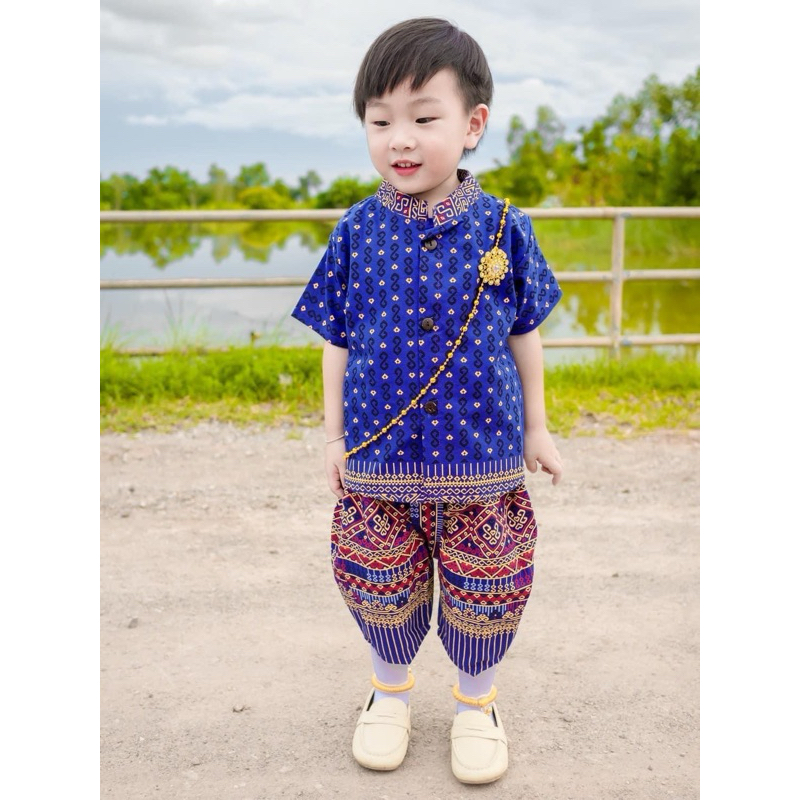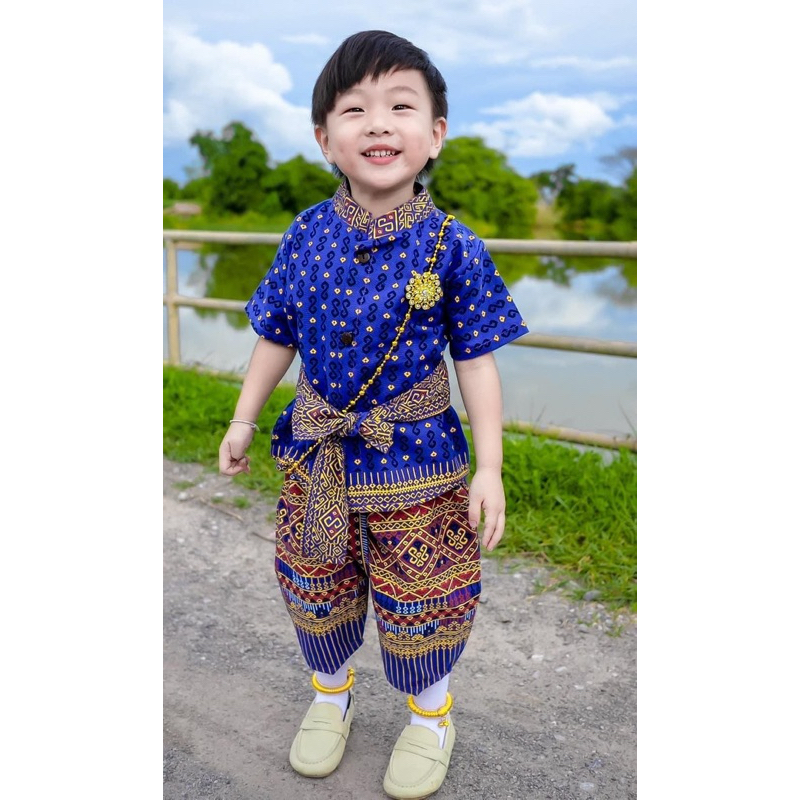 ?พร้อมส่ง?ชุดเด็กผ้าไทยลายตะขอสีน้ำเงินขับผิวดูผู้ดีมาก น่ารักสะดุดตา เนื้อผ้าฝ้ายพิมพ์ลายใส่สบายไม่ร้อนเซ็ท3ชิ้นเสื้อกับกางเกงโจงกระเบนและผ้าคาดเอว ชุดไทยเด็กประยุกต์ร่วมสมัยเพื่ออนุรักษ์วัฒนธรรมไทย