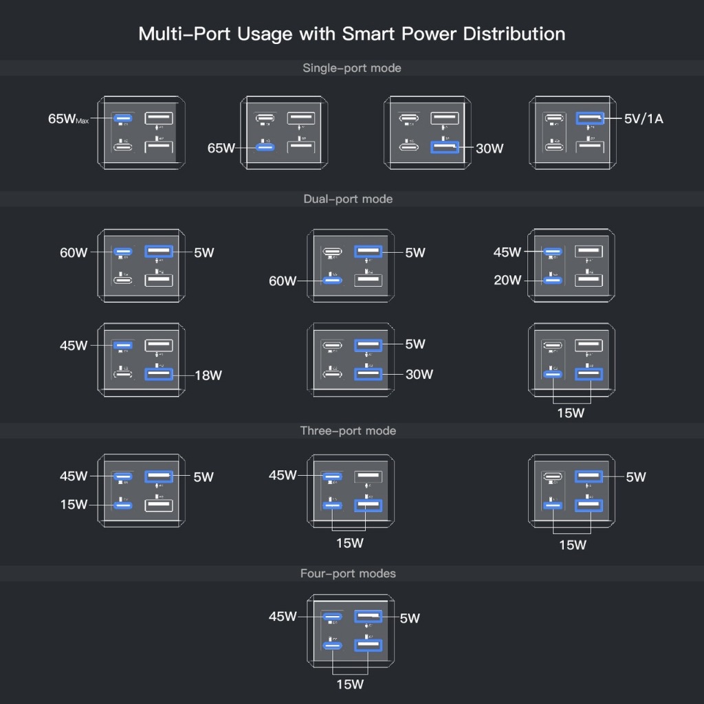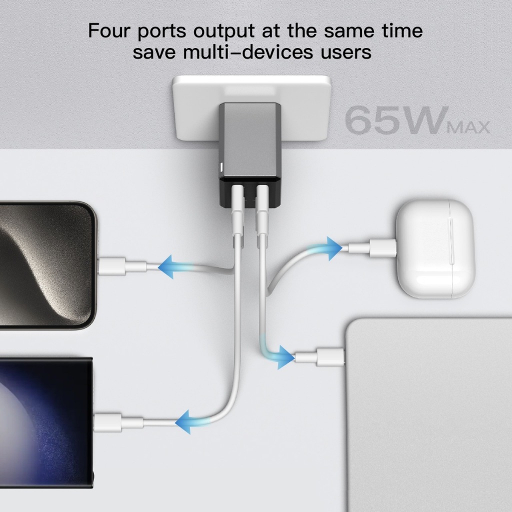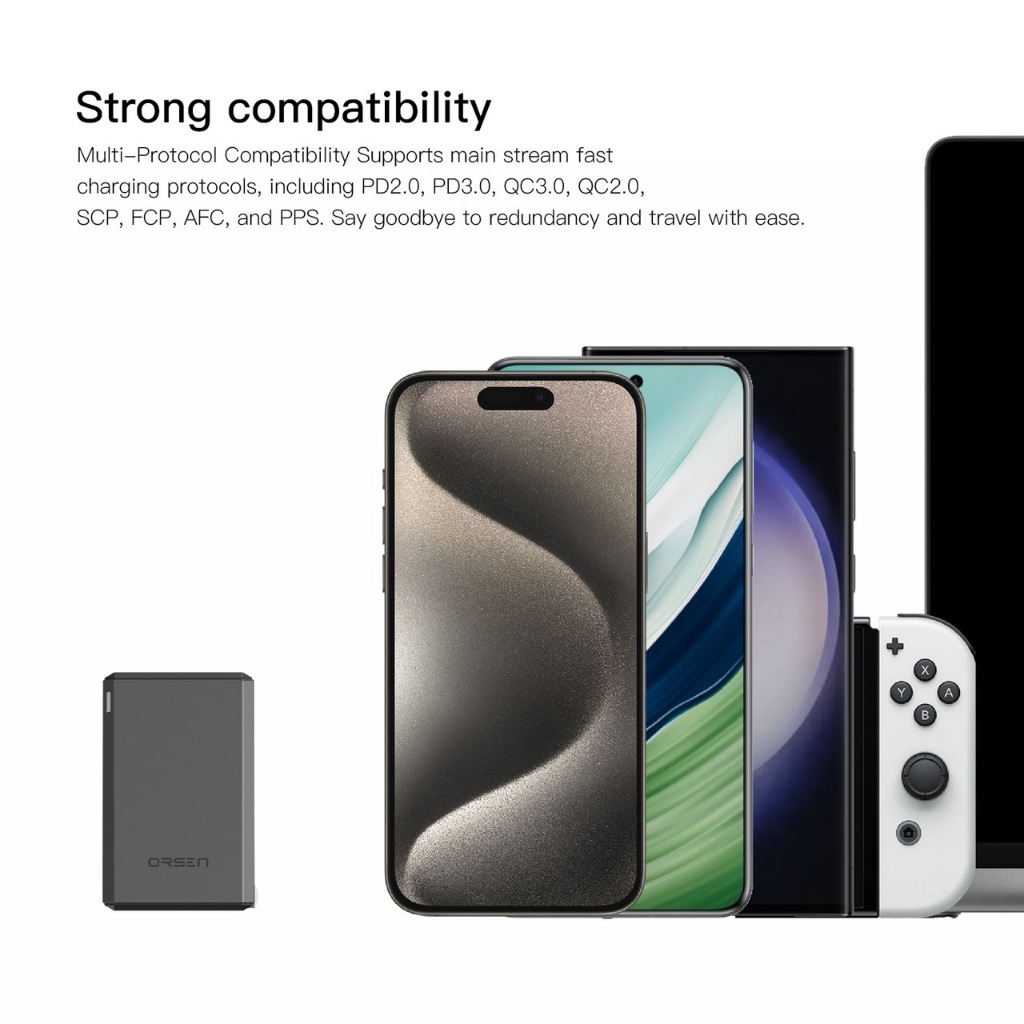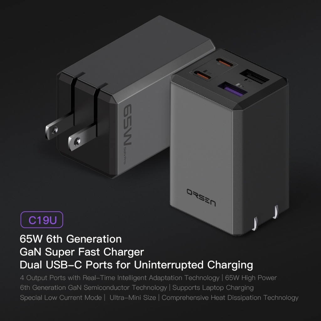 Orsen by Eloop C19U หัวชาร์จ GaN 65W 4 พอร์ต ที่สามารถรองรับการชาร์จเร็วเกือบทุกรูปแบบของอุปกรณ์ต่าง ๆ ที่มีอยู่บนท้องตลาด ด้วยเทคโนโลยี PD QC3.0 AFC FCP SCP และ PPS ที่รวมอยู่ในตัว พร้อมด้วยเทคโนโลยี GaN ที่ช่วยเพิ่มความสามารถให้ครบถ้วน และมีขนาดที่ไม่ให
