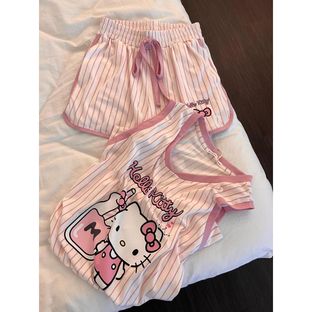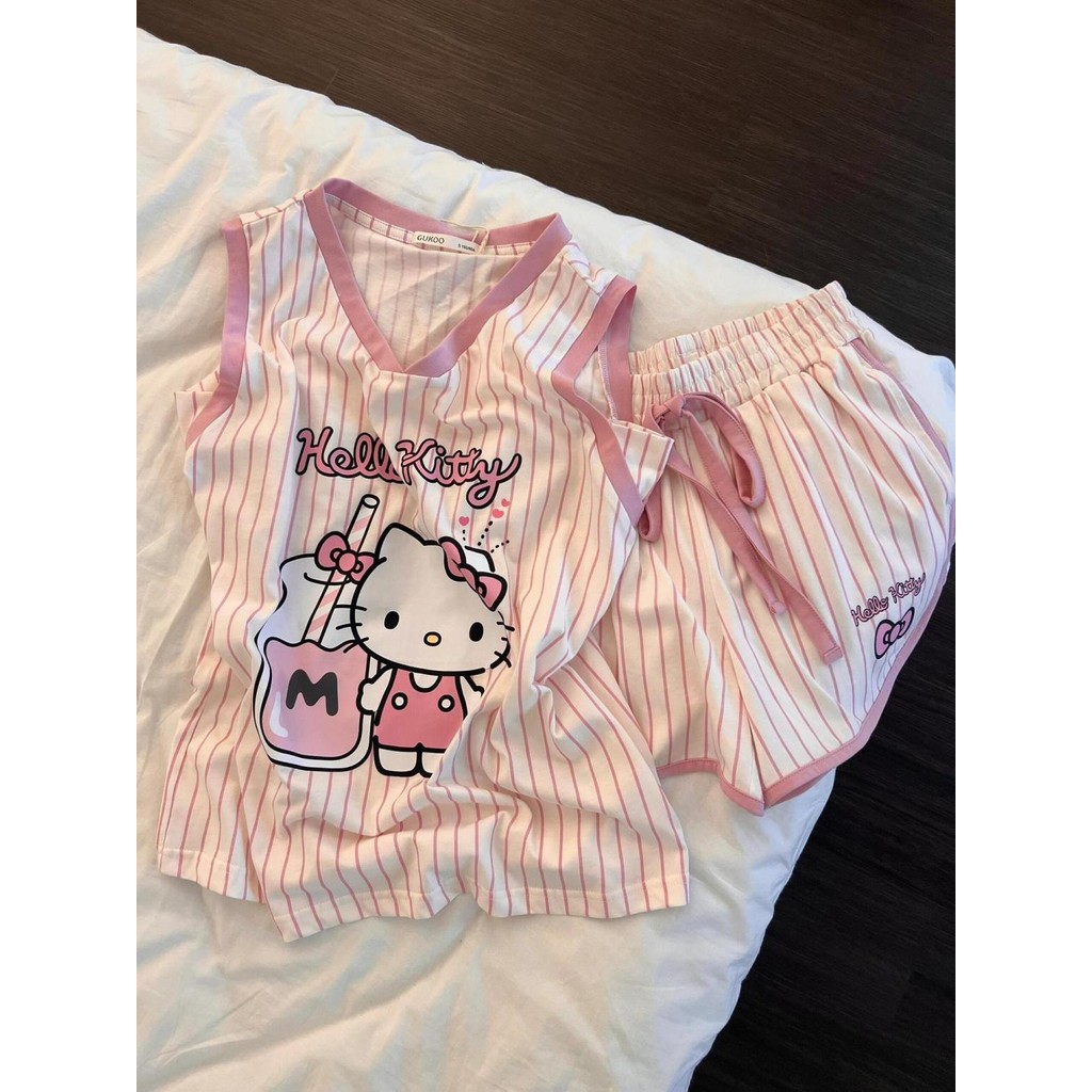 ชุดนอนผู้หญิง Hello Kitty สีชมพูน่ารัก แขนกุดขาสั้น ลายเส้นแนวตั้ง สำหรับฤดูร้อน