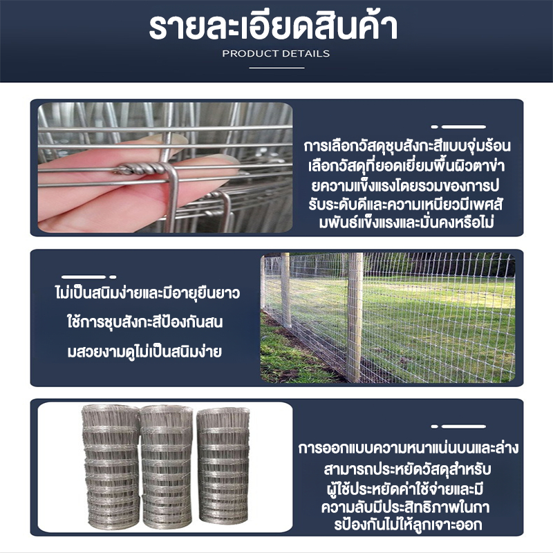 ลวดตาข่ายถักปม รั้วตาข่ายแรงดึง มีความยืดหยุ่นสูง คืนตัวกลับได้ดี และทนแรงกระแทก เหมาะสำหรับการใช้งานทั่วไป เช่น ล้อมรั้วบ้าน รั้วกั้นสัตว์ รั้วแพะ รั้วแกะ รั้วล้อมสวน รั้วตาข่ายล้อมพื้นที่ทางการเกษตรและล้อมสัตว์ได้เป็นอย่างดี แข็งแรงกว่าลวดทั่วไปตาข่ายด้
