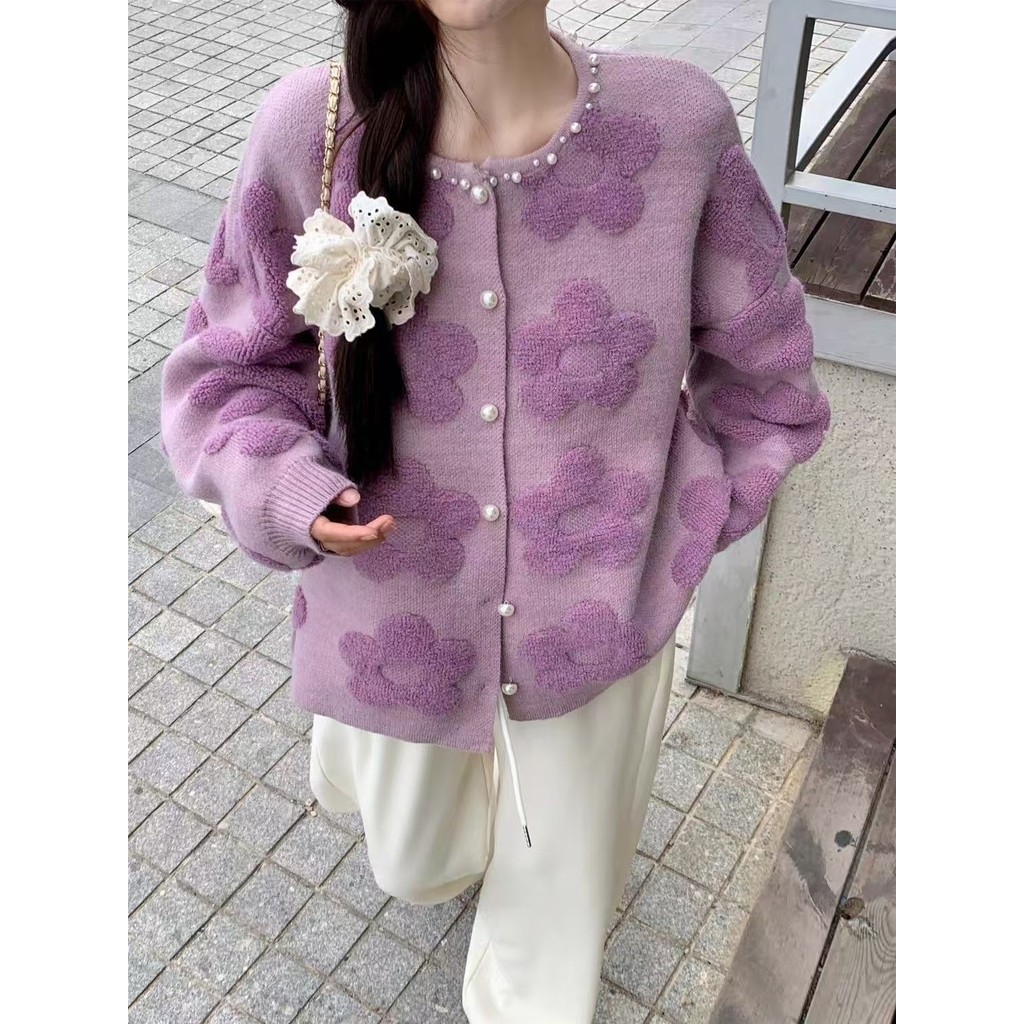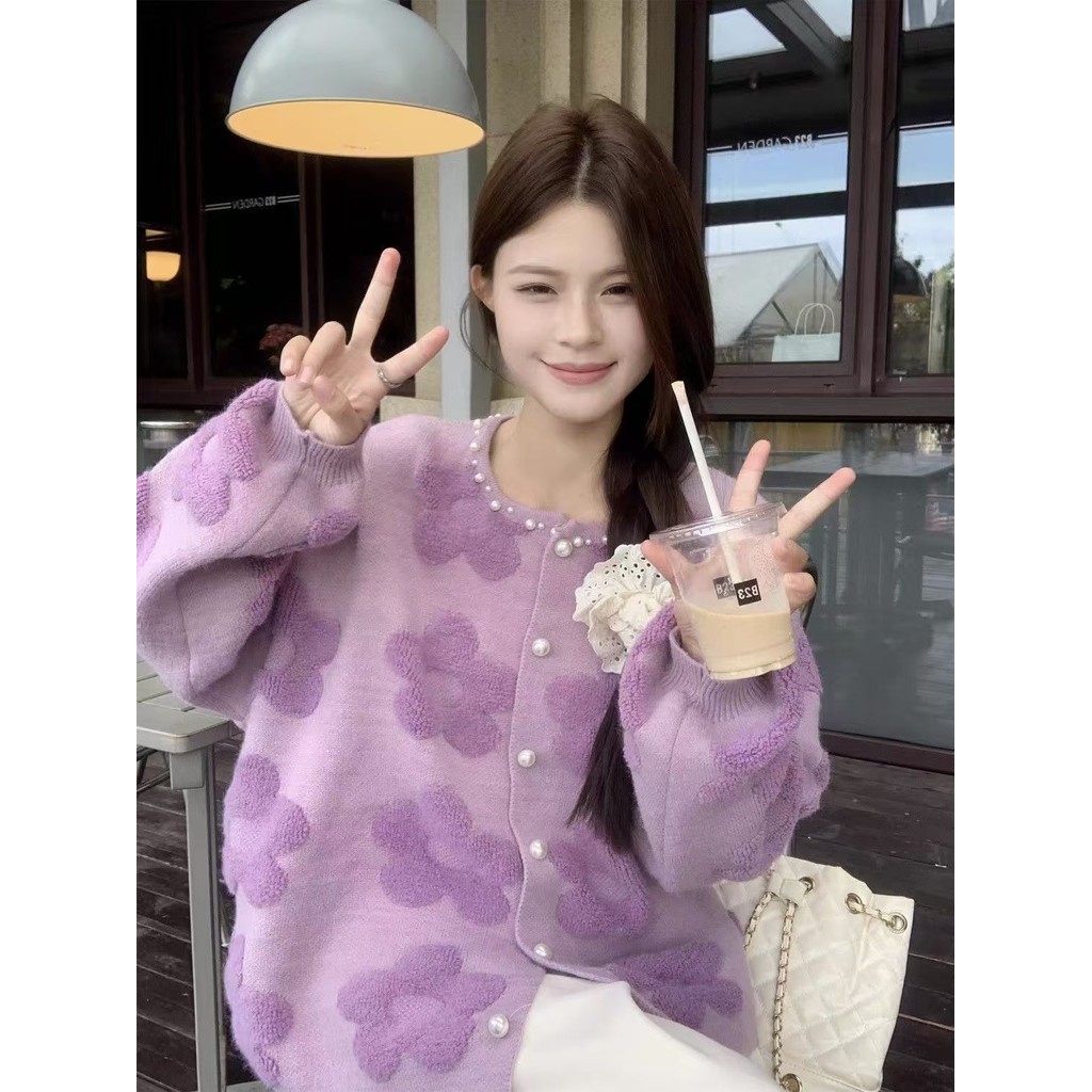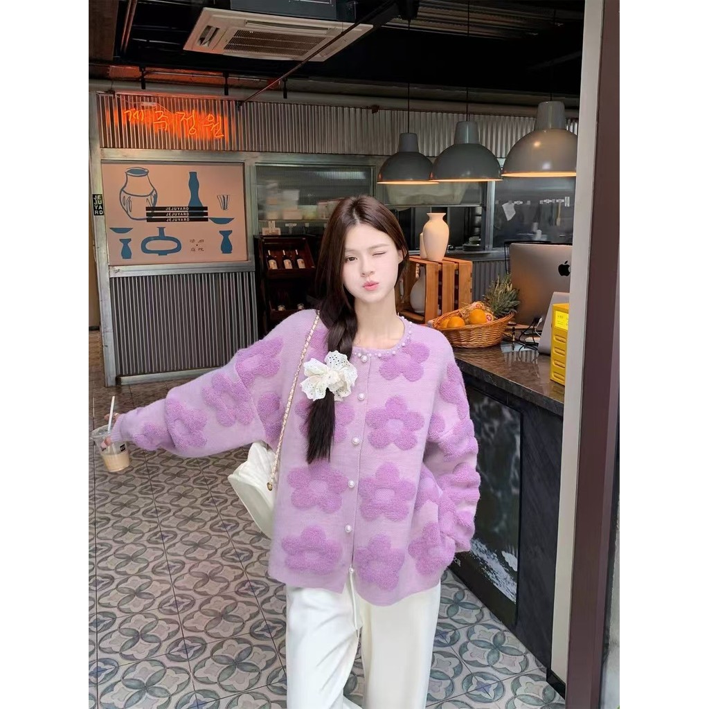 เสื้อกันหนาวแขนยาวสไตล์เกาหลี ฤดูใบไม้ร่วง-ฤดูหนาว สีม่วง ดีไซน์ลายดอกไม้พิเศษ