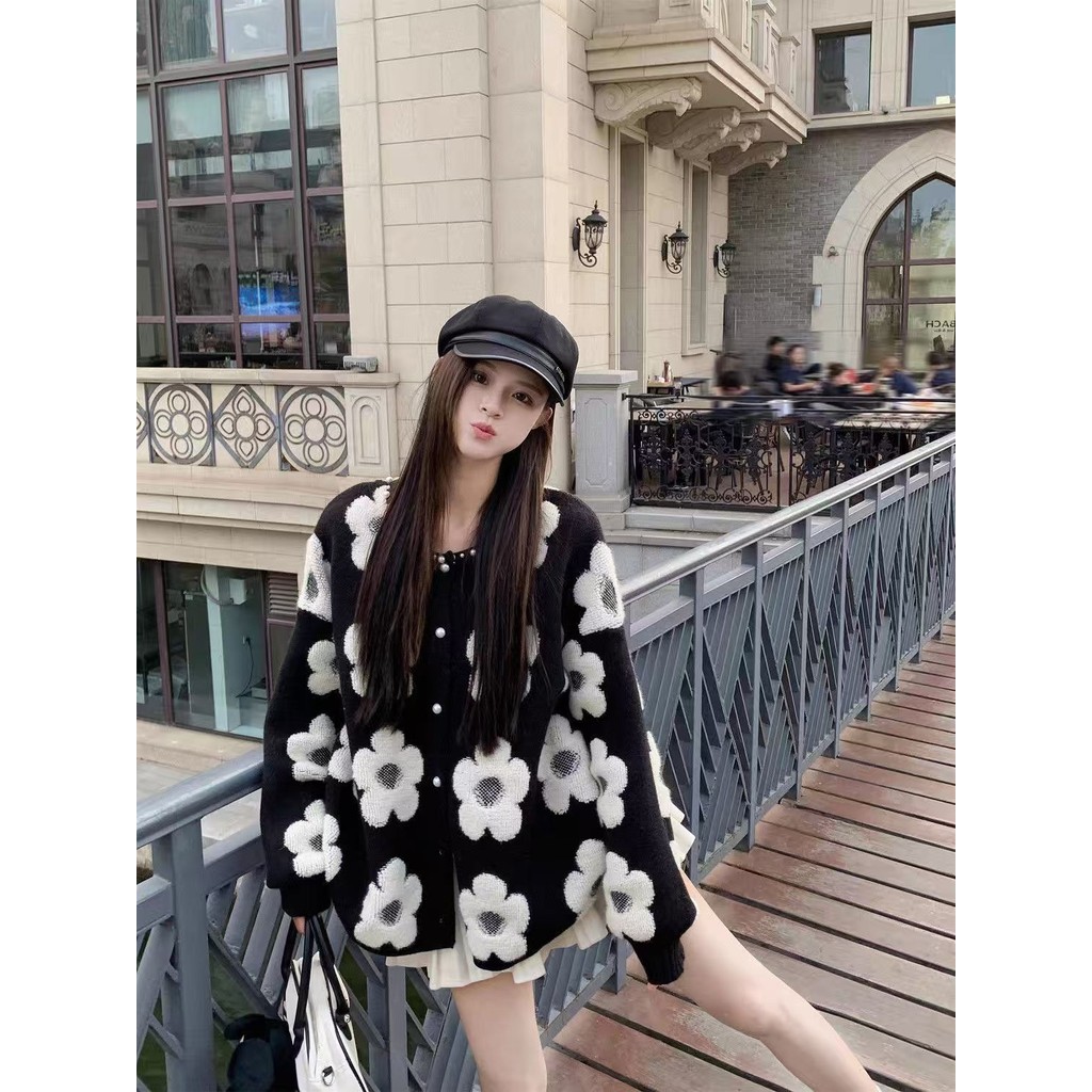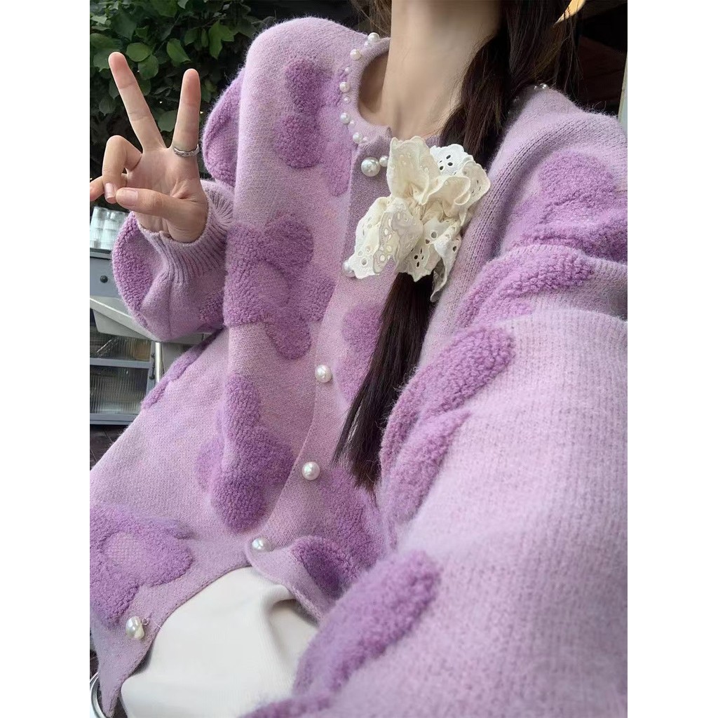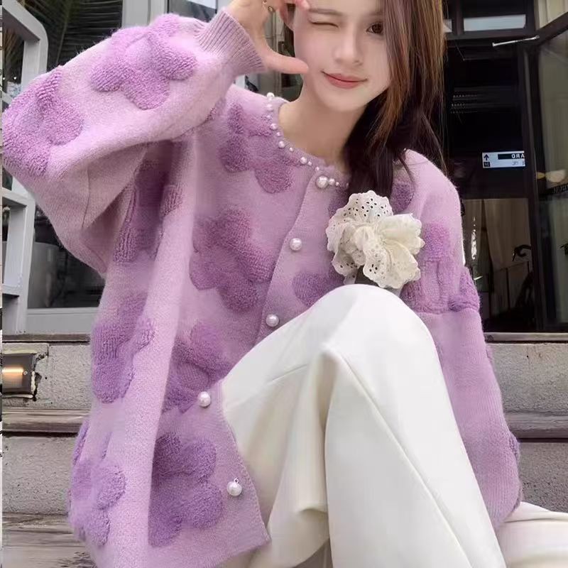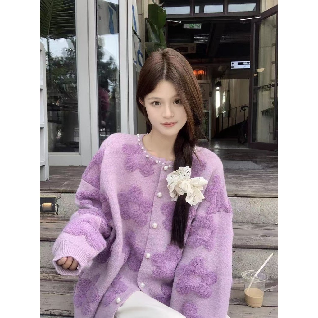 เสื้อกันหนาวแขนยาวสไตล์เกาหลี ฤดูใบไม้ร่วง-ฤดูหนาว สีม่วง ดีไซน์ลายดอกไม้พิเศษ