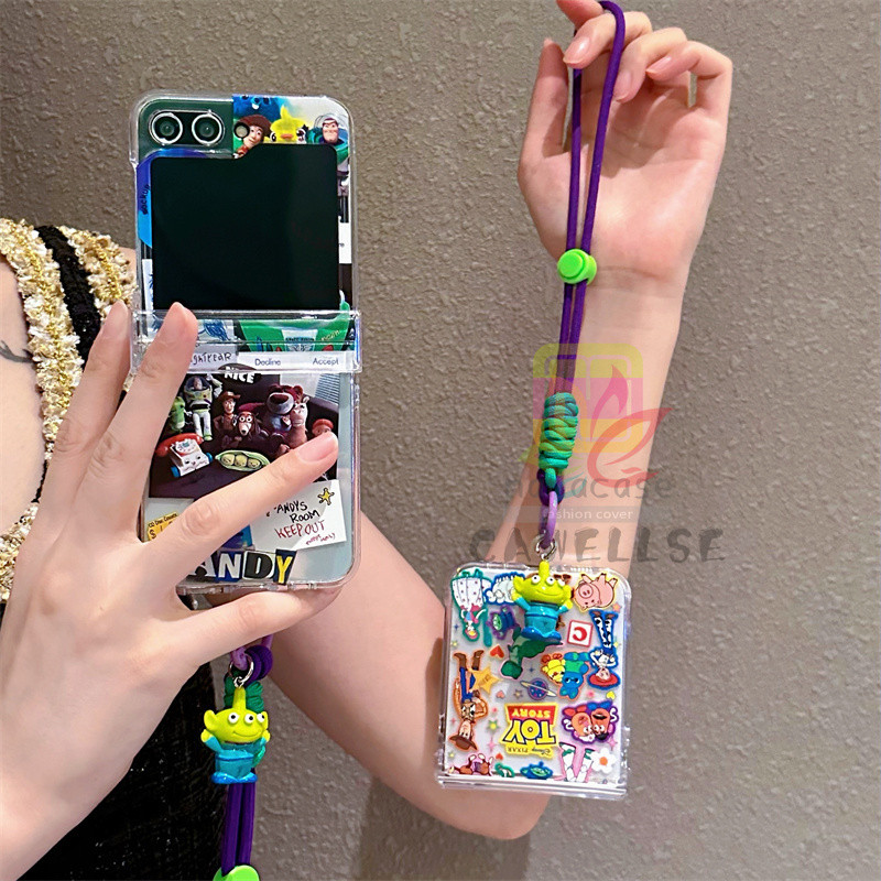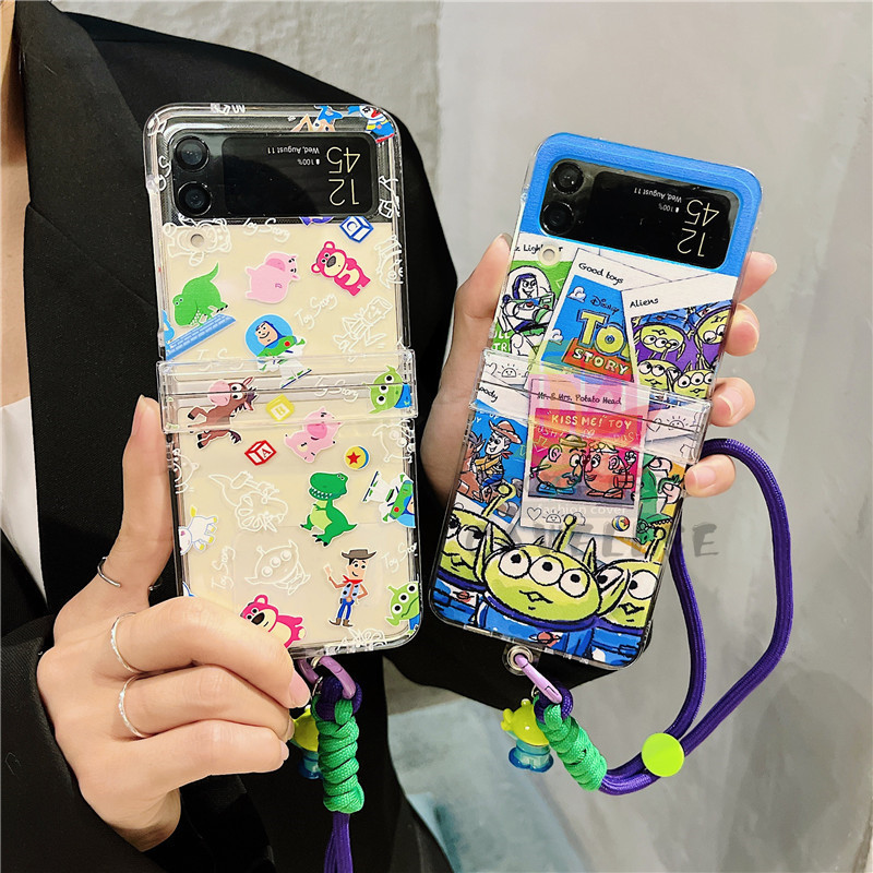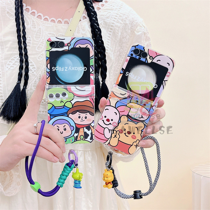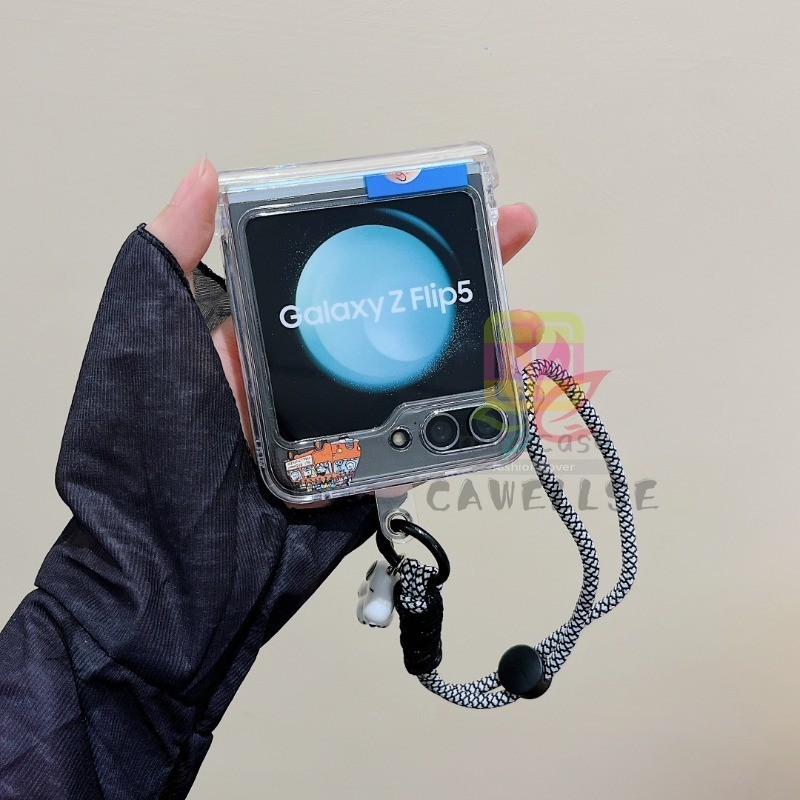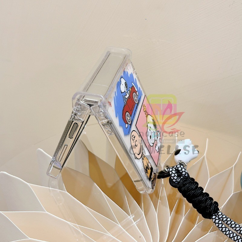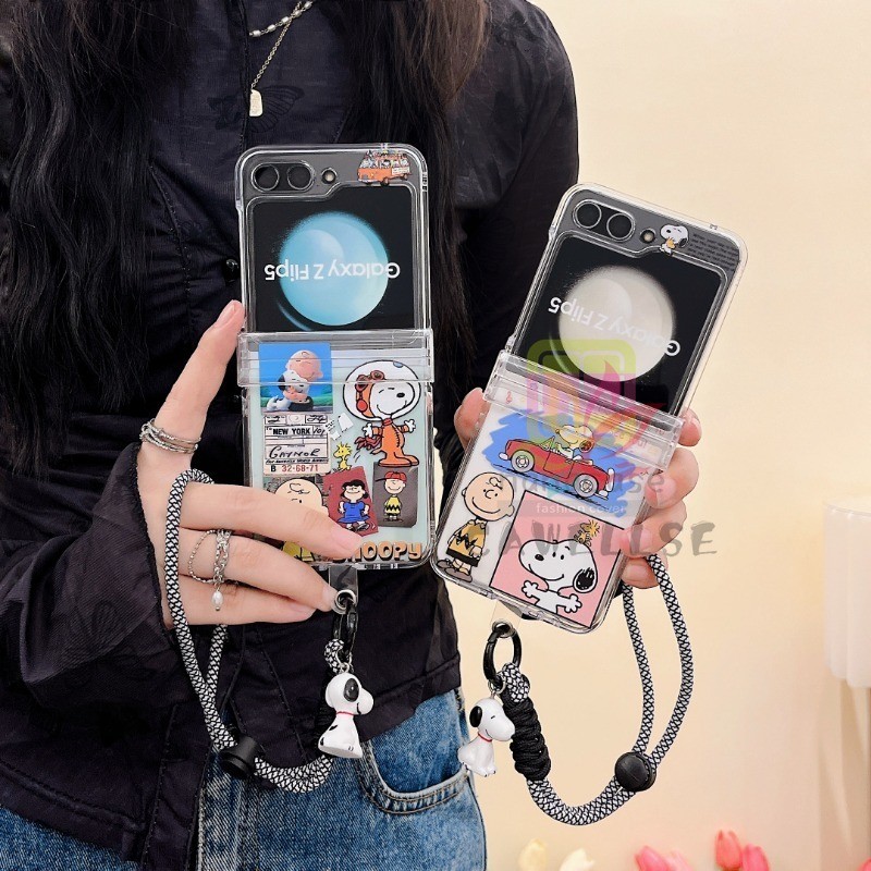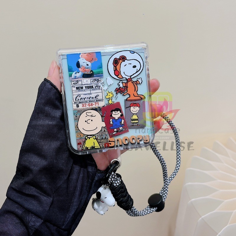 การ์ตูนน่ารักป้าย Snoopy เคสโทรศัพท์โปร่งใส 3 ชิ้นพร้อมสายคล้องมือ Samsung Galaxy Z Flip 6 Z Flip 5 Z Flip 4 Z Flip 3 บานพับ Hard Impact เคสป้องกัน Flip6 Flip5