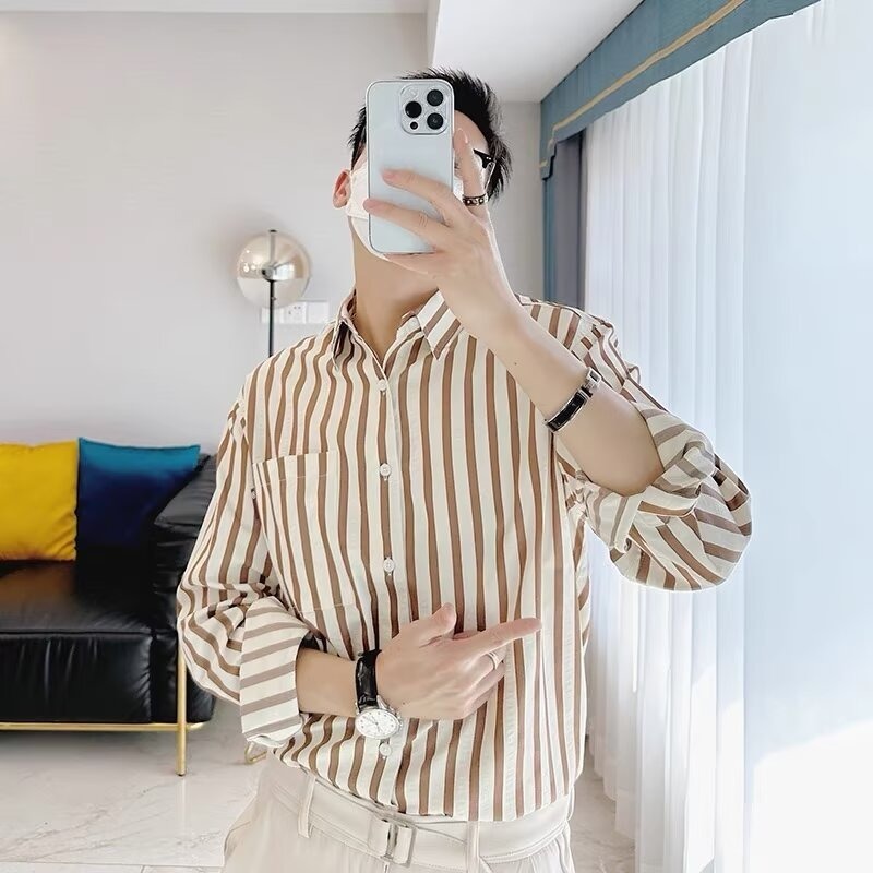 สีดําลายเสื้อแขนยาวผู้ชายสามสีM-3XL High-Endเกาหลีเก๋ด้านบนแสงผู้ใหญ่สไตล์ช่างทําผมStreetสวมชายเสื้อ