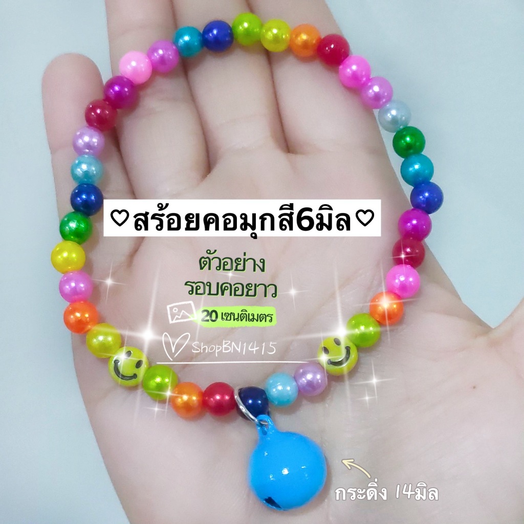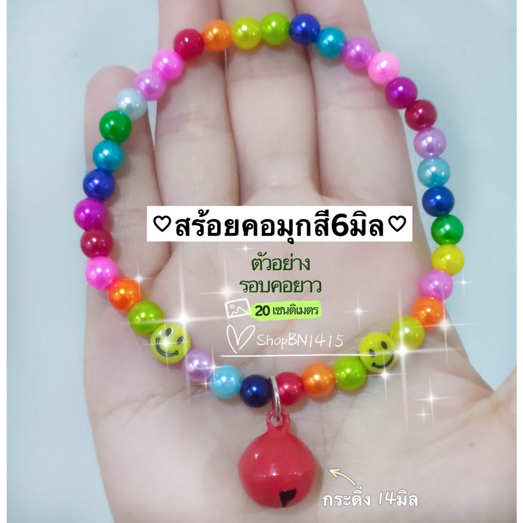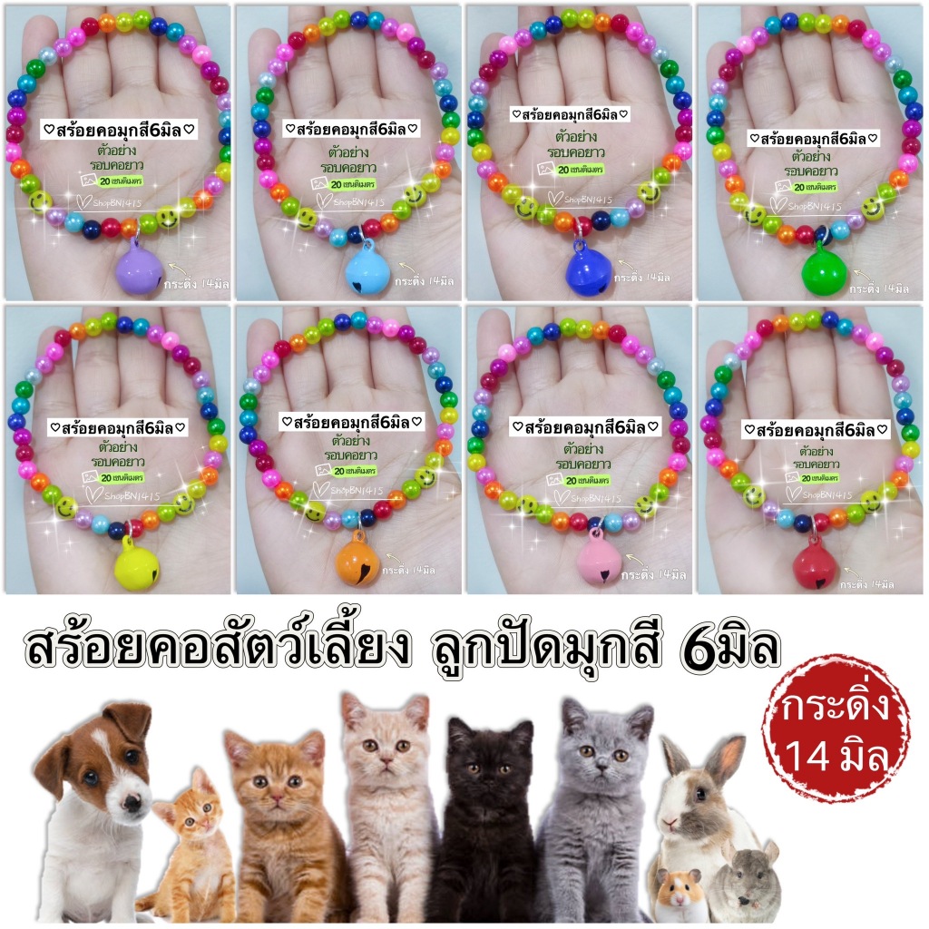 สร้อยคอ ปลอกคอ สัตว์ ไหมยืด ลูกปัดมุกสี ขนาด 6มิล กระดิ่ง(14มิล) น่ารักมาก มีหลายขนาด สำหรับสัตว์ขนาดเล็ก