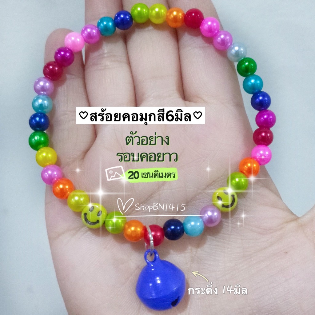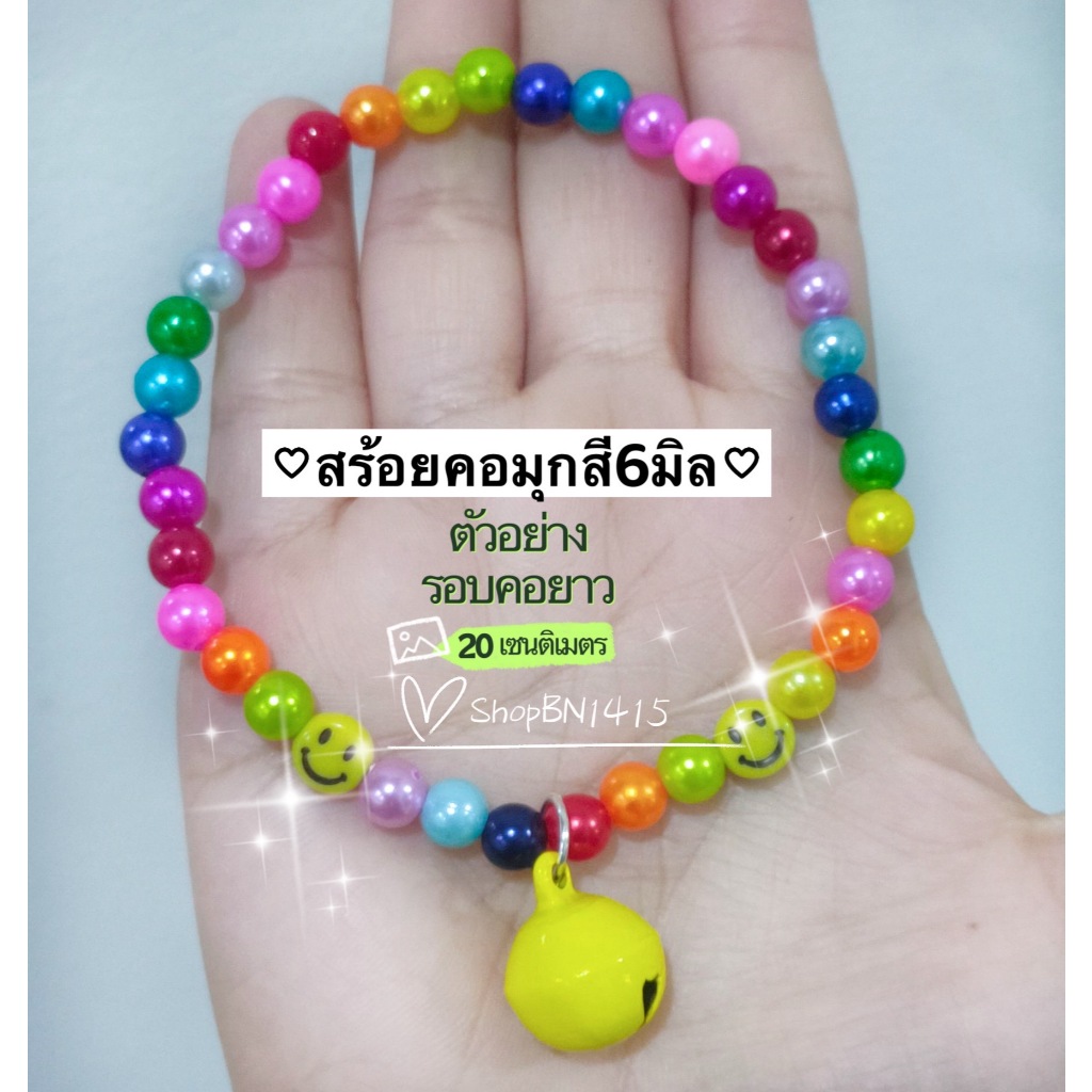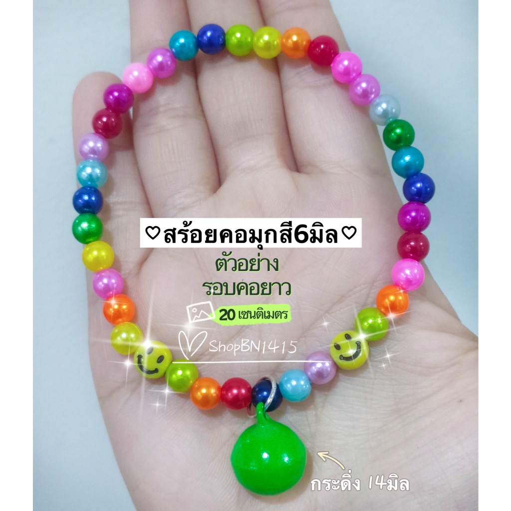 สร้อยคอ ปลอกคอ สัตว์ ไหมยืด ลูกปัดมุกสี ขนาด 6มิล กระดิ่ง(14มิล) น่ารักมาก มีหลายขนาด สำหรับสัตว์ขนาดเล็ก