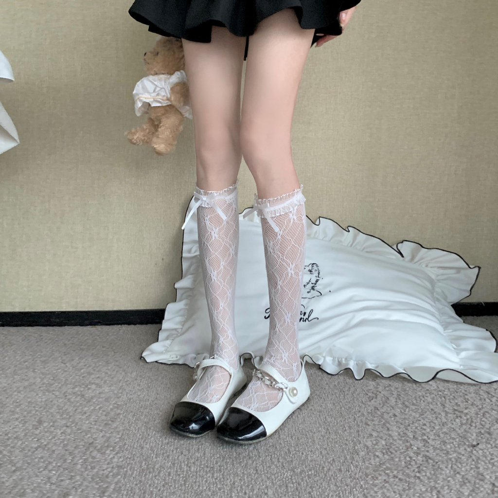 เจเค ถุงเท้าลูกไม้ประดับโบว์สีดําสไตล์ญี่ปุ่นโลลิต้าแฟชั่นสําหรับผู้หญิง