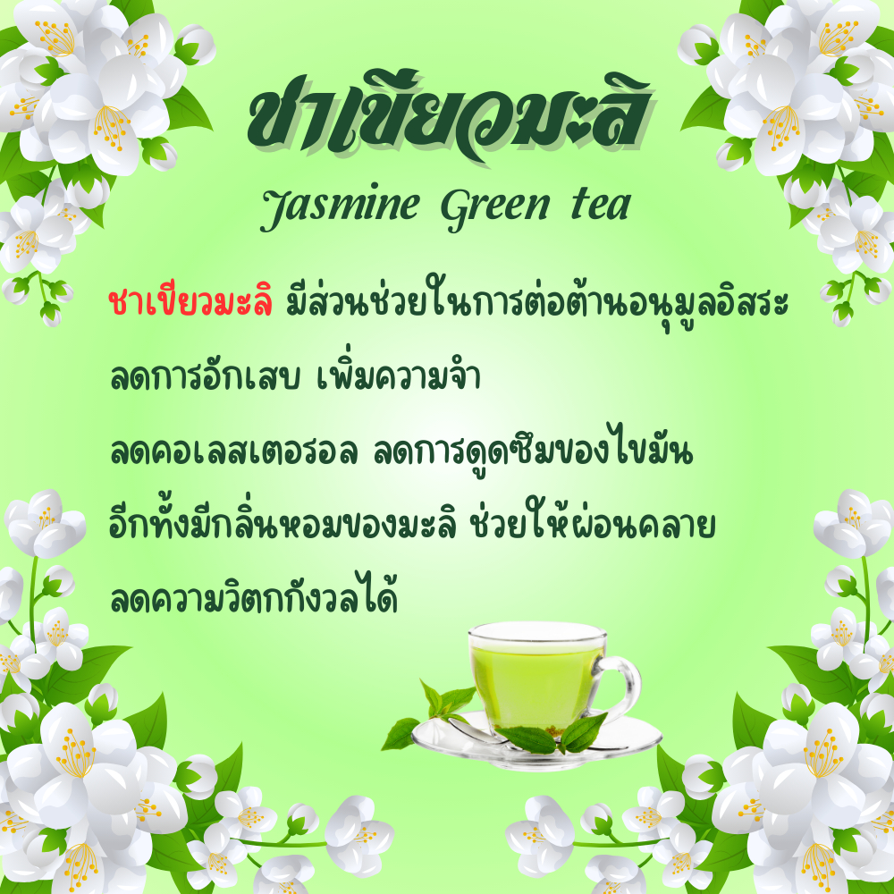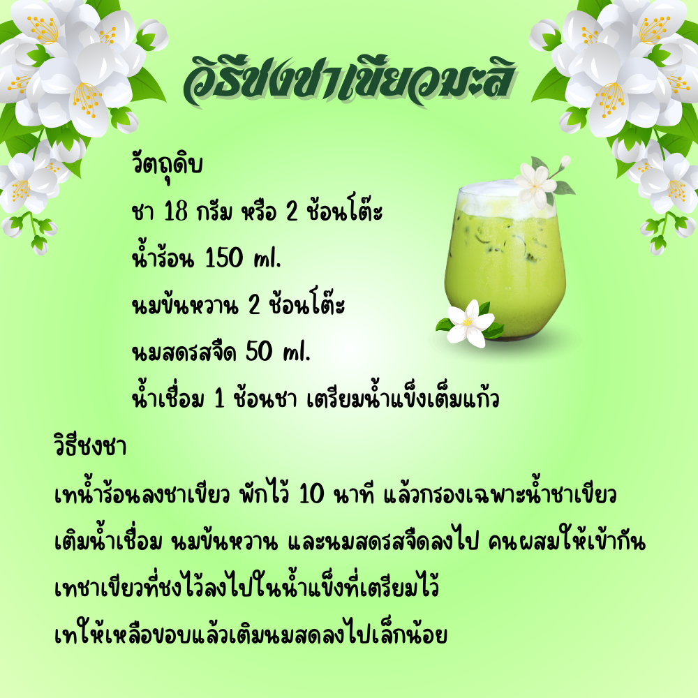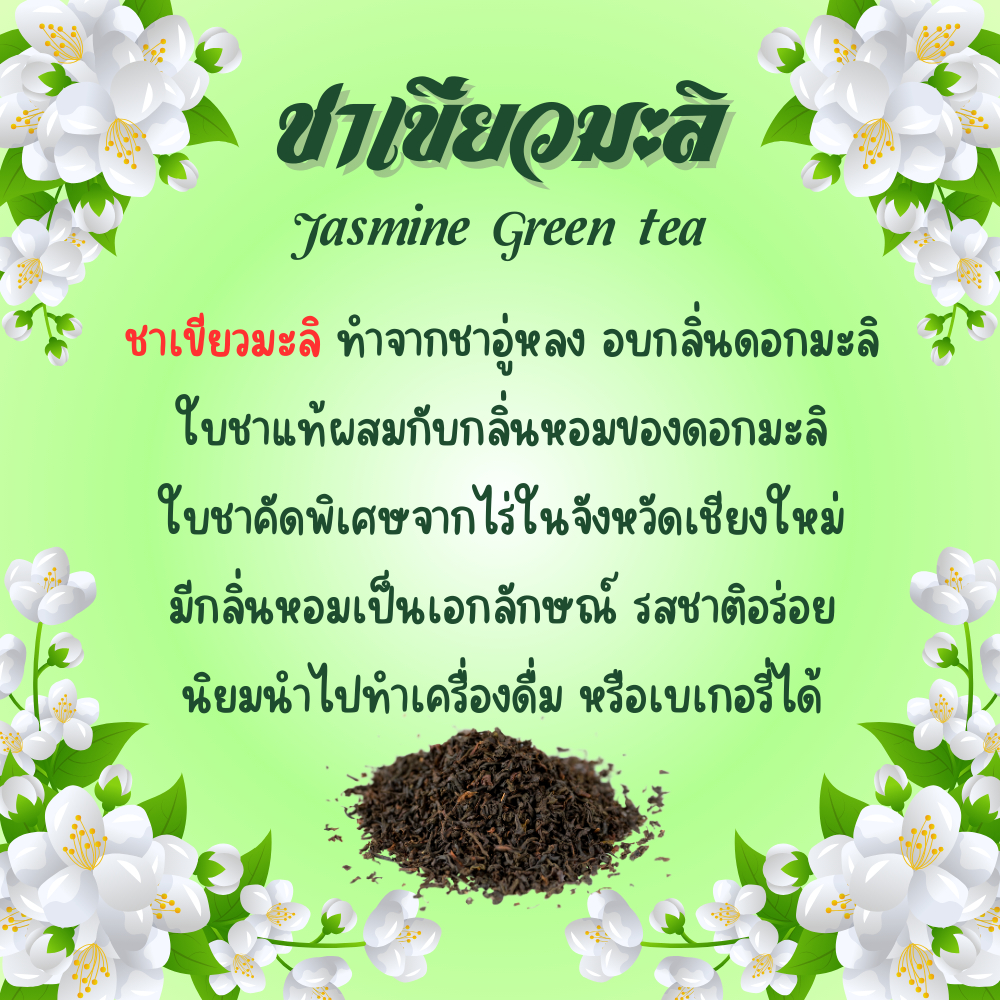 เป็นชาเขียว คัดเกรดพิเศษ อบกับกลิ่นดอกมะลิ