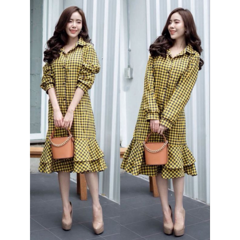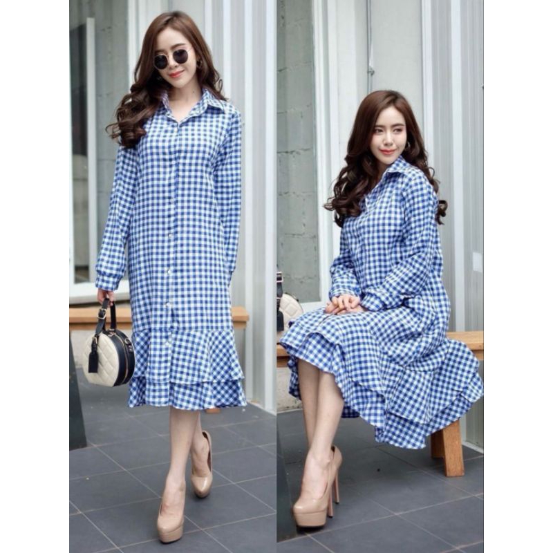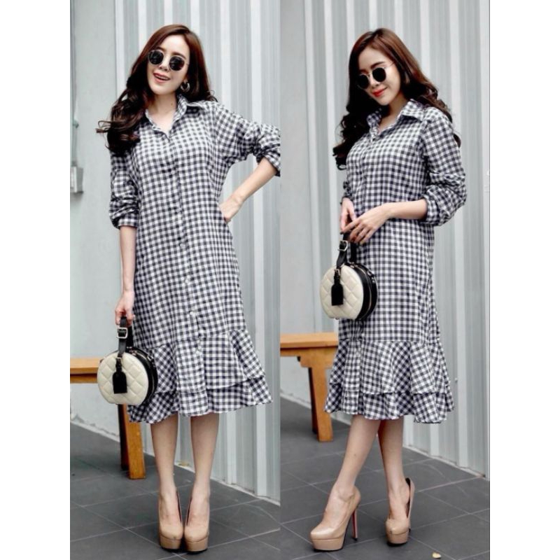 เชิ้ตเดรสกระดุมหน้าแขนยาวกระโปรงระบายชาย2ชั้น มาพร้อมกระเป๋าเจาะข้างทั้ง2ด้าน ชุดเดียวเอาอยู่เลยค่ะ เนื้อผ้าทอลายสก้อตสวมใส่สบาย