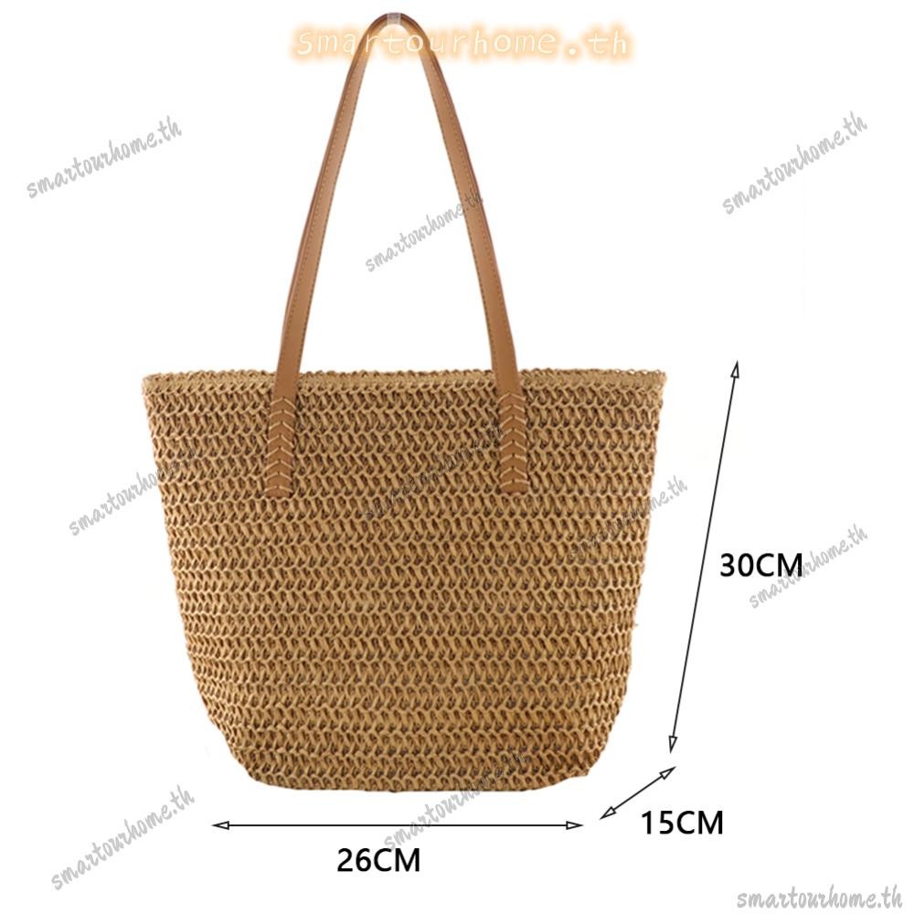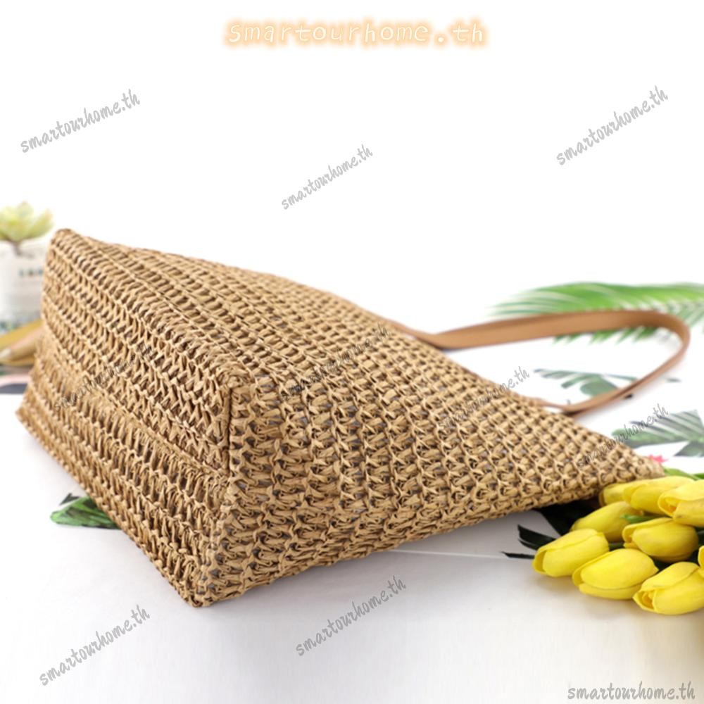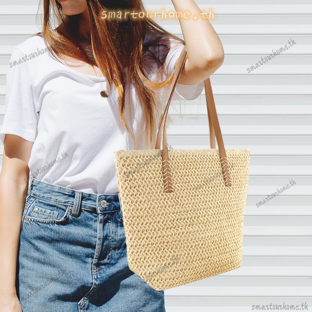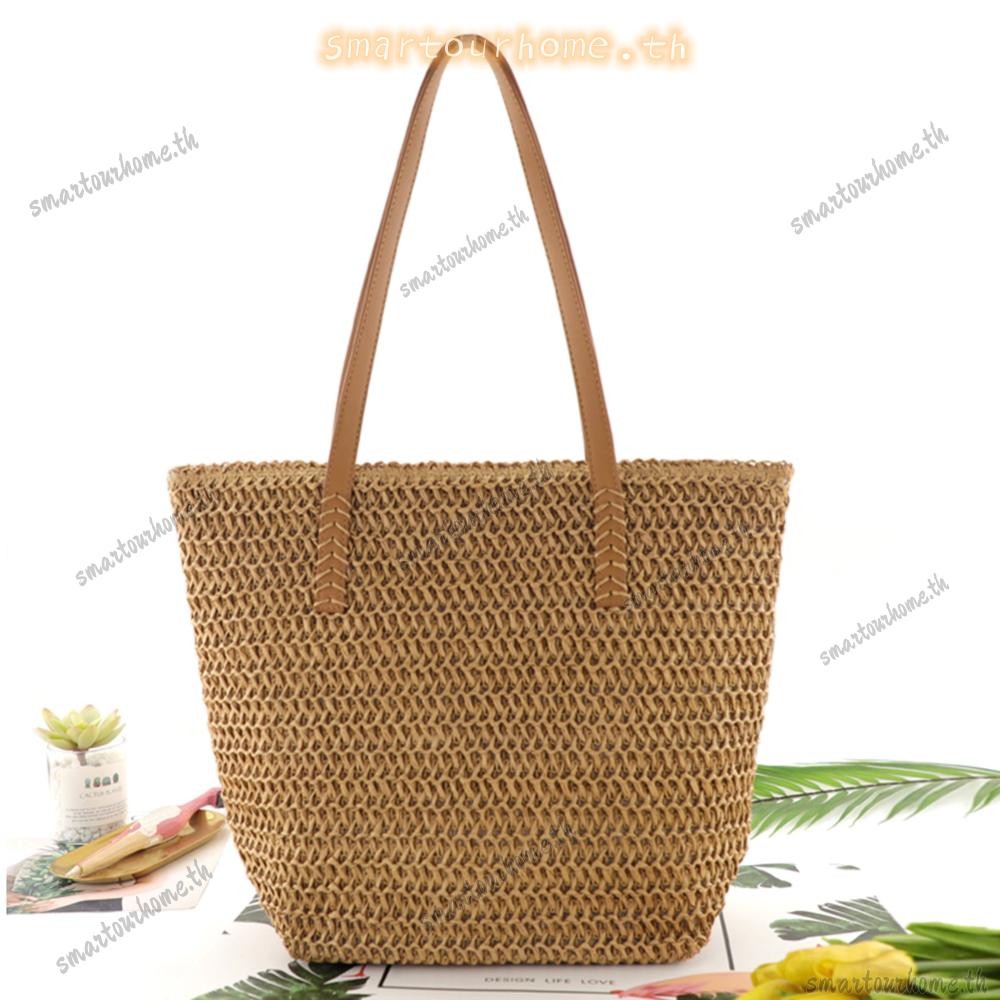 รุงเทพฯ มีสินค้าในสต็อก? กระเป๋าถือสีทึบทอมือผู้หญิงชายหาดความจุขนาดใหญ่กระเป๋าหูหิ้วด้านบน