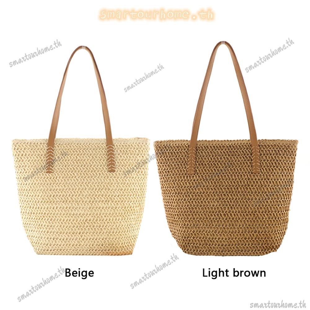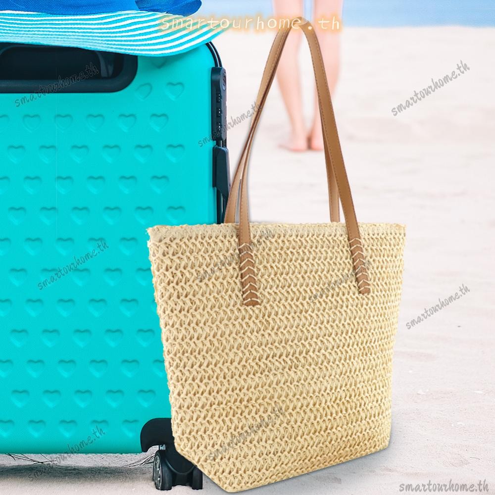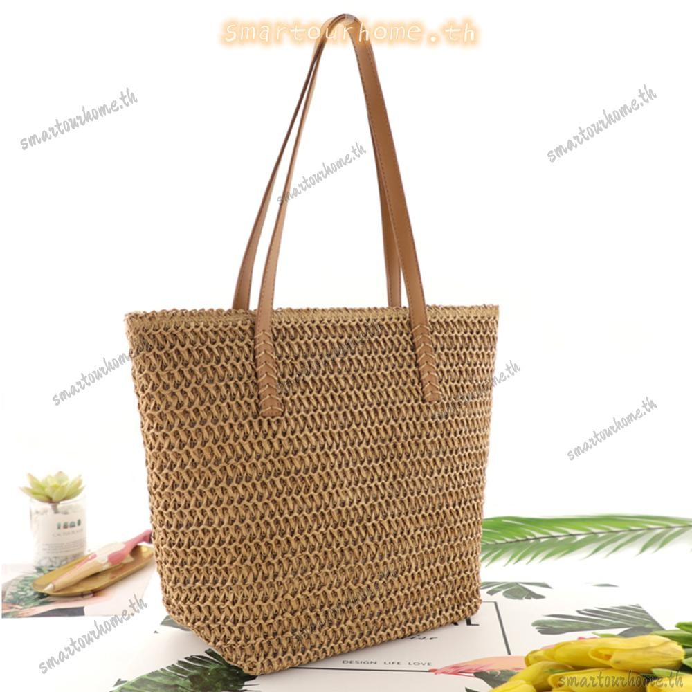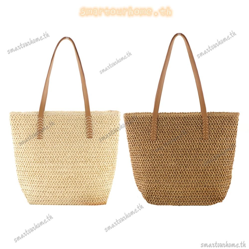 รุงเทพฯ มีสินค้าในสต็อก? กระเป๋าถือสีทึบทอมือผู้หญิงชายหาดความจุขนาดใหญ่กระเป๋าหูหิ้วด้านบน