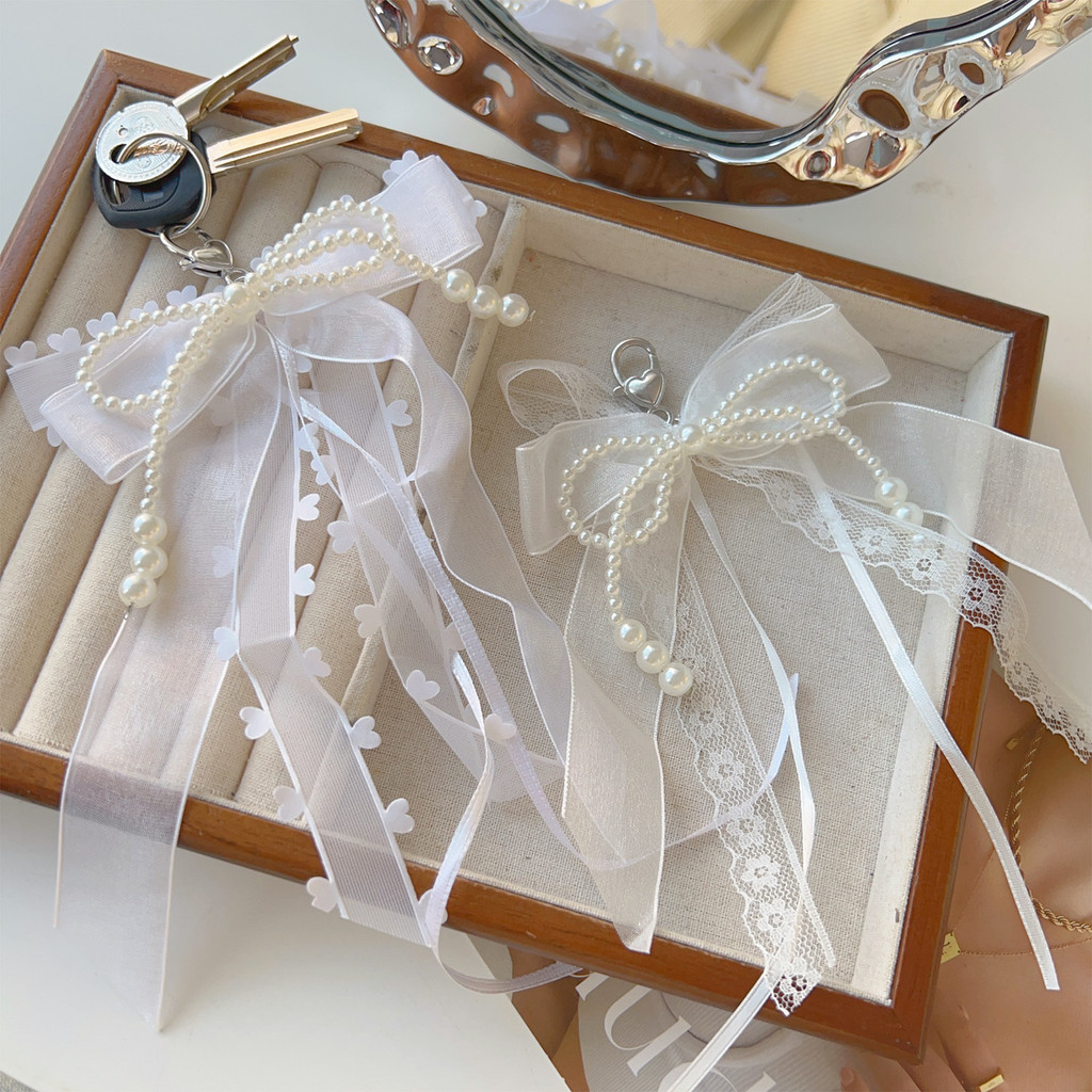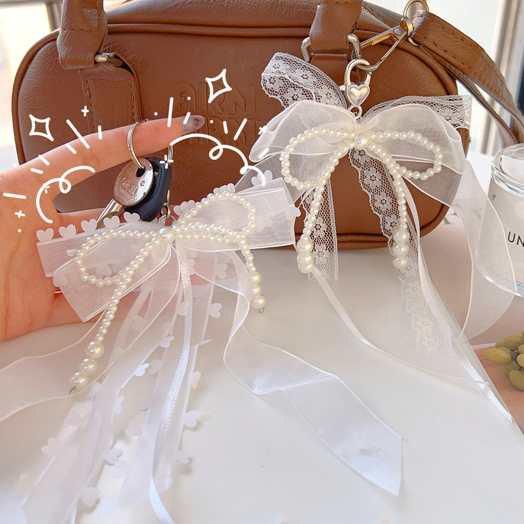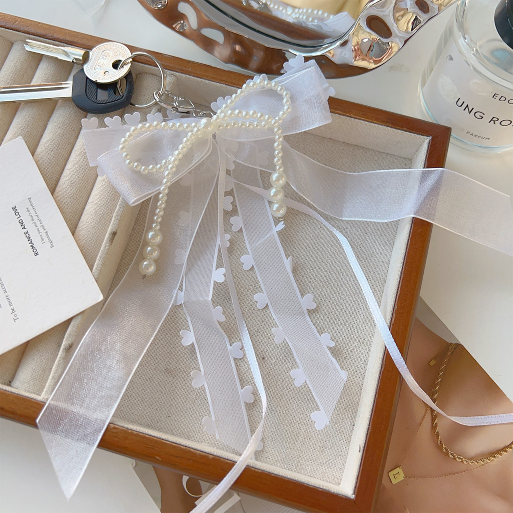 Sweet Girls Pearls Bead String Bowknot พวงกุญแจ – แฟชั่น Aesthetic Pearls ริบบิ้นโบว์จี้พวงกุญแจผู้หญิงกระเป๋าแขวนอุปกรณ์ตกแต่ง