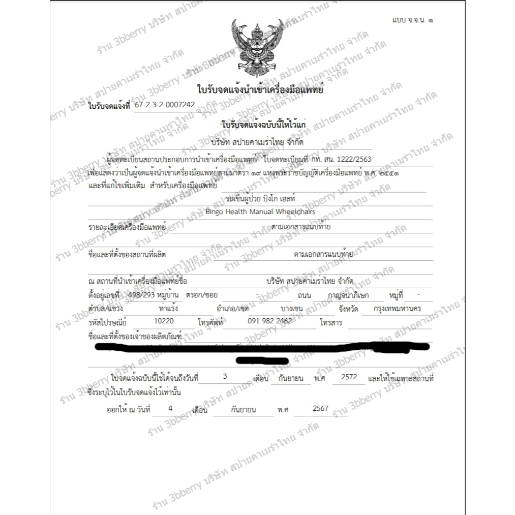 ใบรับจดแจ้ง นำเข้าเครื่องมือแพทย์ เลขที่ 67-2-3-2-0007242