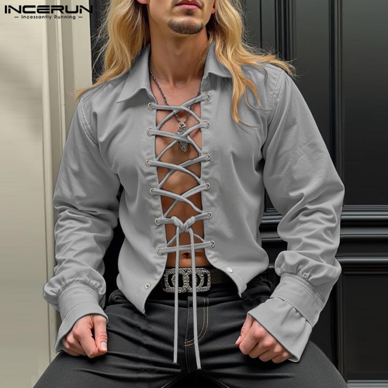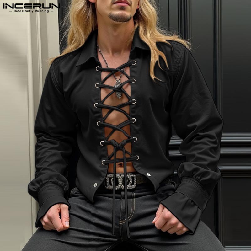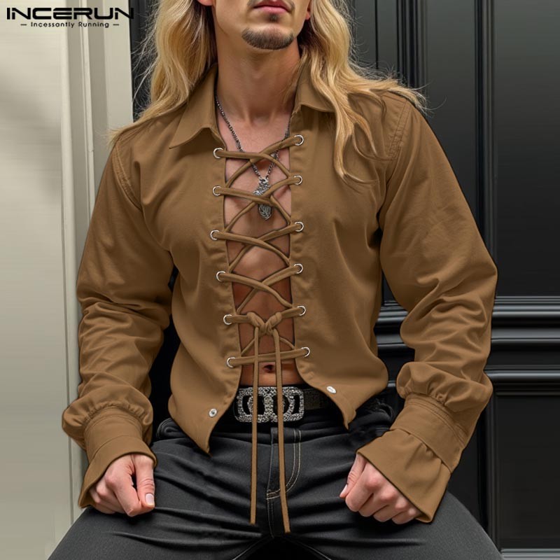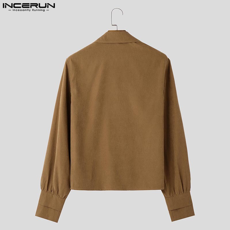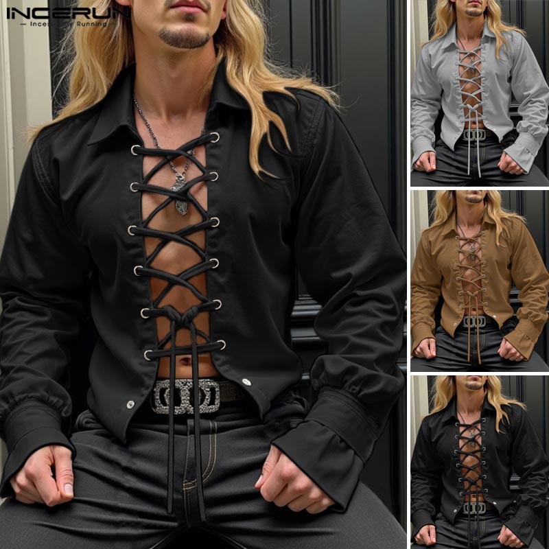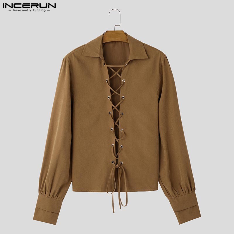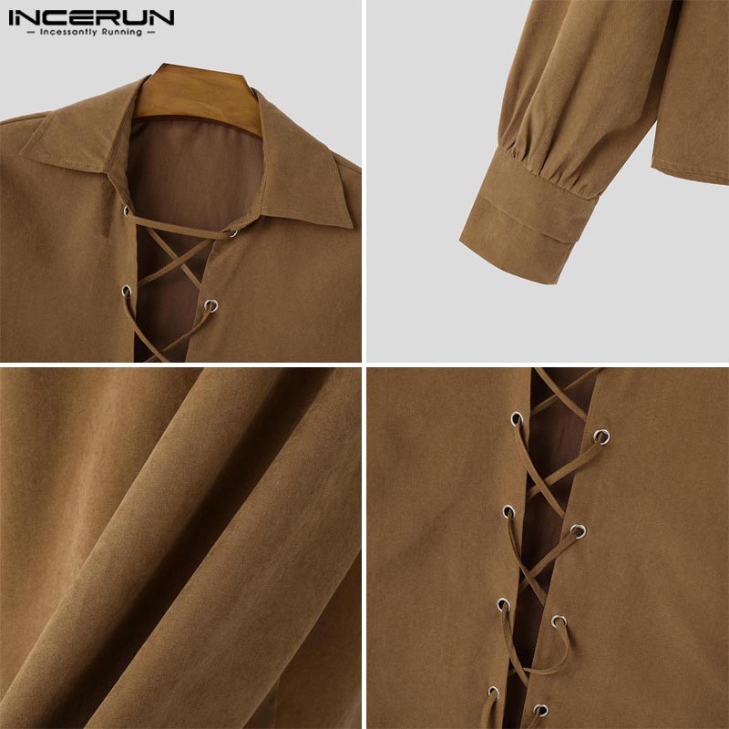 Incerun เสื้อเชิ้ตแขนยาวดีไซน์ผูกเชือกลําลองสําหรับบุรุษวินเทจทุกวัน
