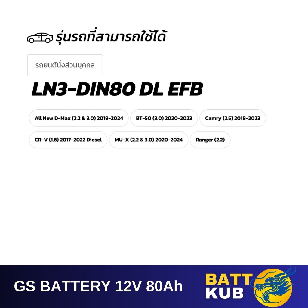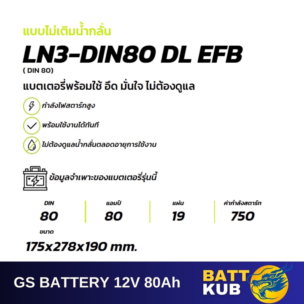 GS Battery LN3-DIN80 ISS ระบบ Start Stop 80 แอมป์ แบตขั้วจม แบตรถกระบะ ไฟแรง ใหม่จากโรงงาน มีรับประกัน 1ปี