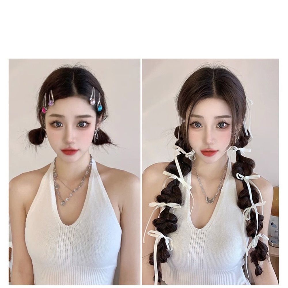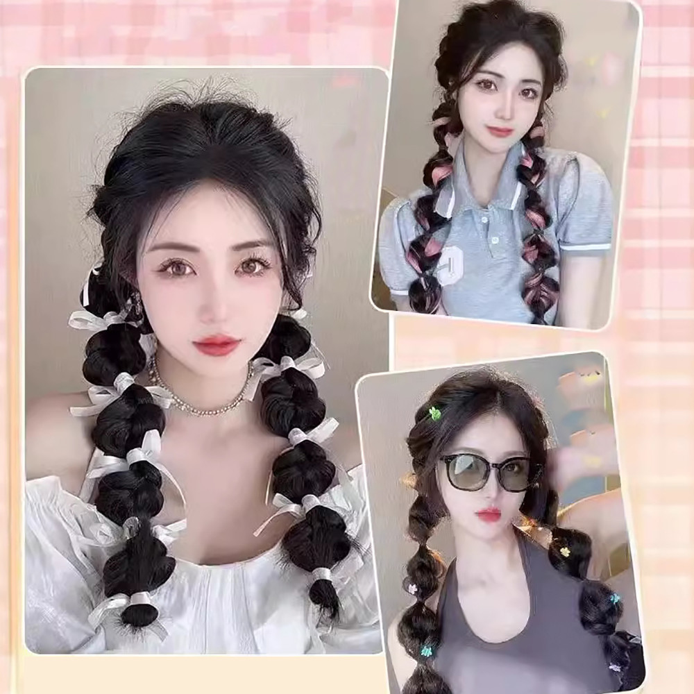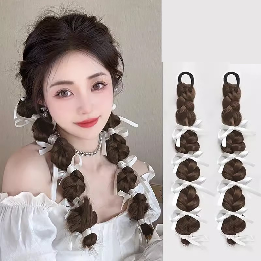 เพิ่มสไตล์ของคุณด้วยวิกผมบิดเกลียว Y2K Girl Ribbon Bowknot Bubble Braid ที่มีหางม้าคู่อินเทรนด์