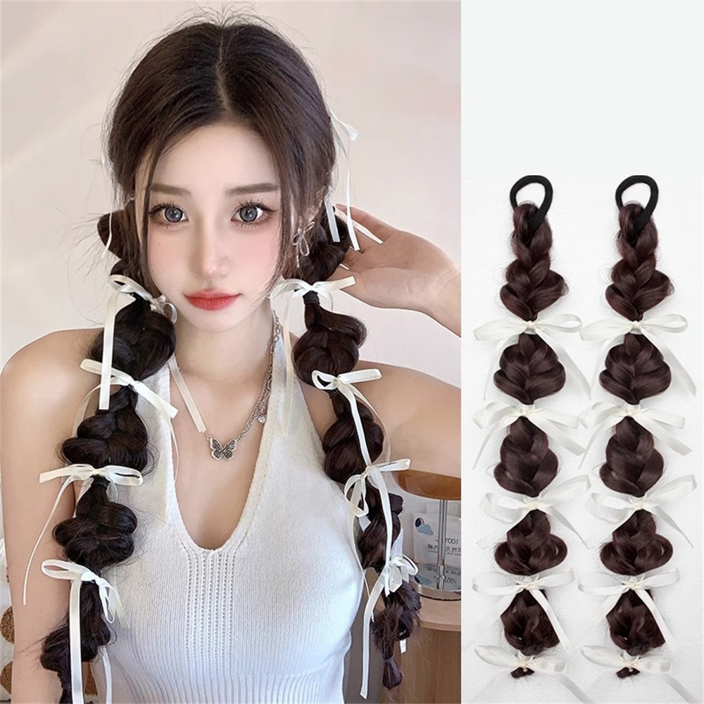 แฟชั่นริบบิ้น Bowknot Bubble Braid Twisted Wigs Y2K สาวมวย Double Ponytail Extension