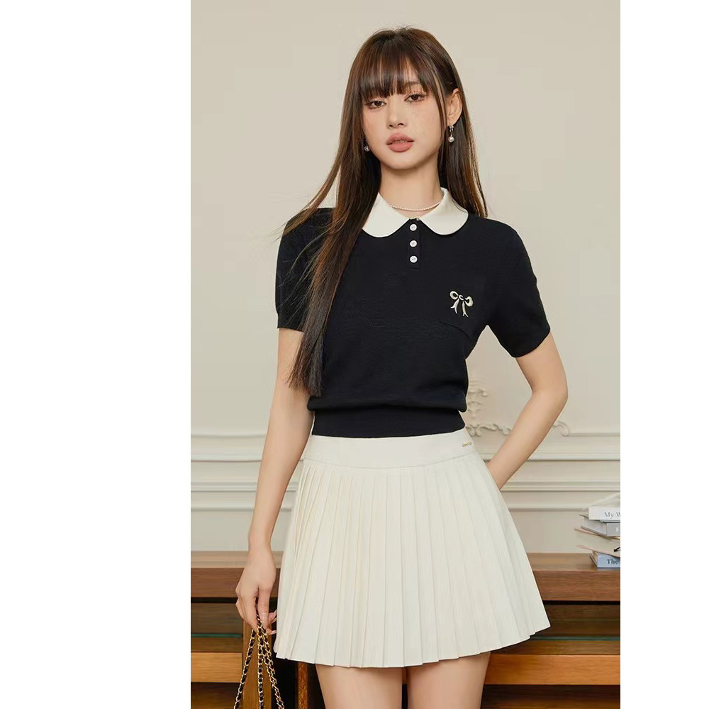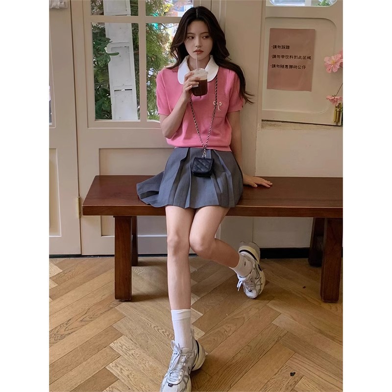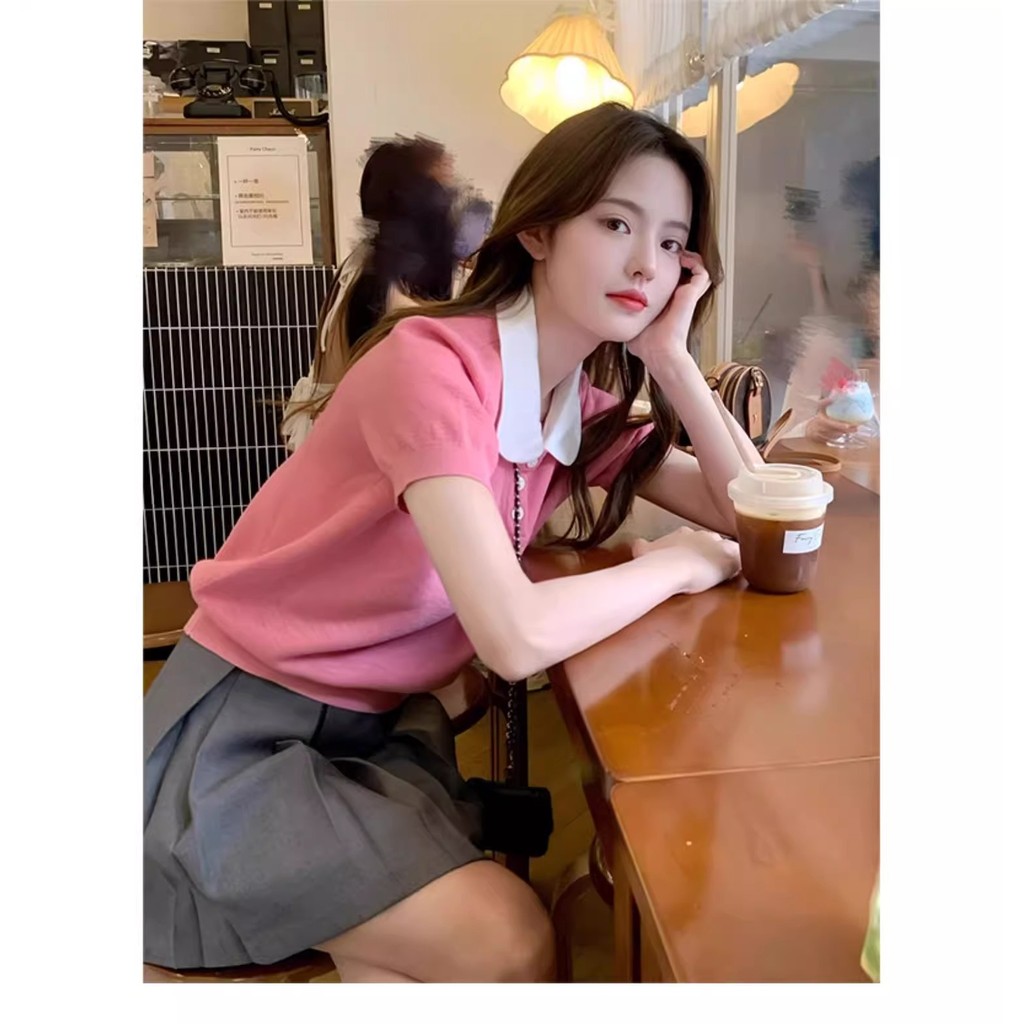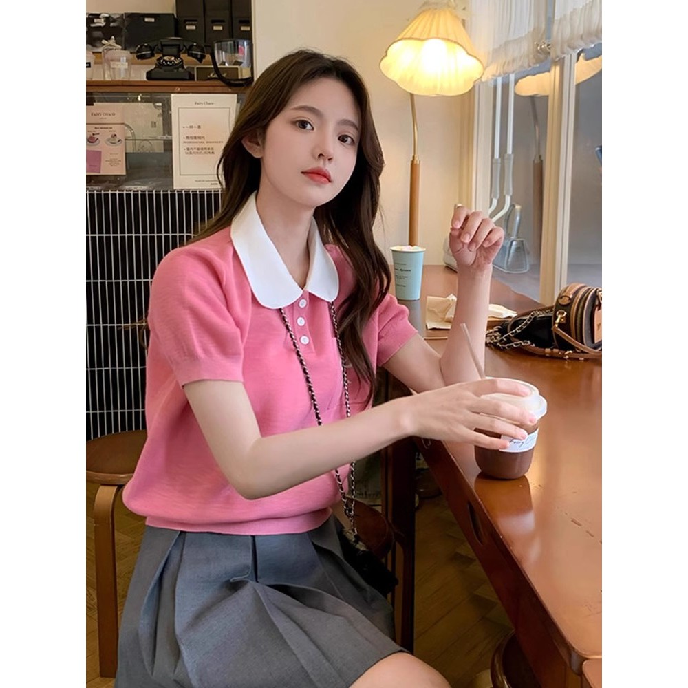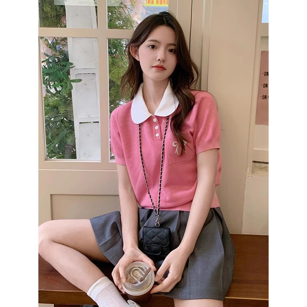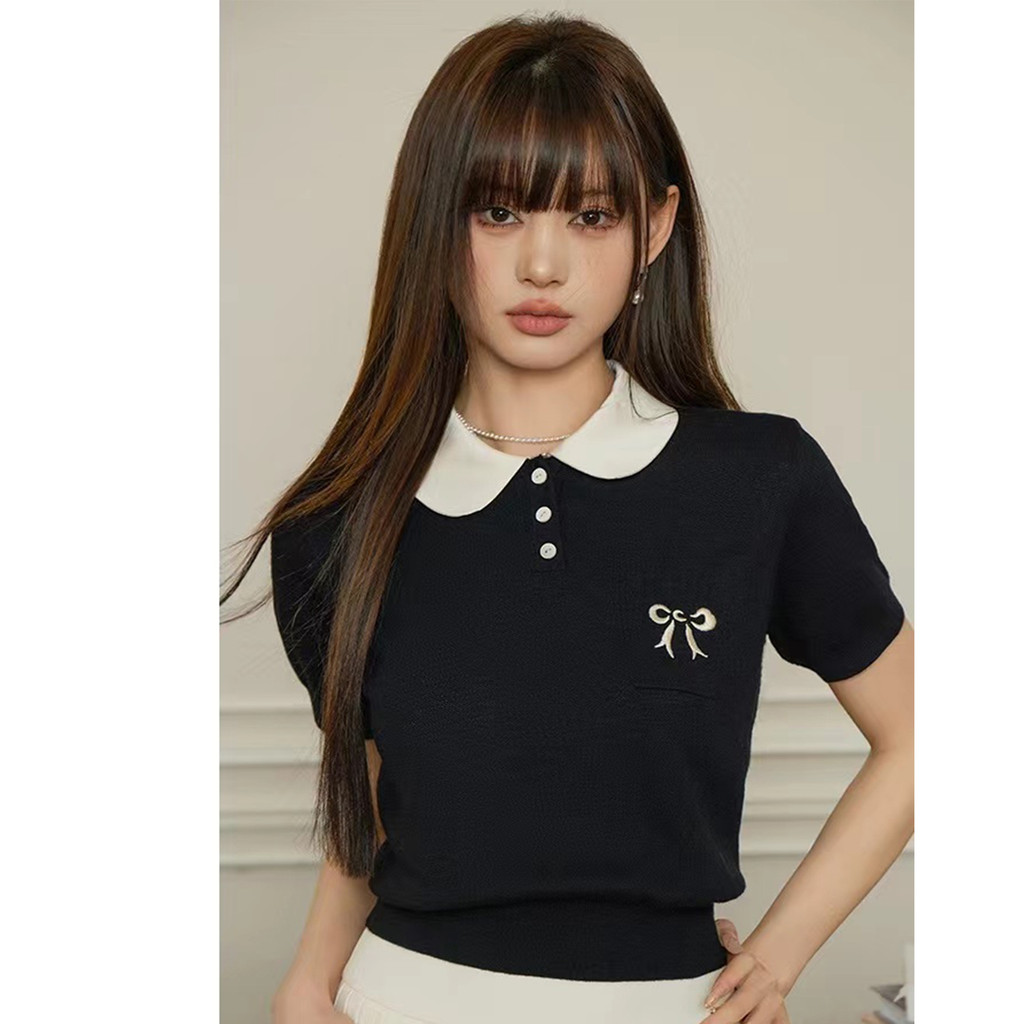 Gakki เสื้อยืดไหมน้ำแข็งคอปกตุ๊กตาปักลายผู้หญิง เสื่อยืดแขนพองไหมพรม ฟรีไซส์ พร้อมส่ง รุ่น 59037#