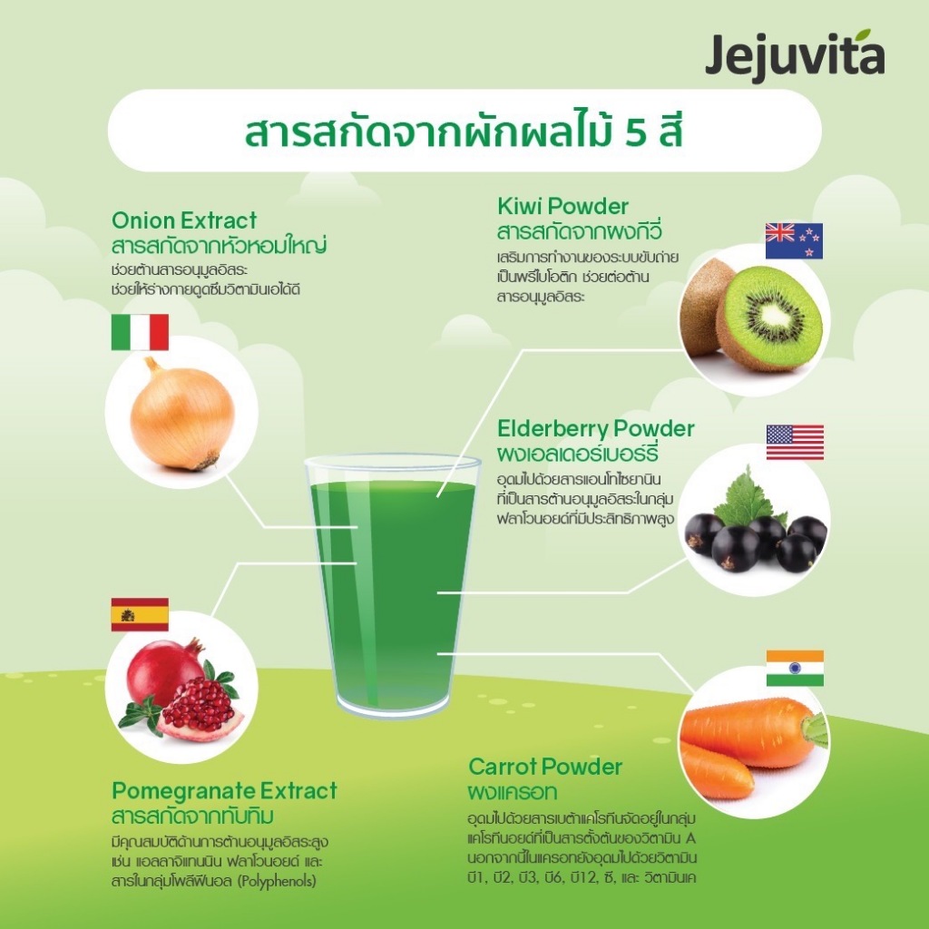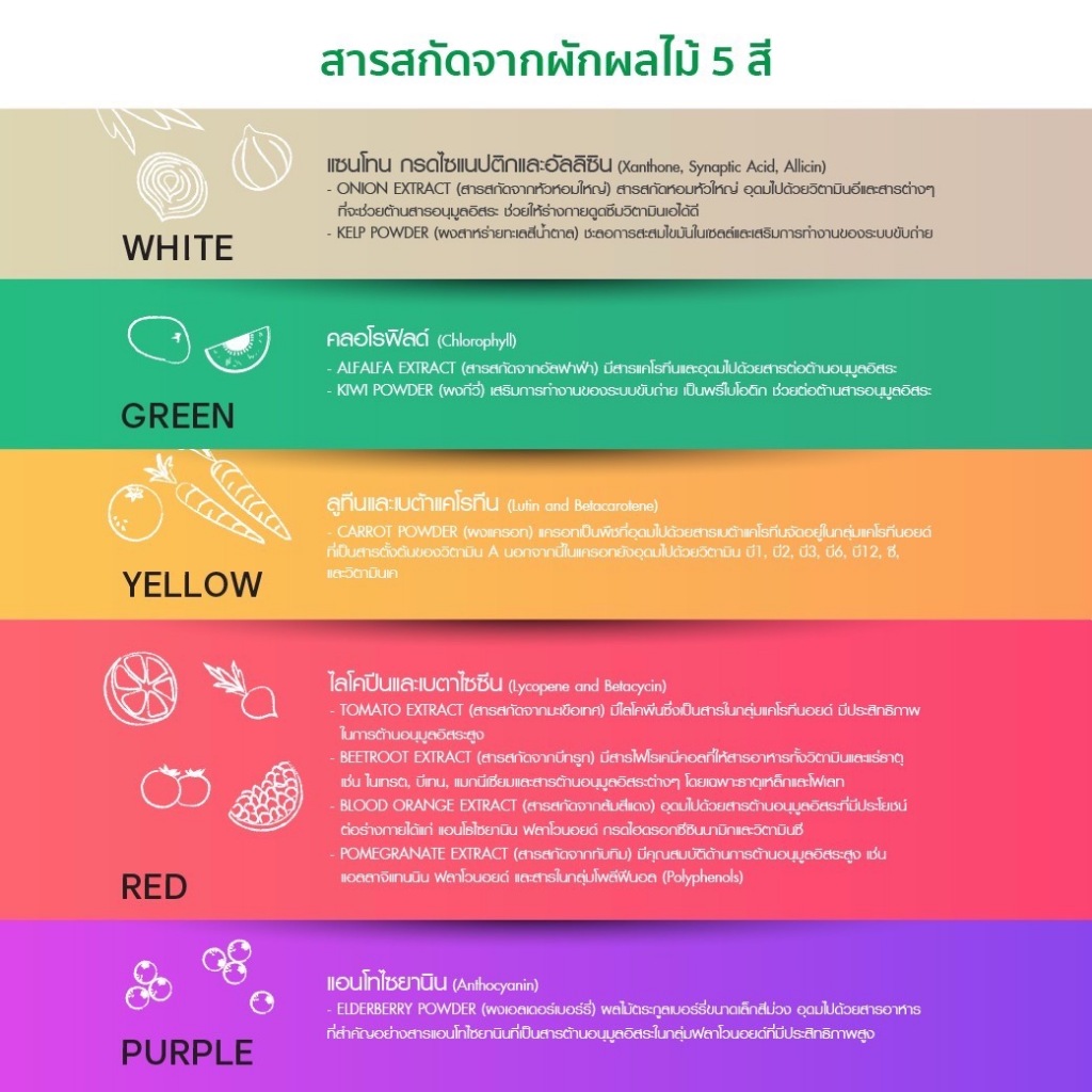 อุดมไปด้วยสารสกัดที่มีประโยชน์ต่อร่างกายจากผักและผลไม้ 5 สี ที่มีใยอาหารมากกว่า 400 กรัม ผสานไปด้วย คลอโรฟิลด์ (Chlorophyll) จากผักและผลไม้สีเขียว ลูทีนและเบต้าแคโรทีน (Lutin and Betacarotene) จากผักและผลไม้สีเหลือง แอนโทไซยานิน (Anthocyanin) จากผักและ