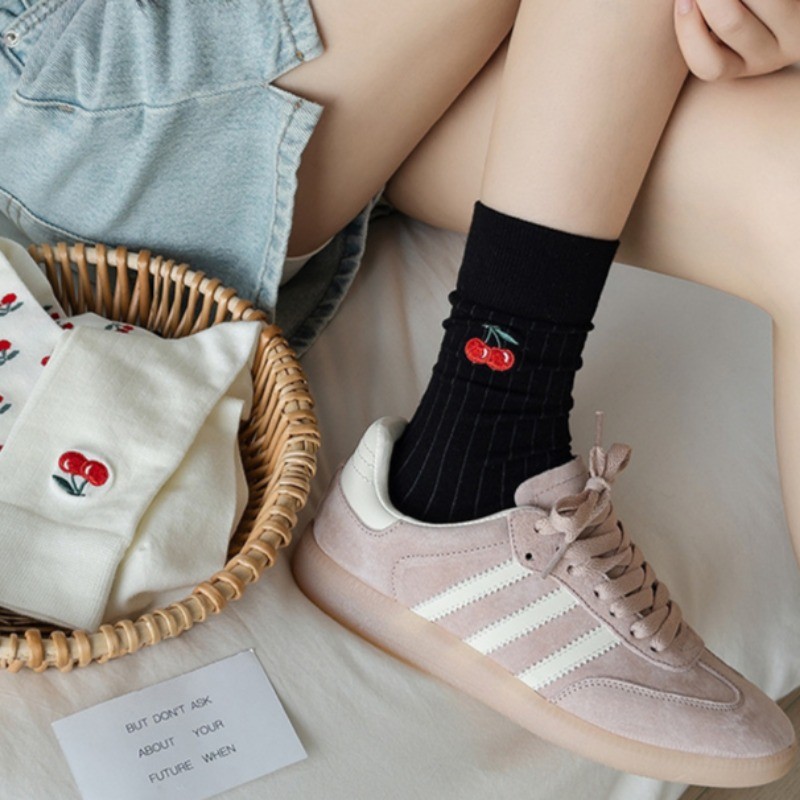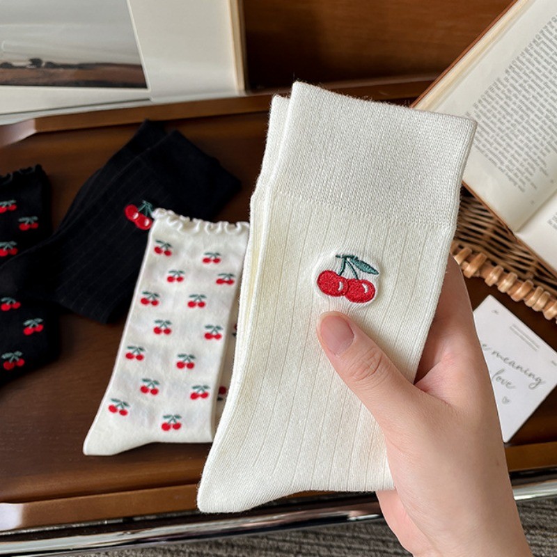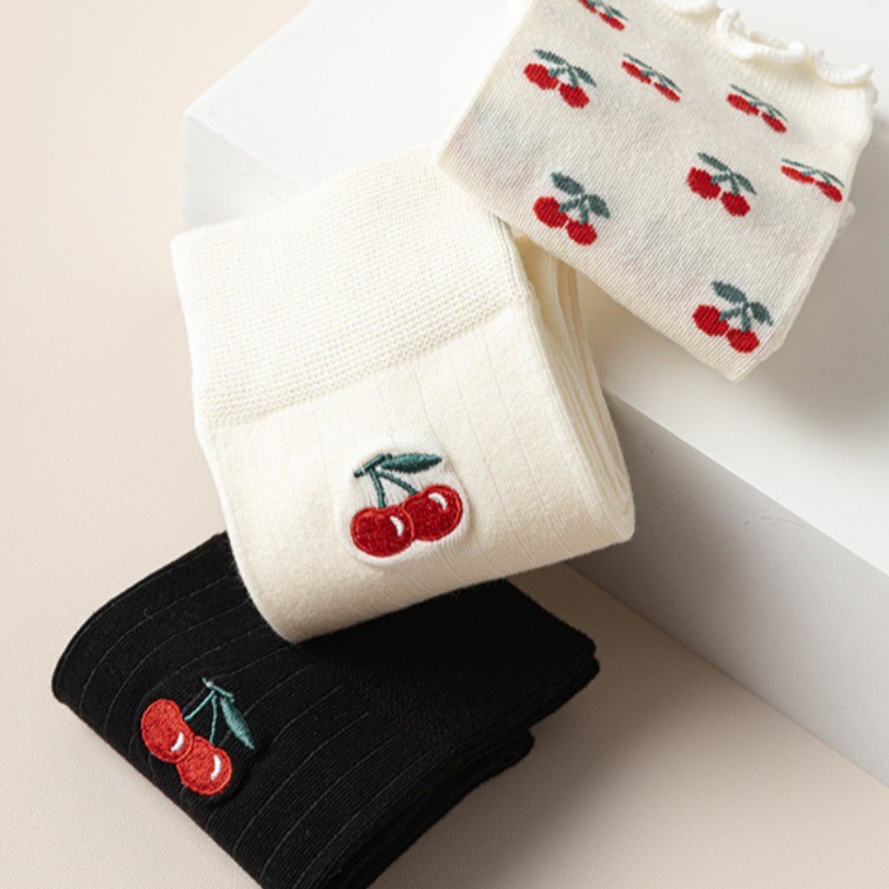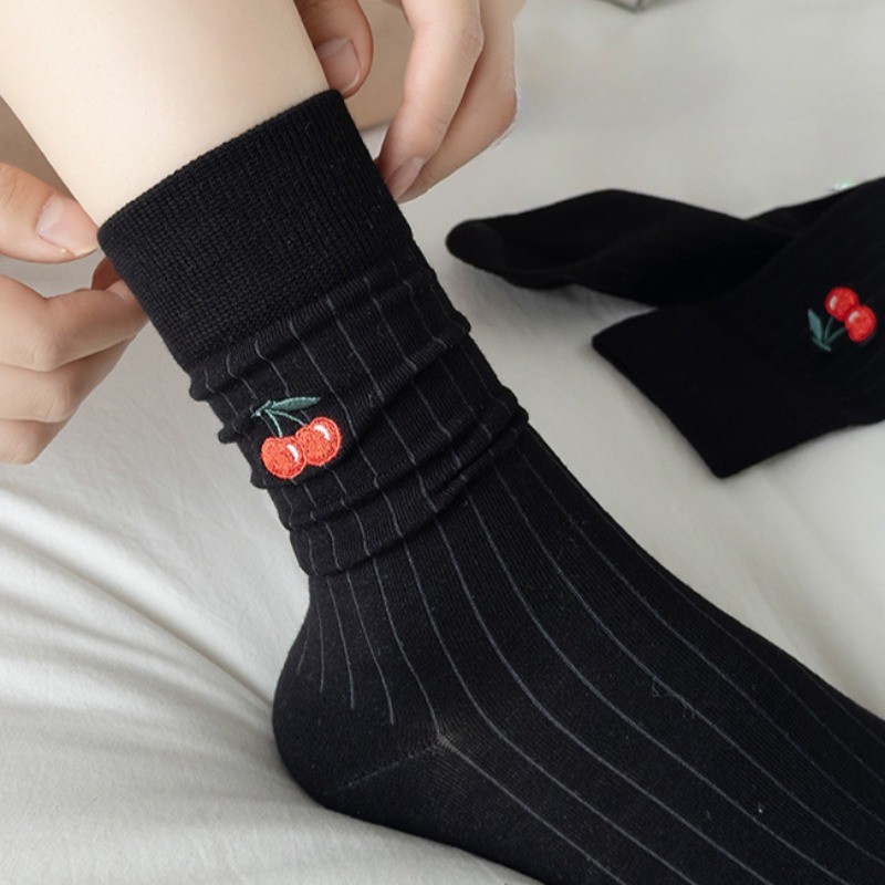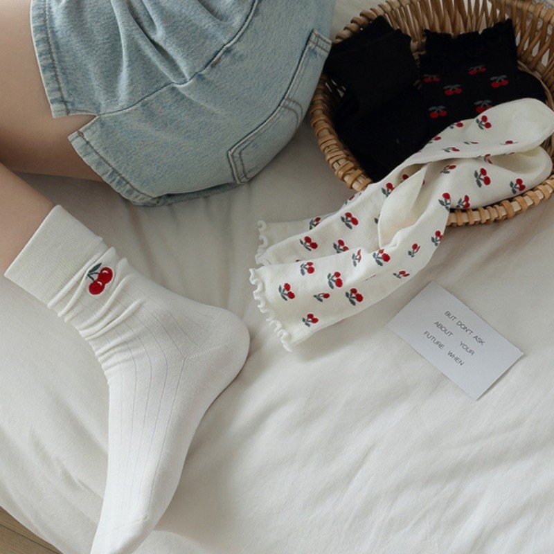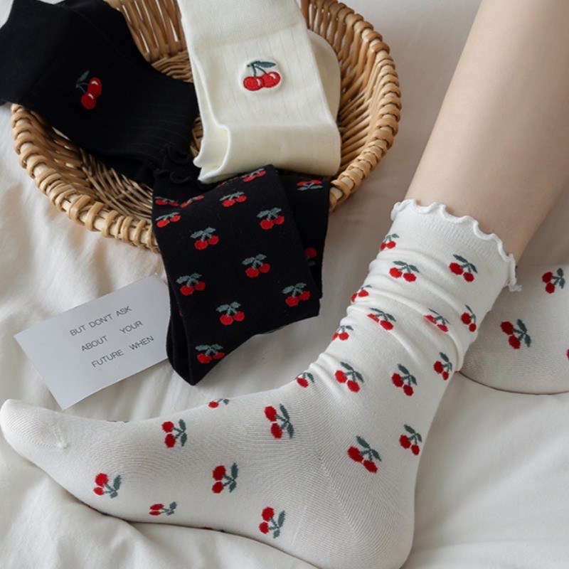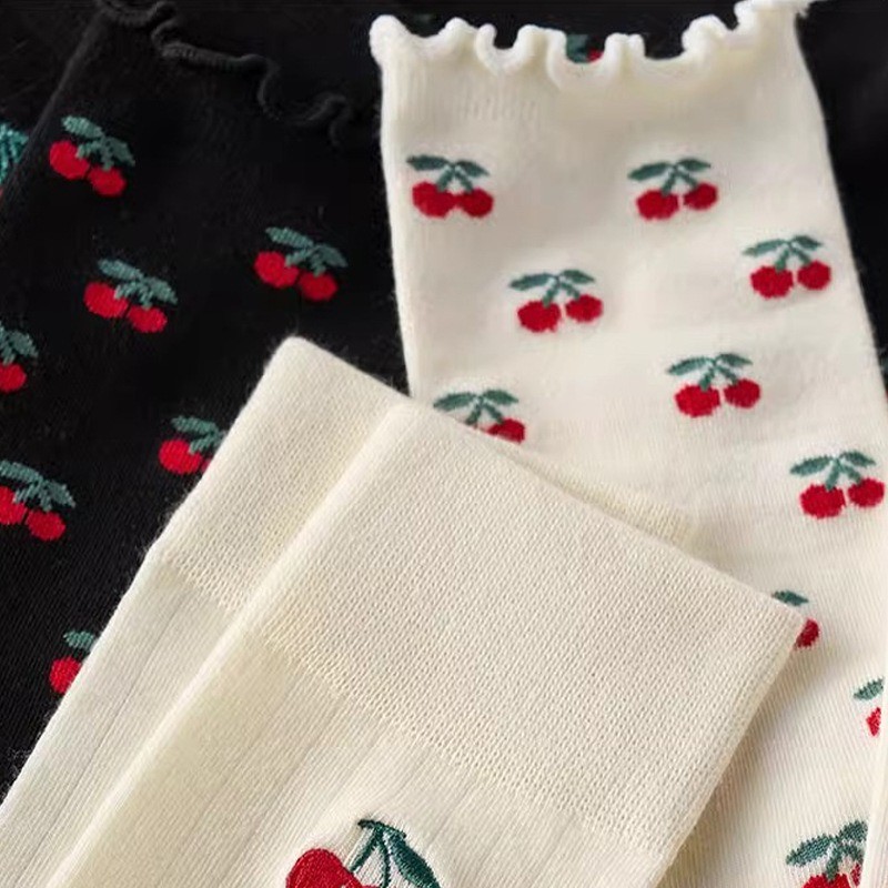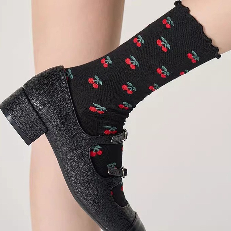 ญี่ปุ่น Lolita บัลเล่ต์สไตล์น่ารักเชอร์รี่พิมพ์ Frilly Ruffle Pile ถุงเท้าผู้หญิงสาวหวานแฟชั่นผ้าฝ้ายนุ่ม Breathable สบายถุงเท้ากลางหลอด